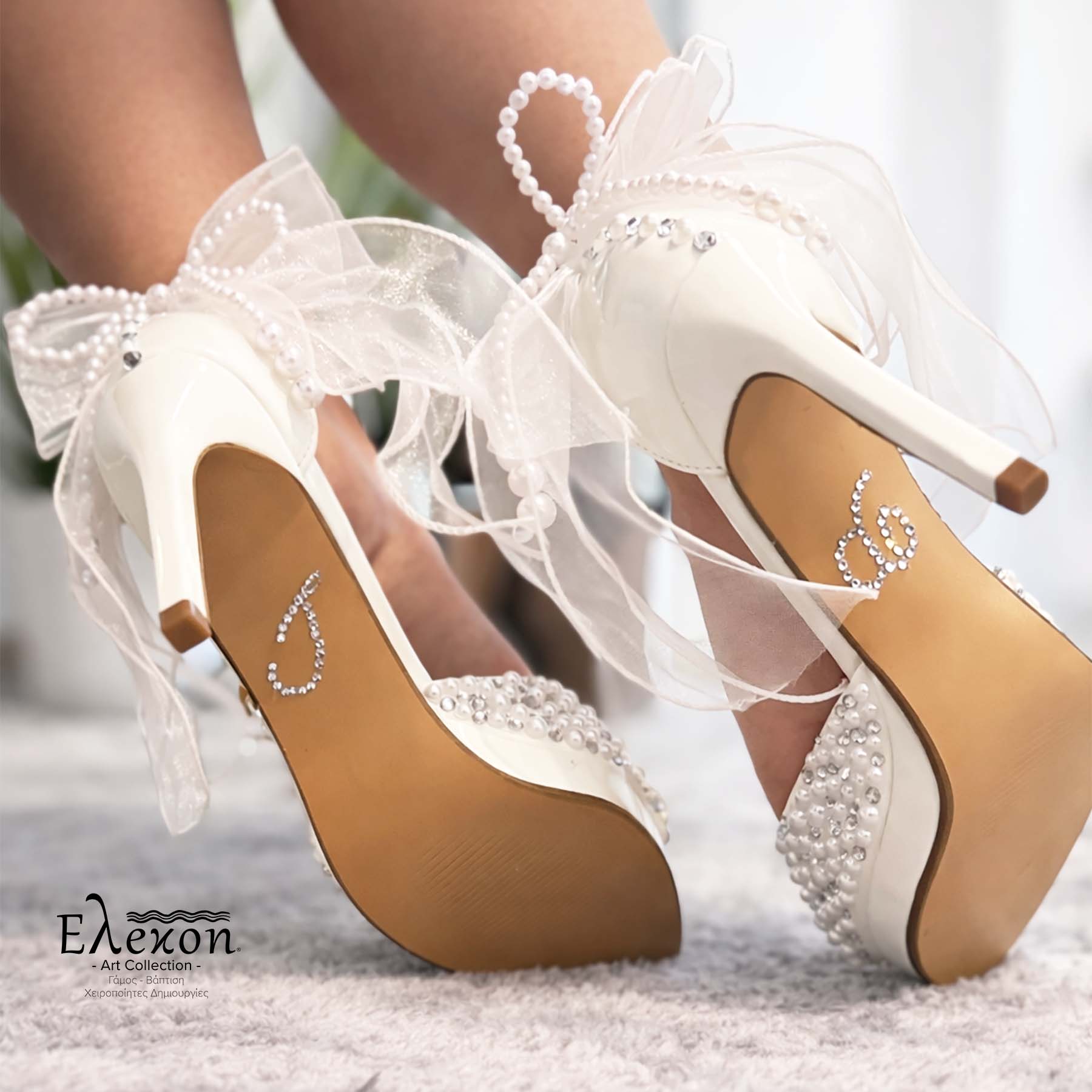 Το λεπτό τακούνι προσφέρει θηλυκότητα και κομψή σιλουέτα, ενώ το λουράκι στον αστράγαλο εξασφαλίζει σταθερότητα και άνεση στο περπάτημα. Η εντυπωσιακή διακόσμηση στο πίσω μέρος με φιόγκο από οργάντζα, πέρλες και διακριτικά στρας χαρίζει μια ρομαντική και παραμυθένια πινελιά, ιδανική για νυφική εμφάνιση.