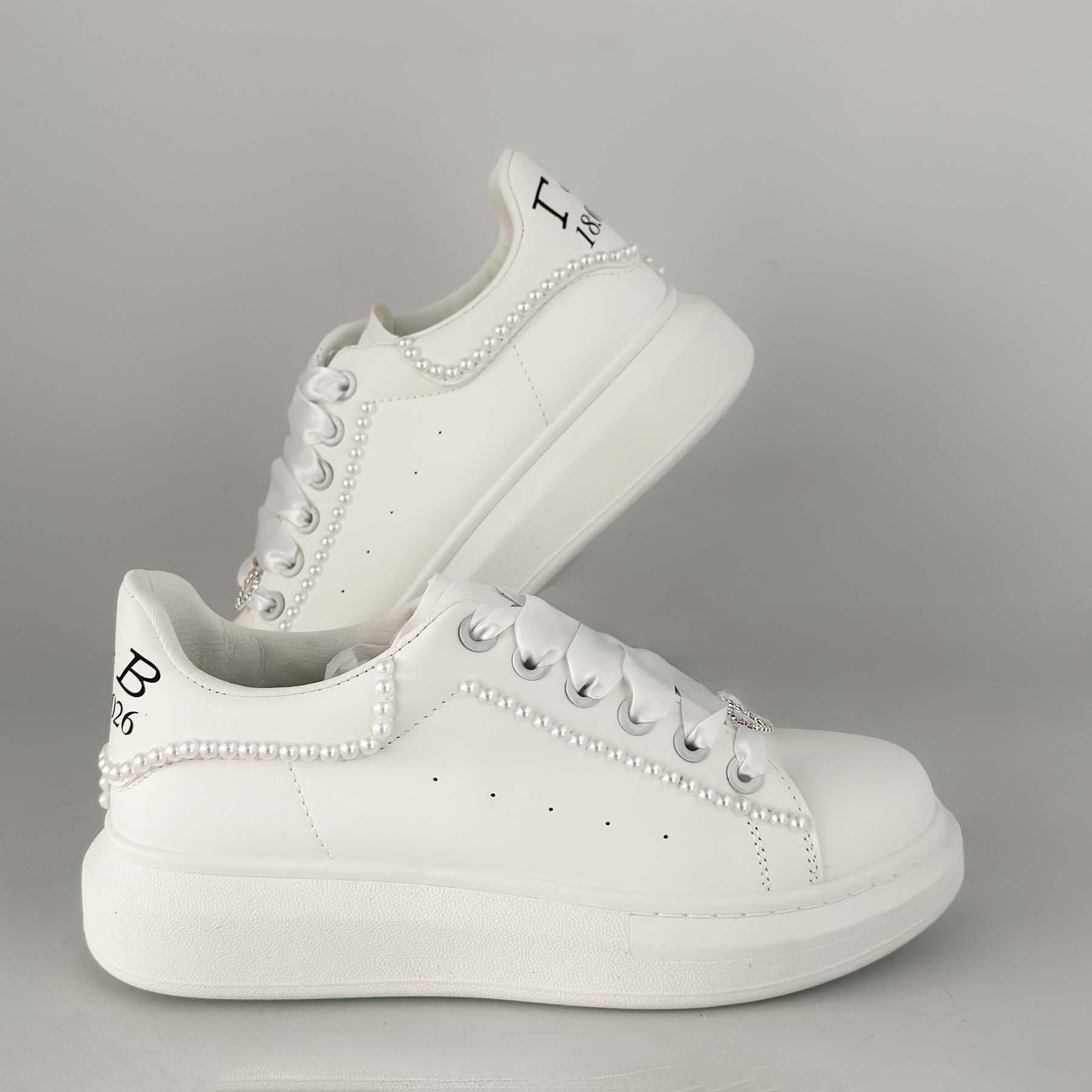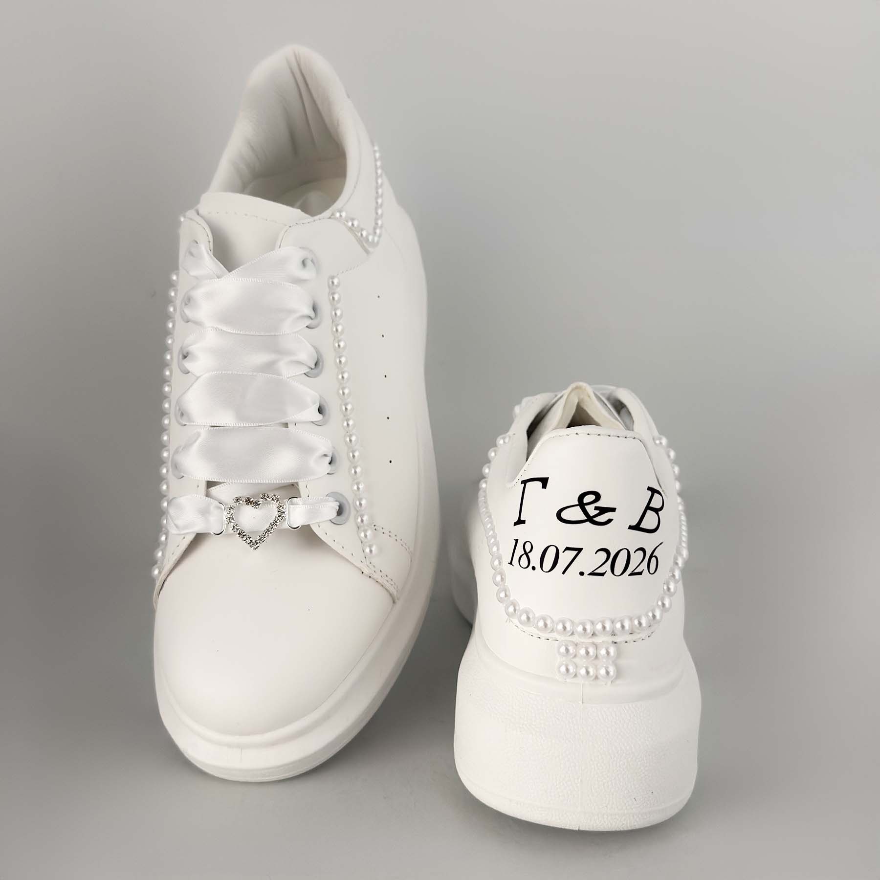 Κομψό, άνετο και απόλυτα νυφικό, αυτό το bridal sneaker είναι η ιδανική επιλογή για τη νύφη που θέλει στυλ χωρίς συμβιβασμούς. Σε λευκό χρώμα, διακοσμημένο με πέρλες περιμετρικά και σατέν κορδόνια  αντί για κλασικά , χαρίζει ρομαντική αισθητική και μοναδική λάμψη. Η καρδιά-κόσμημα στο μπροστινό μέρος προσθέτει μια διακριτική πινελιά πολυτέλειας, ενώ το statement μήνυμα “ημερομηνία & μονογράμματα” στο πίσω μέρος το κάνει ξεχωριστό και απόλυτα προσωπικό.