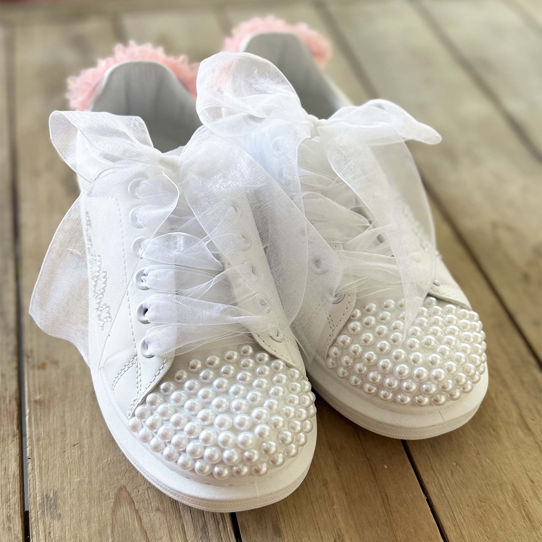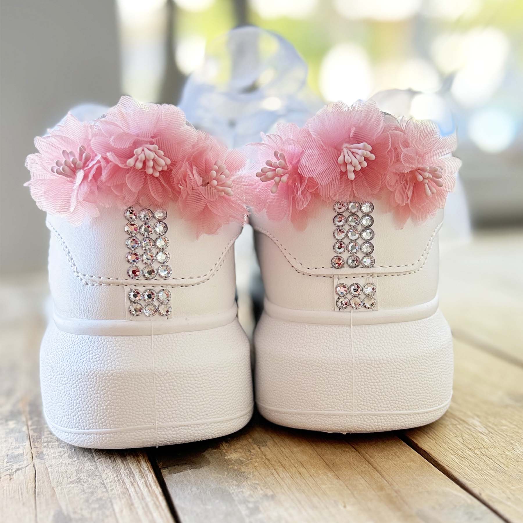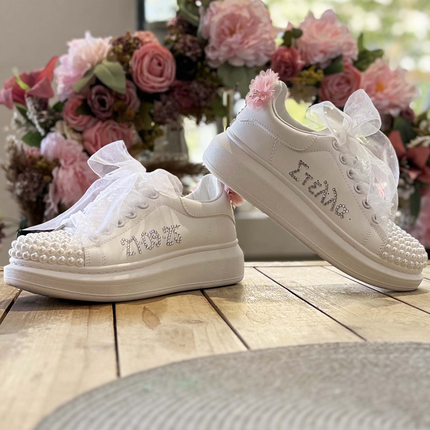 Κάντε τη μέρα της βάπτισης ακόμα πιο ξεχωριστή με αυτά τα μοναδικά sneakers! Διακοσμημένα με ασημένια στρας που σχηματίζουν το όνομα και την ημερομηνία της βάπτισης, λευκές πέρλες στο μπροστά μέρος και ασημένια στρας και dusty pink λουλουδάκια στο πίσω μέρος , αυτά τα παπούτσια συνδυάζουν στυλ και προσωπικότητα. Η Τα λευκά κορδόνια από οργάντζα ολοκληρώνουν την εμφάνιση με ρομαντισμό και φινέτσα.