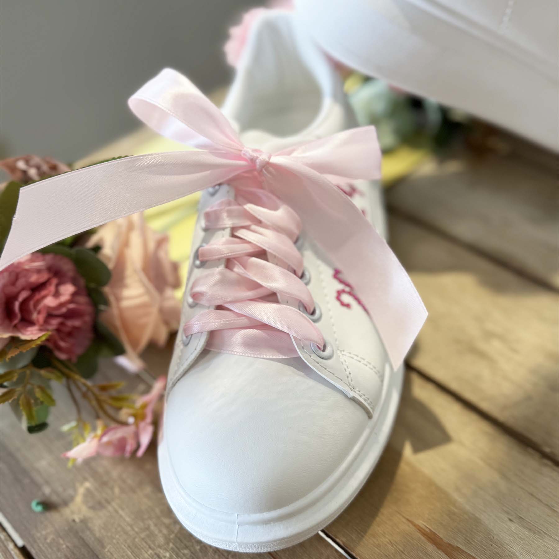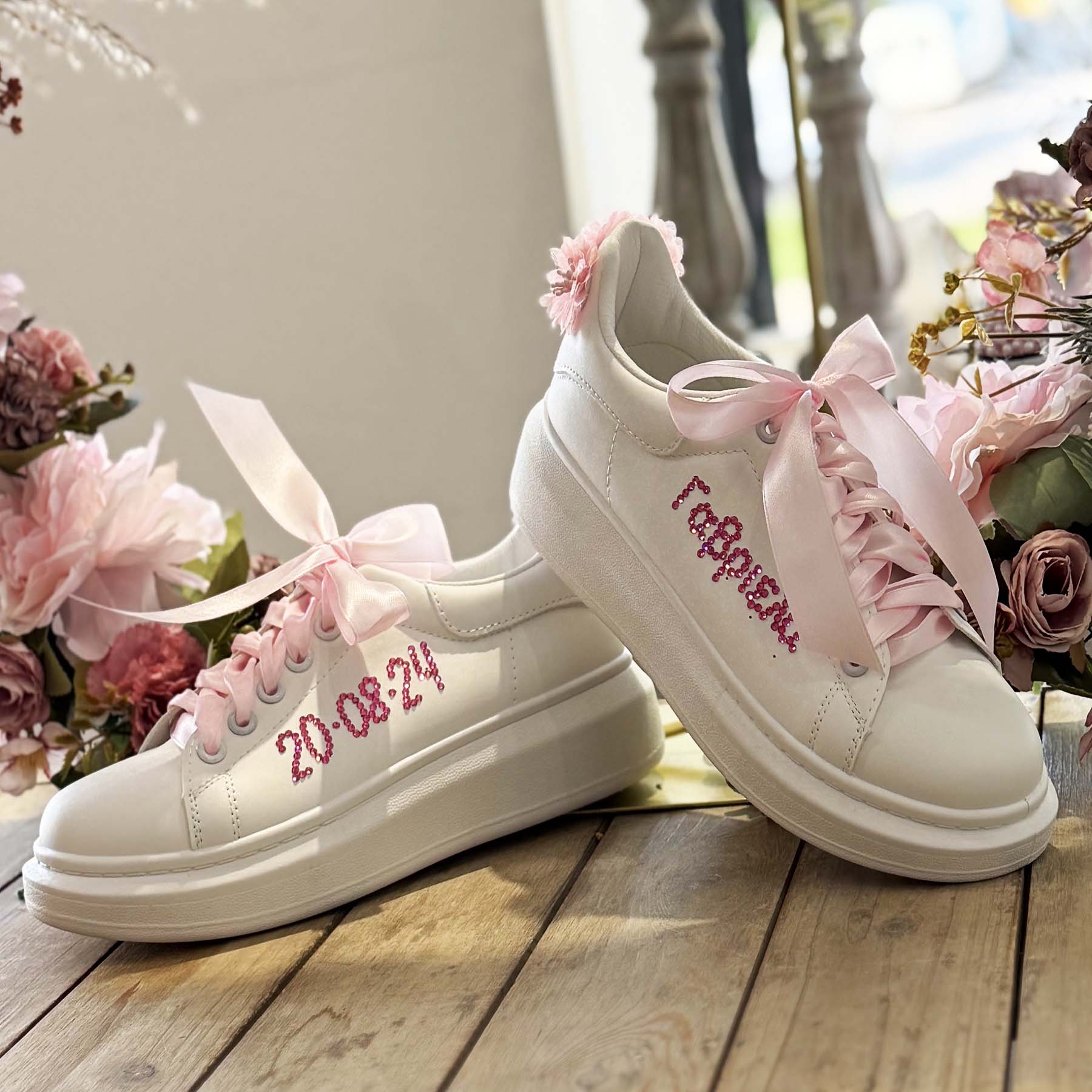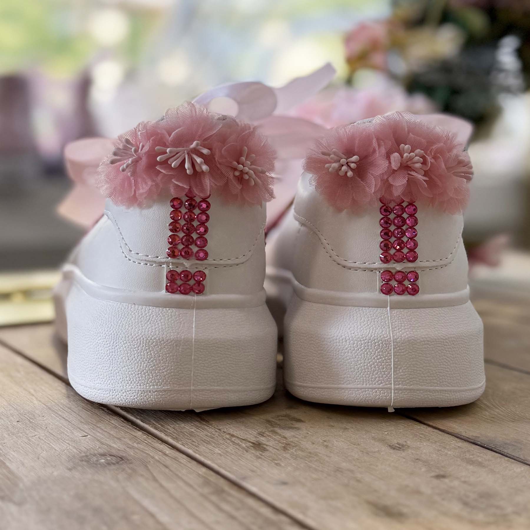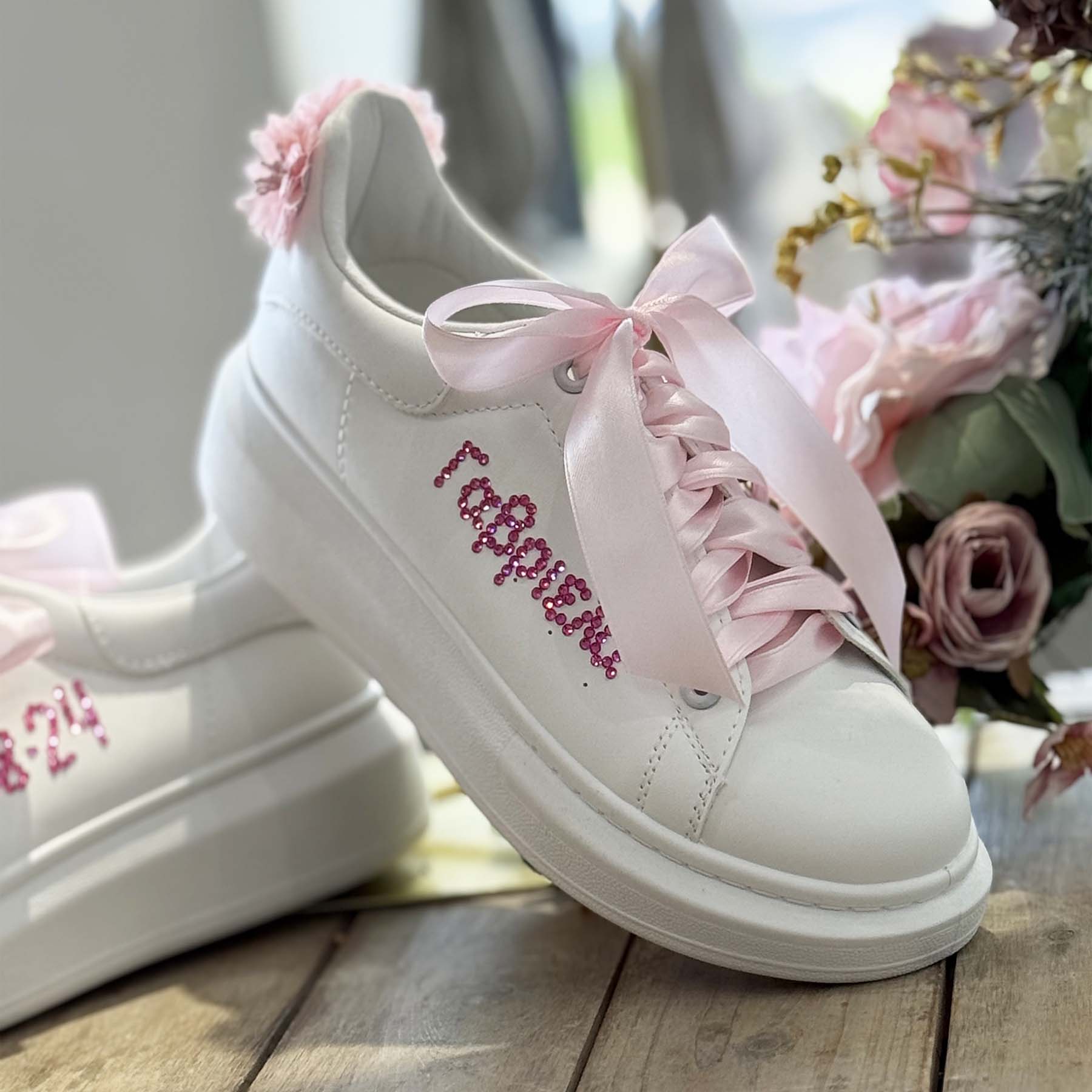 Κάντε τη μέρα της βάπτισης ακόμα πιο ξεχωριστή με αυτά τα μοναδικά sneakers! Διακοσμημένα με φουξ στρας που σχηματίζουν το όνομα και την ημερομηνία της βάπτισης, και φουξ στρας και dusty pink λουλουδάκια στο πίσω μέρος , αυτά τα παπούτσια συνδυάζουν στυλ και προσωπικότητα. Συνοδεύονται από ροζ σατέν κορδόνια