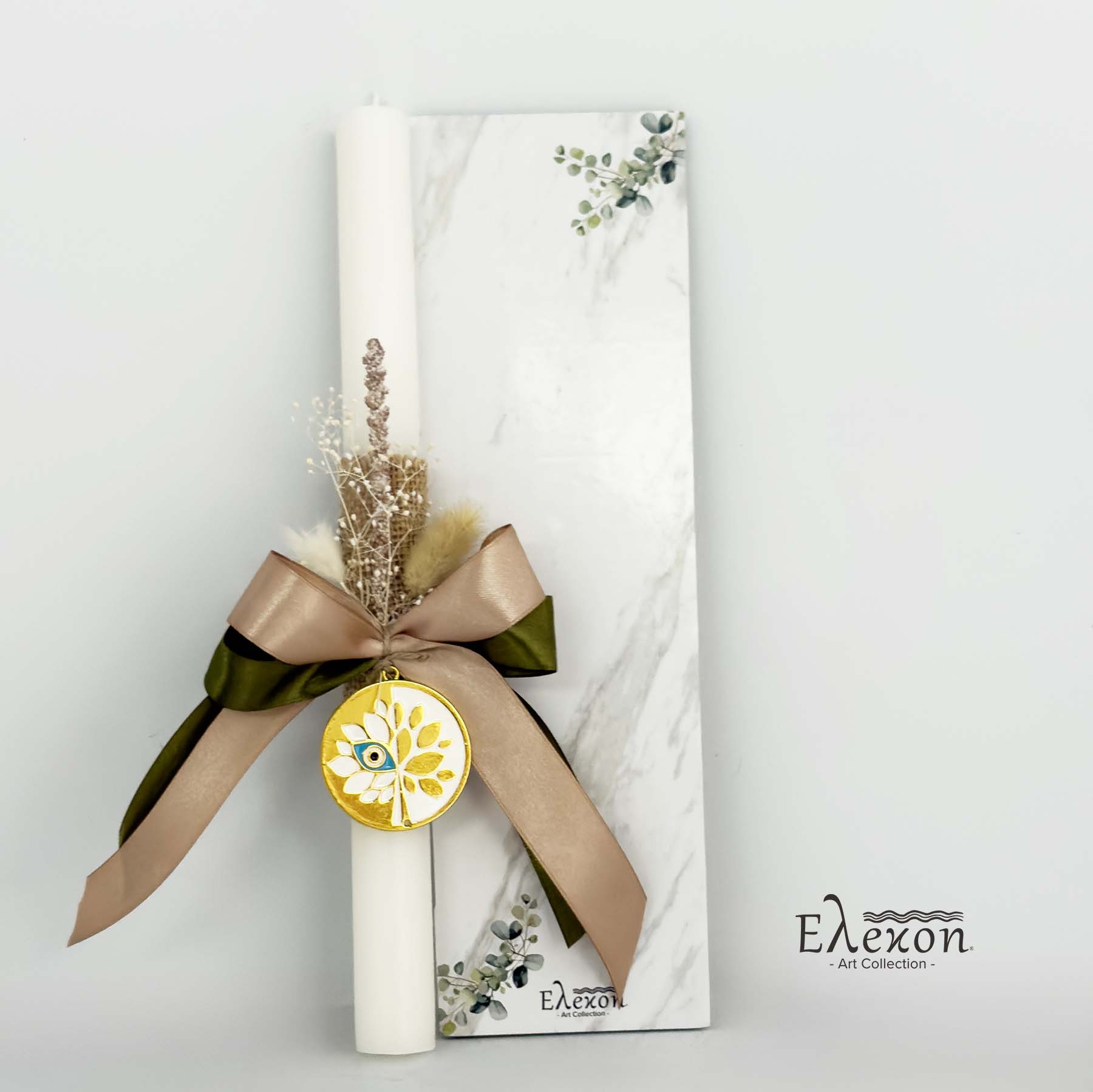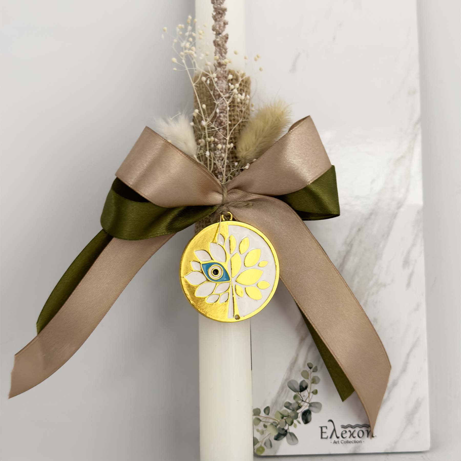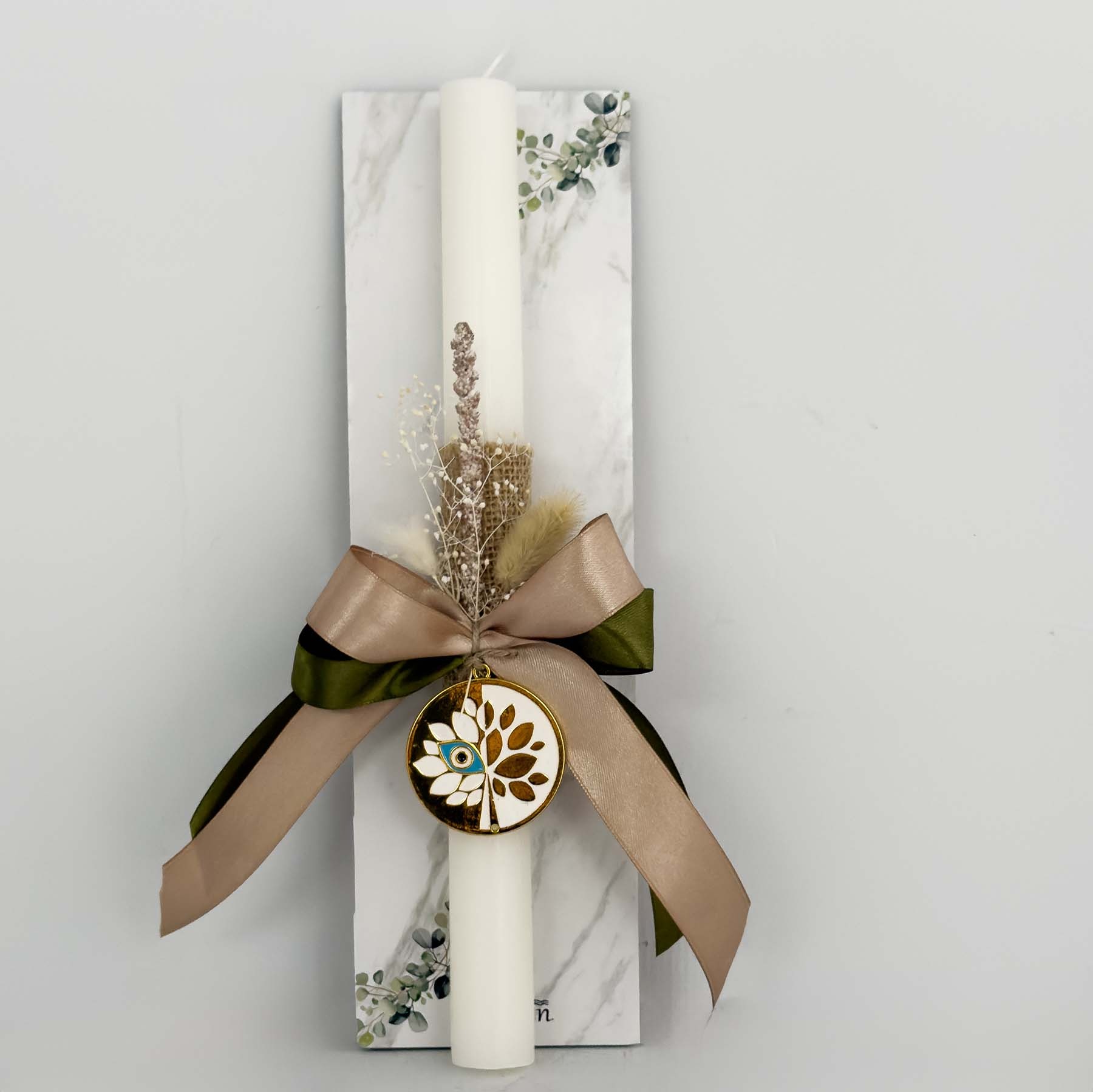 Πασχαλινή λαμπάδα χρώματος λευκή διακοσμημένη με κορδέλες κυπαρισσί-μπεζ, αποξηραμένα άνθη και χρυσό γούρι δέντρο της ζωής & μάτι