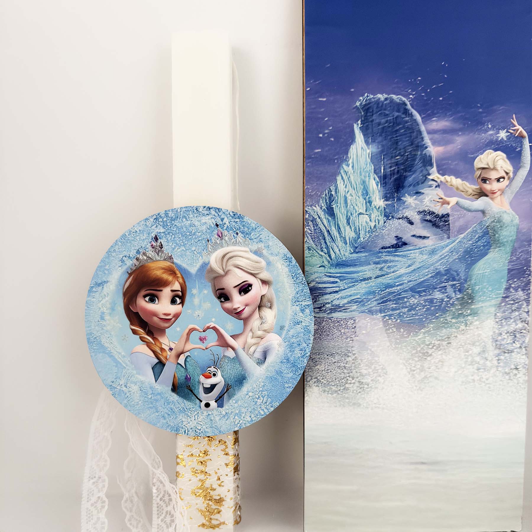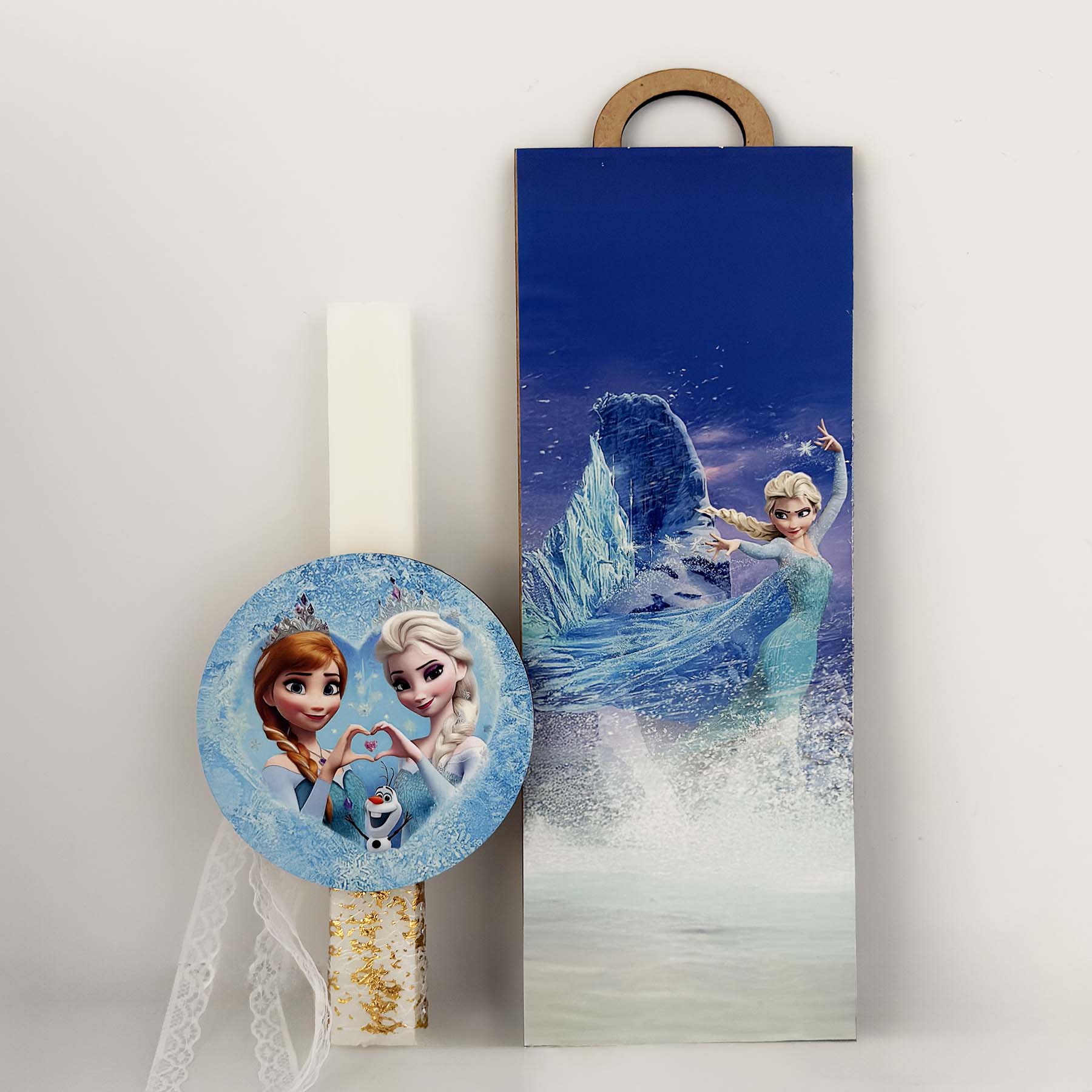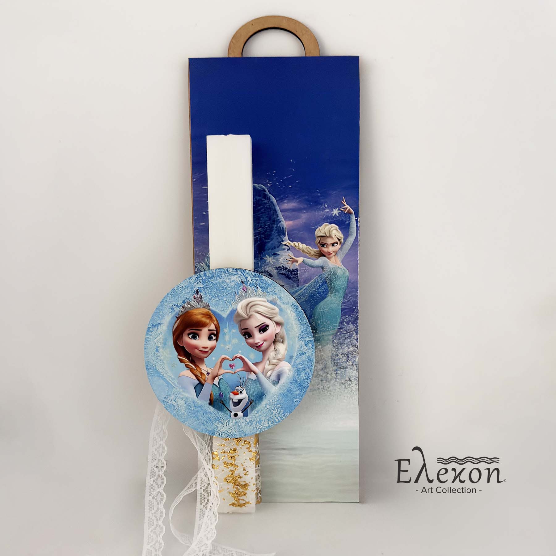 Πασχαλινή λαμπάδα χρώματος λευκή διακοσμημένη με ξύλινο καδράκι Elsa & Anna