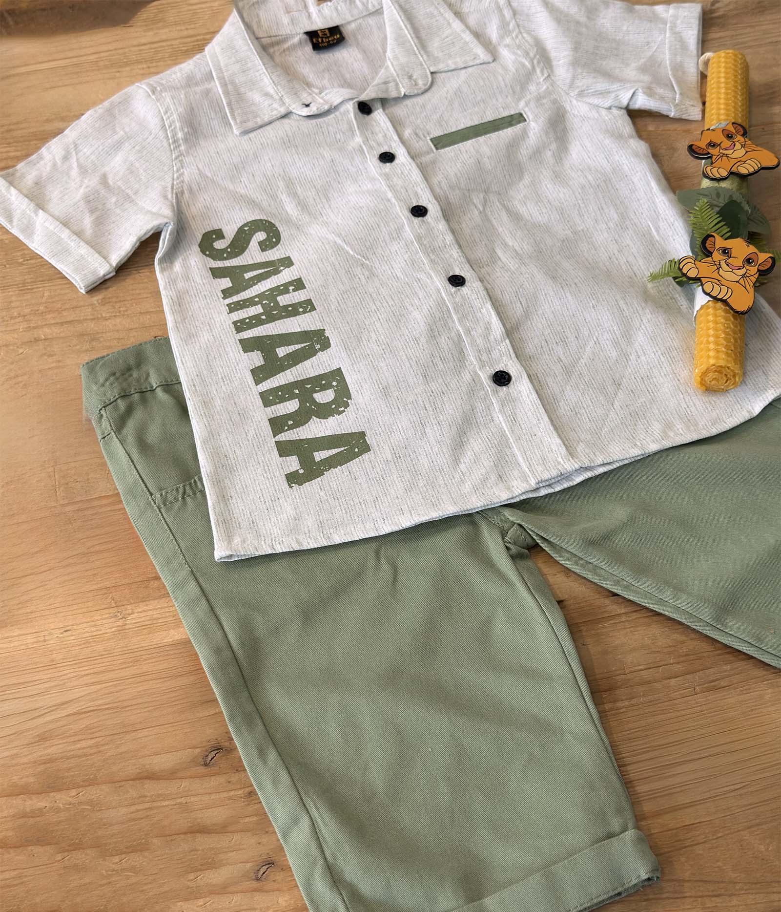 Εντυπωσιακό πασχαλινό σετ αγοριού σε μοντέρνο safari ύφος, ιδανικό για κομψές εμφανίσεις την περίοδο του Πάσχα αλλά και για όλο το καλοκαίρι. Το σετ περιλαμβάνει κοντομάνικο πουκάμισο σε ανοιχτή γκρι απόχρωση με διακοσμητικές λεπτομέρειες και τύπωμα “SAHARA”, καθώς και ασορτί βαμβακερή βερμούδα σε χακί τόνο για άνεση και στυλ. Συνοδεύεται από χειροποίητη πασχαλινή λαμπάδα με ξύλινα διακοσμητικά 3D φιγούρες Ο Βασιλιάς των Λιονταριών, έτοιμη για δώρο.