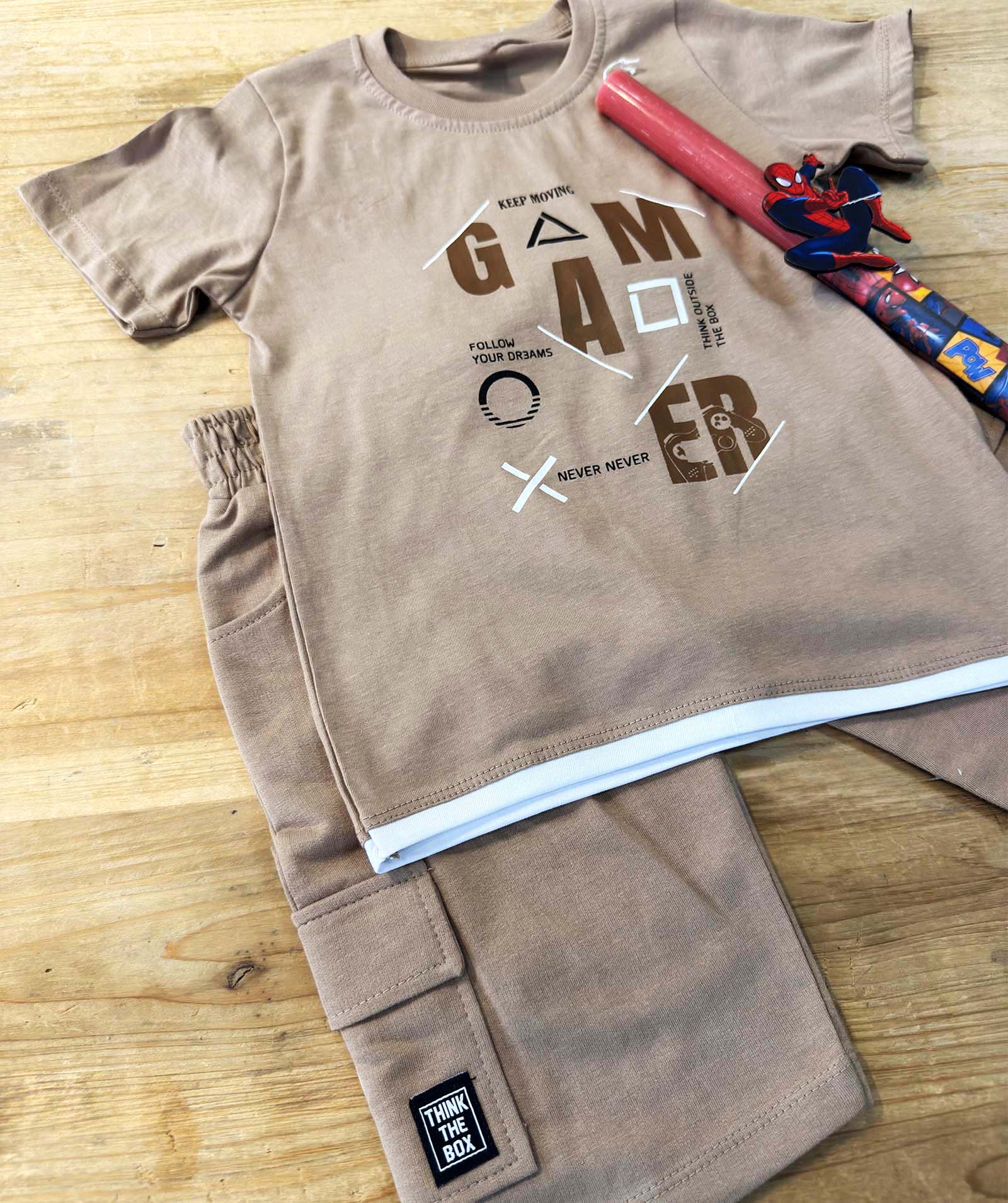 Άνετο και μοντέρνο παιδικό βαμβακερό σετ αγοριού, ιδανικό για τις καθημερινές καλοκαιρινές εμφανίσεις. Το σετ αποτελείται από κοντομάνικη μπλούζα σε μπεζ απόχρωση με τύπωμα “GAMER” και ασορτί βερμούδα με πρακτική πλαϊνή τσέπη.