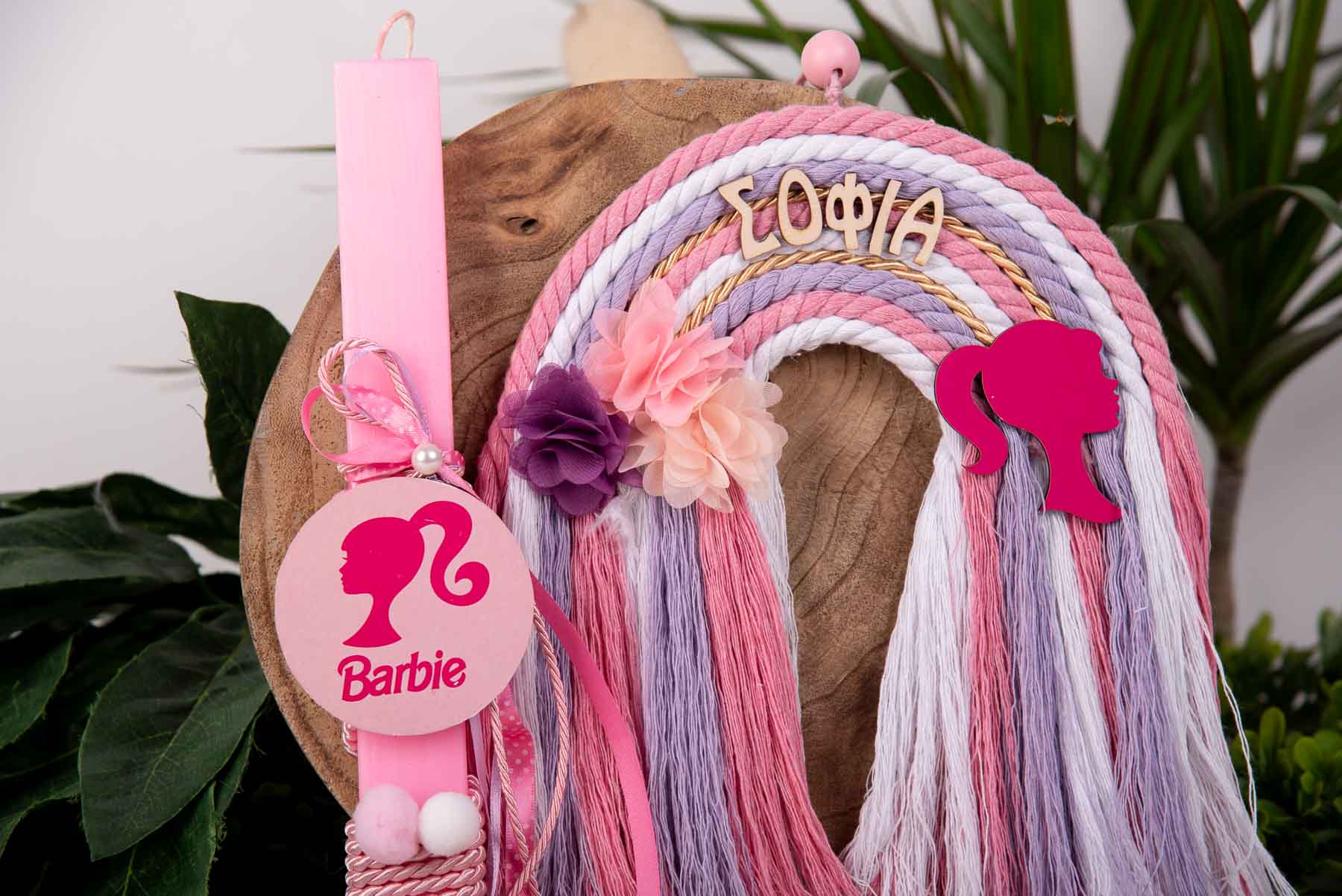 Πασχαλινό σετ για κόριτσι που περιλαμβάνει Πασχαλινή λαμπάδα χρώματος ροζ με ξύλινο καδράκι Barbie και κρεμαστό διακοσμητικό ουράνιο τόξο σε χρωματισμούς ροζ-λευκό-λιλά με το όνομα της επιλογής σας