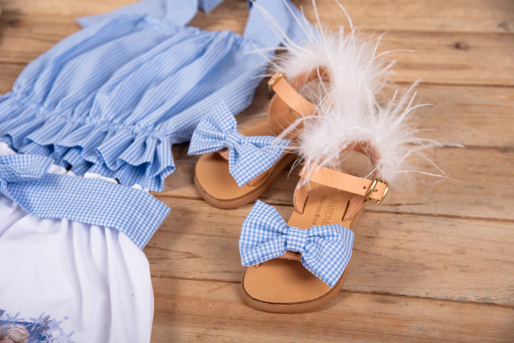 •Χειροποίητα δερμάτινα σανδάλια διακοσμημένα με λευκό πούπουλο και γαλάζιο πουά φιόγκο
