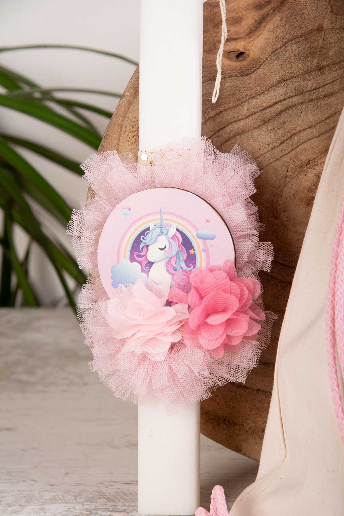•Πασχαλινή λαμπάδα χρώματος λευκή διακοσμημένη με υφασμάτινα λουλουδάκια pon pon μεγάλο ροζ και ξύλινο καδράκι μονόκερο