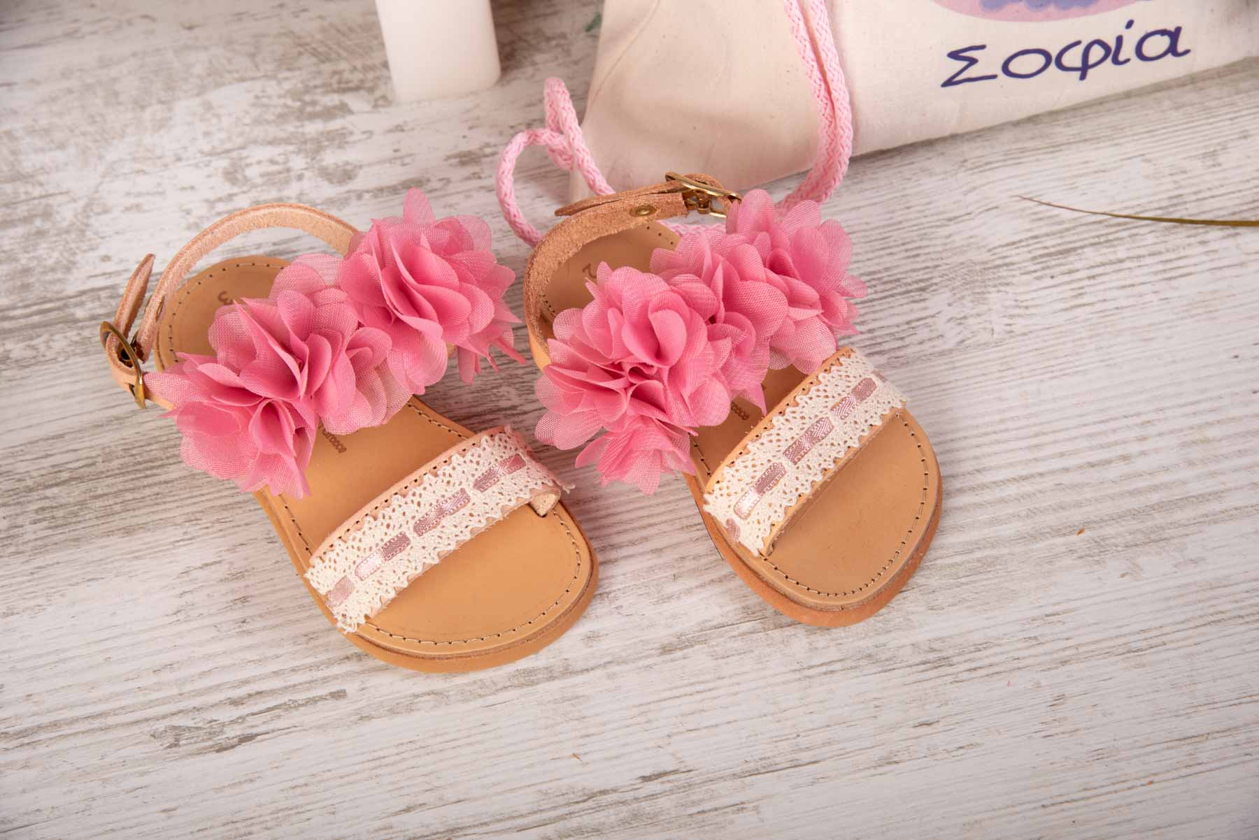 •Χειροποίητα δερμάτινα σανδάλια διακοσμημένα με dusty pink λουλούδια στο πάνω μέρος και δαντέλα εκρού με dusty pink λεπτομέρεια στο κέντρο