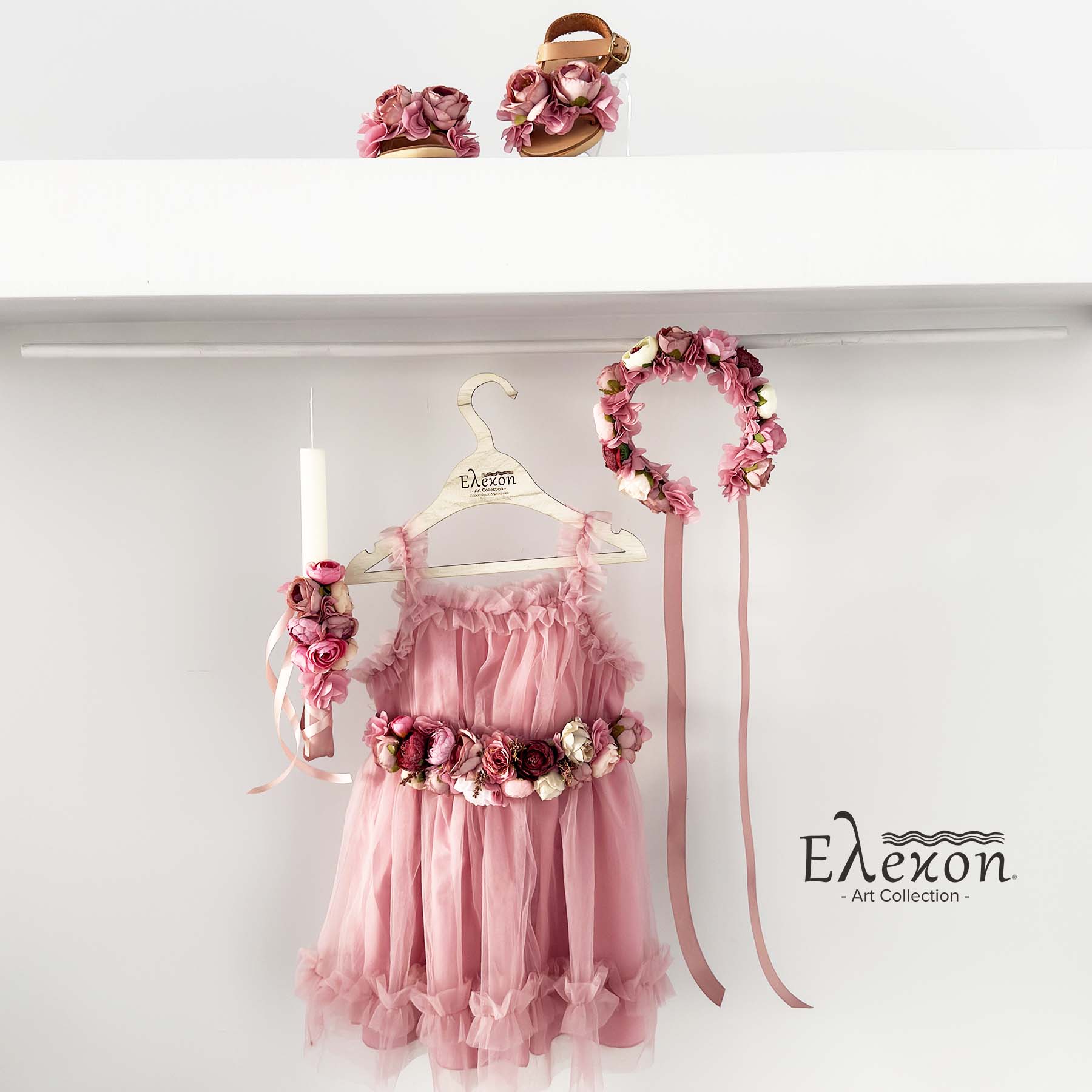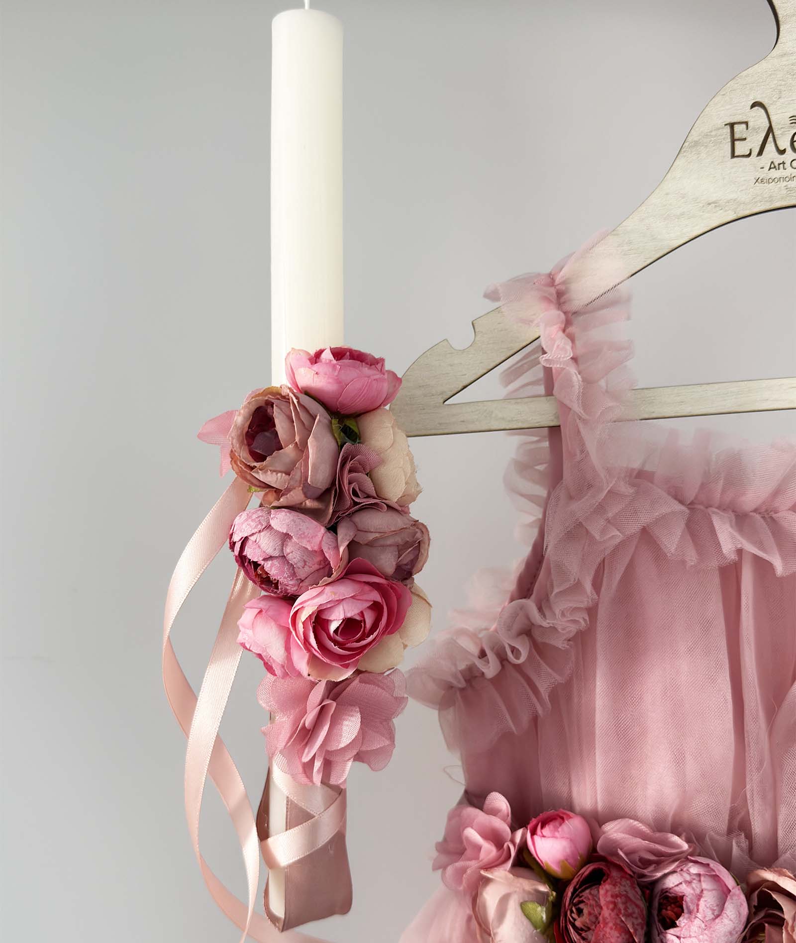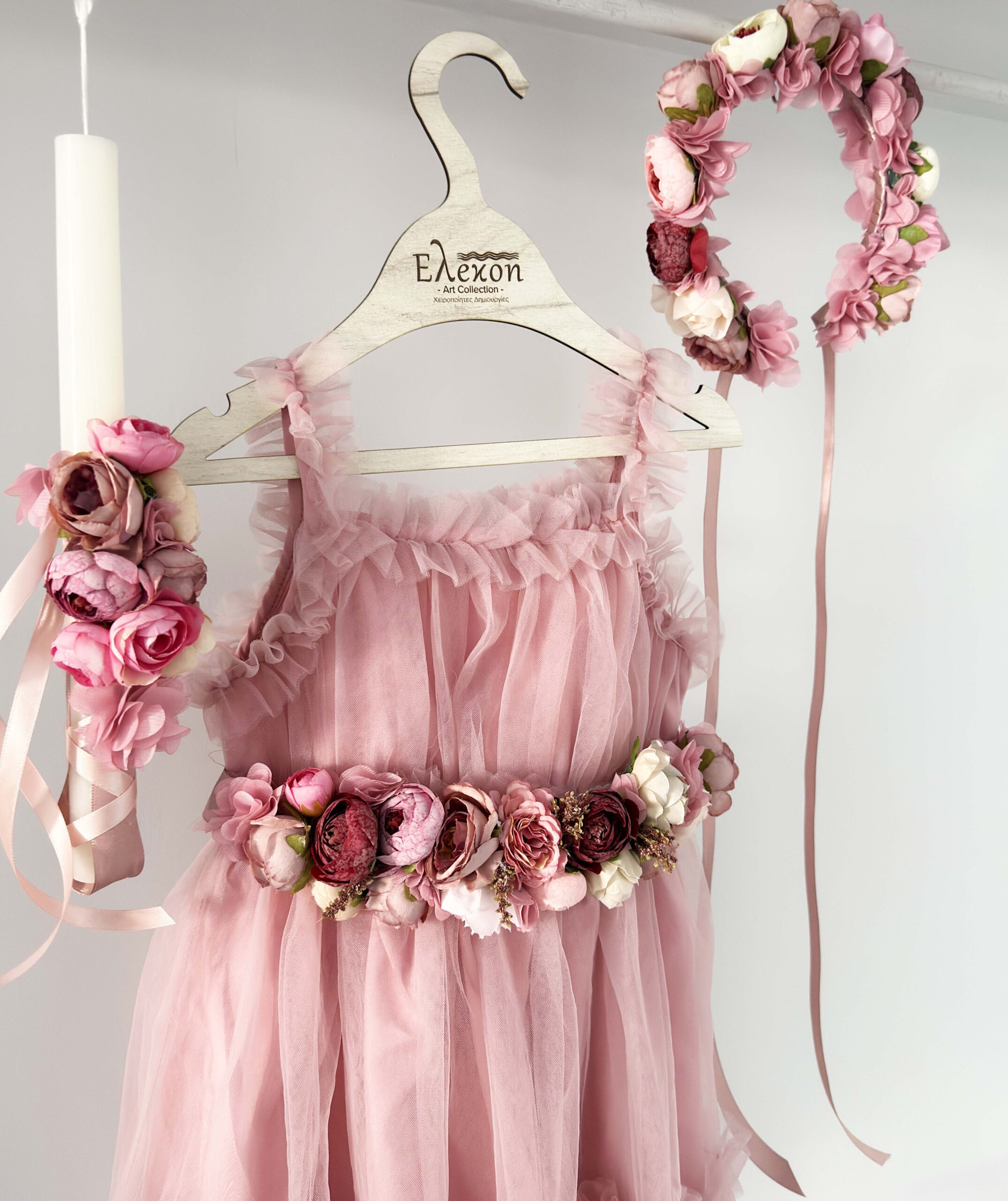 •Τούλινο φόρεμα χρώματος dusty pink με χειροποίητη ζώνη διακοσμημένη με λουλούδια