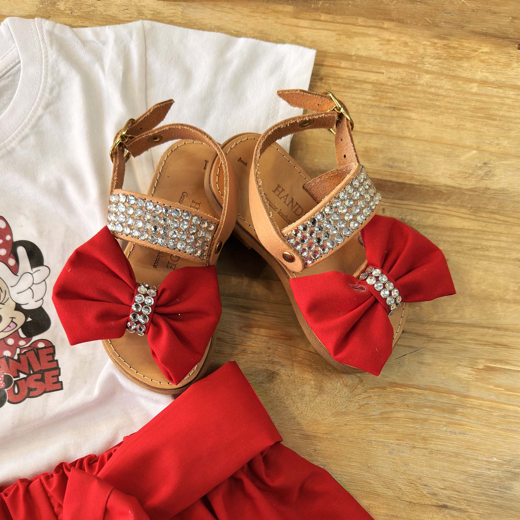 Χειροποίητα  δερμάτινα σανδάλια  διακοσμημένα με στρας και μεγάλο κόκκινο φιόγκο