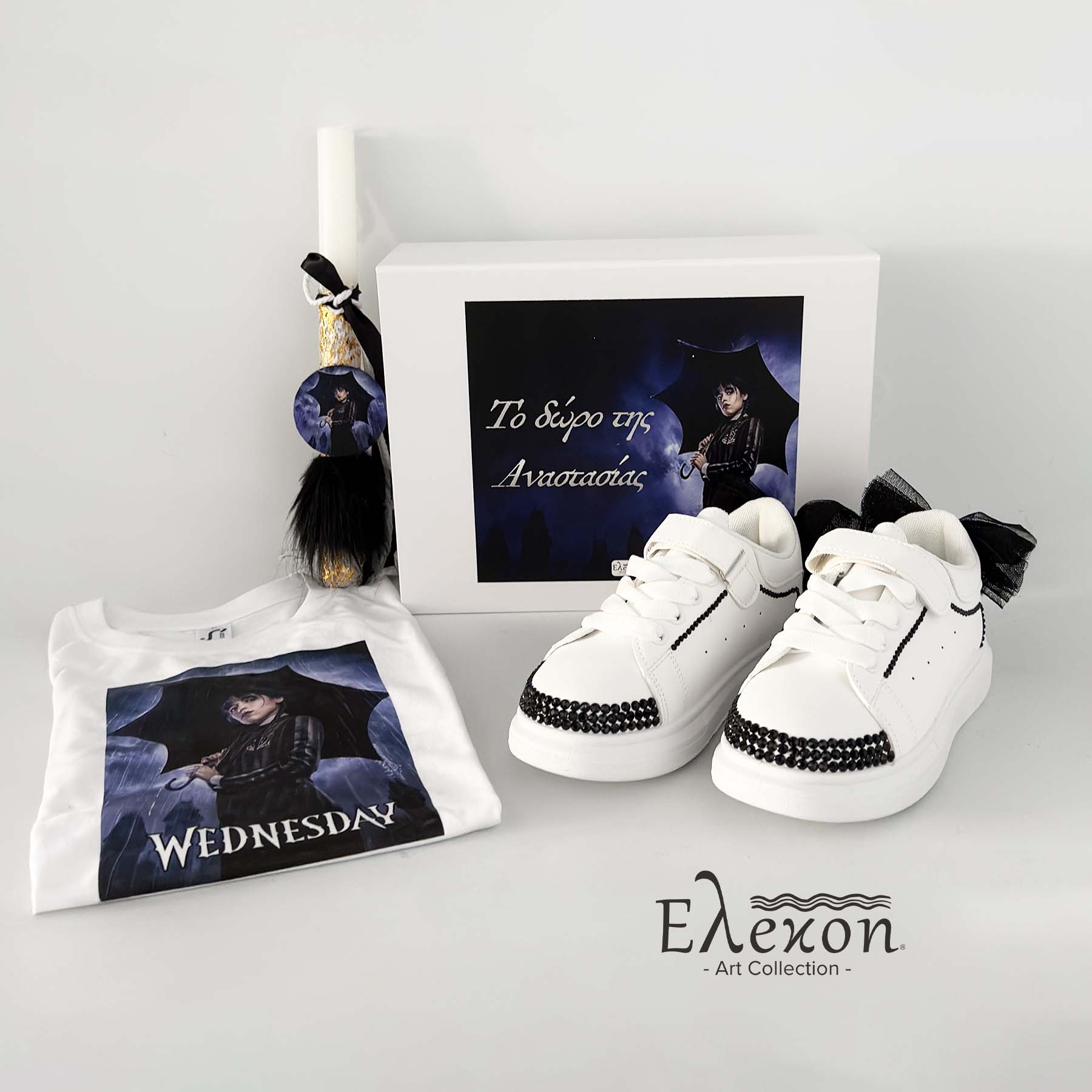 Συμπεριλαμβάνεται λευκό κουτί πολυτελείας με αυτόματο κλείσιμο και ονοματικό αυτοκόλλητο Wednseday