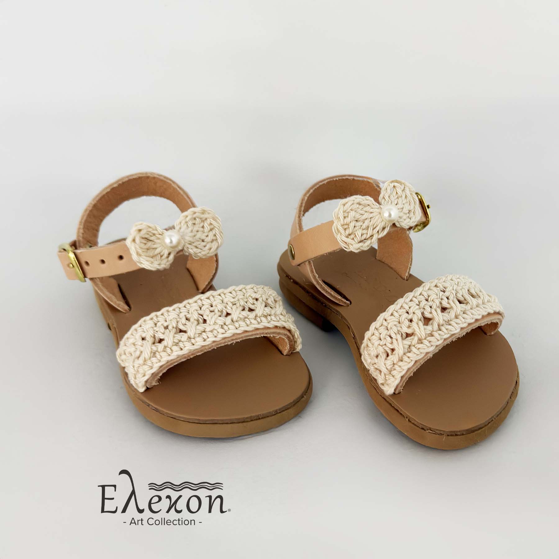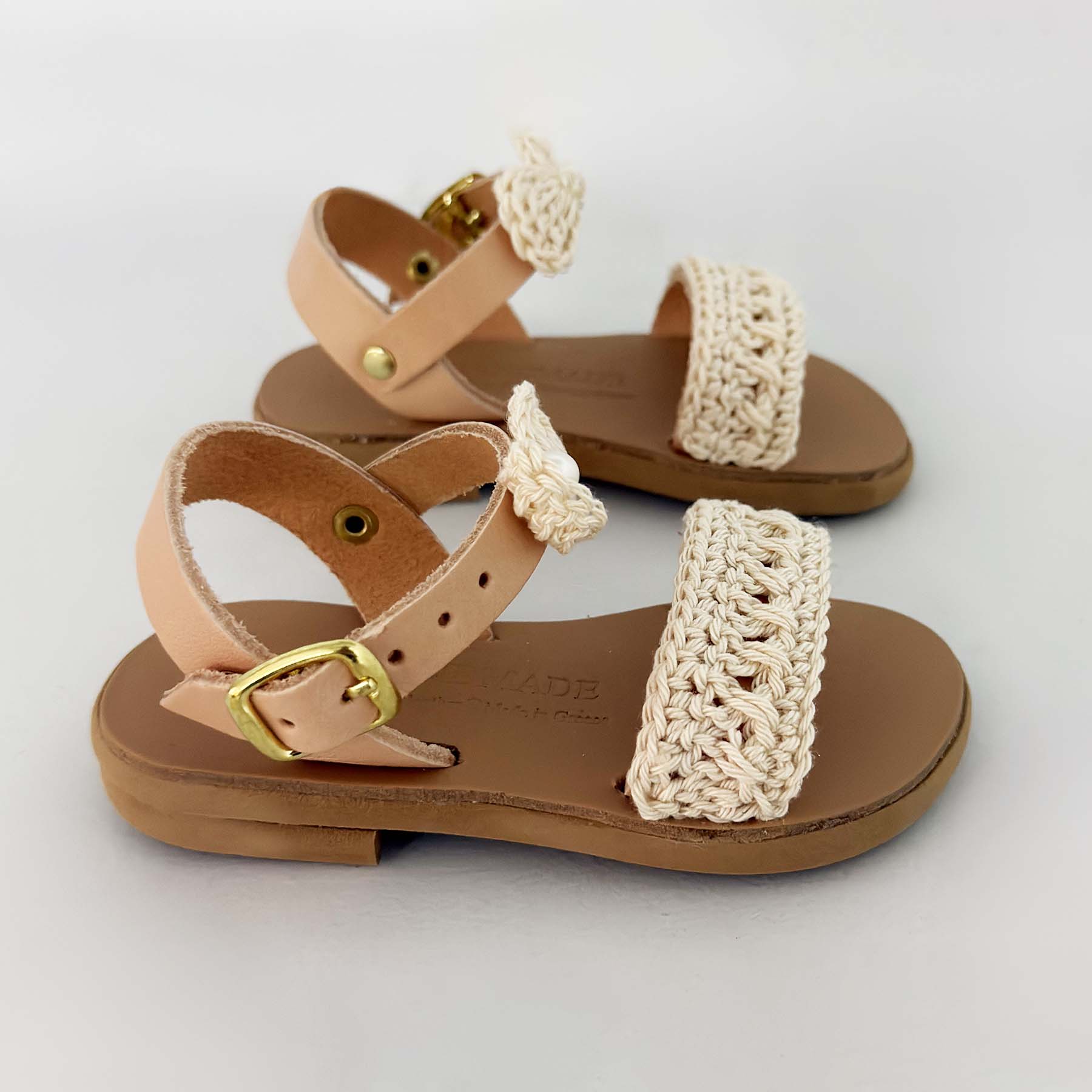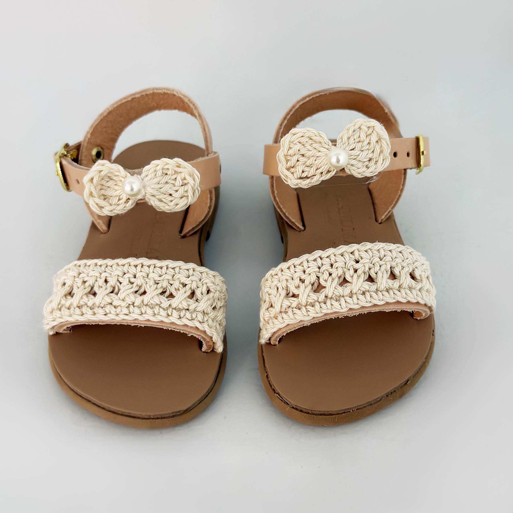 Δερμάτινα σανδάλια boho chic style διακοσμημένα στο χέρι με κορδόνια χρώματος εκρού πλεγμένα στο χέρι και χειροποίητο πλεκτό φιογκάκι στο πάνω μέρος
