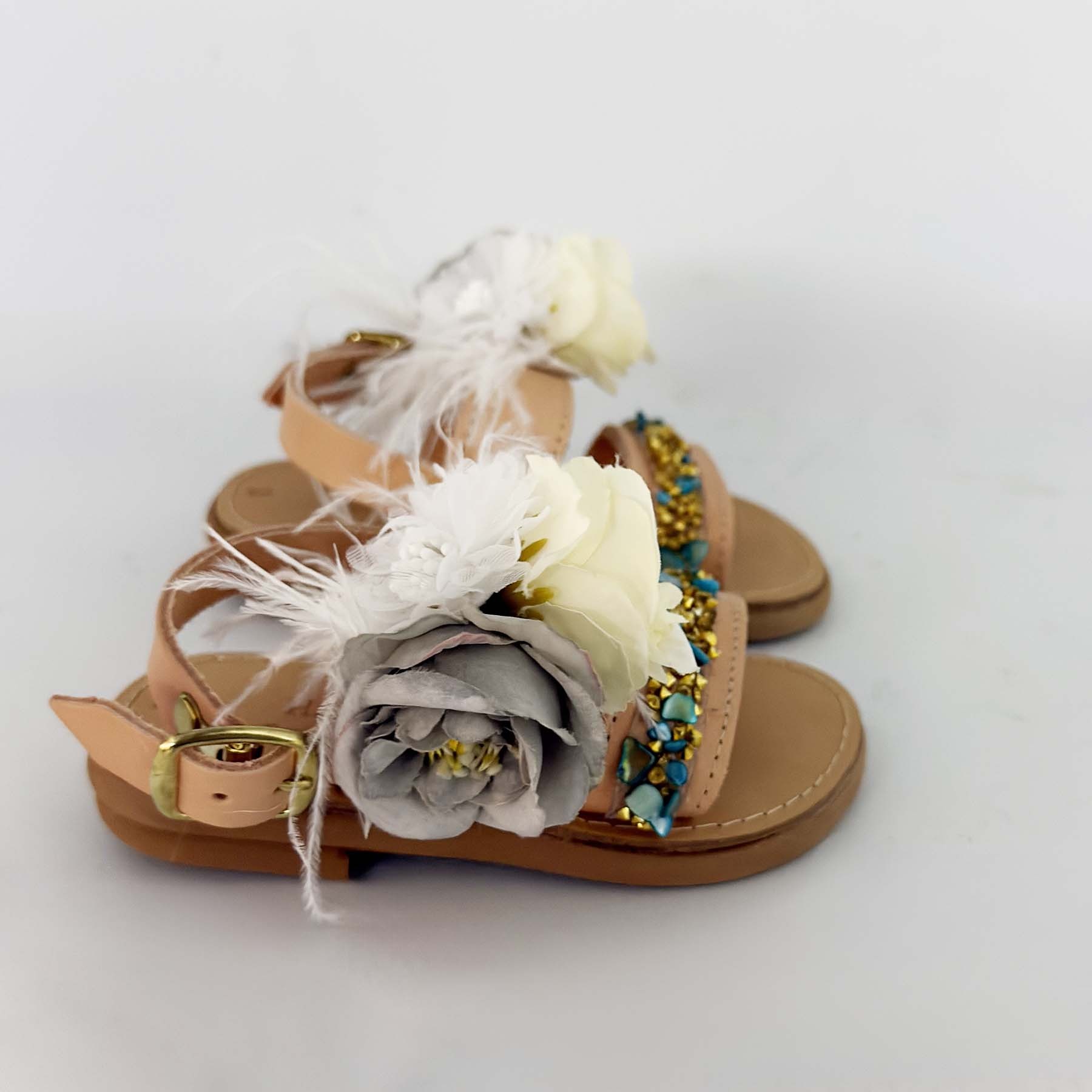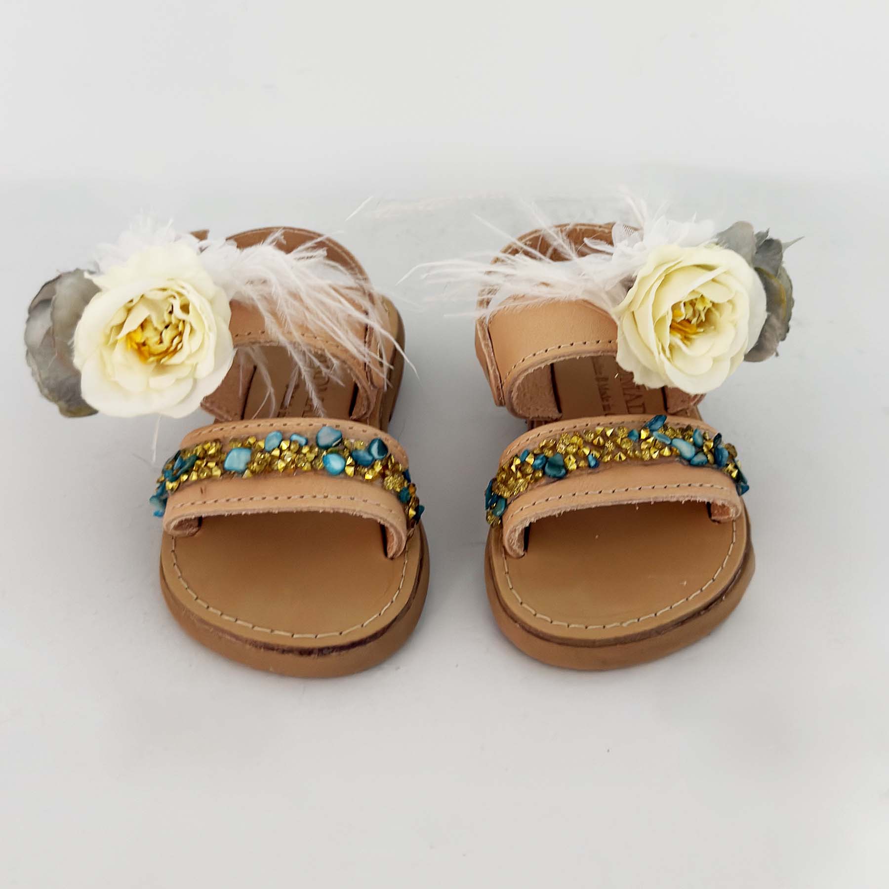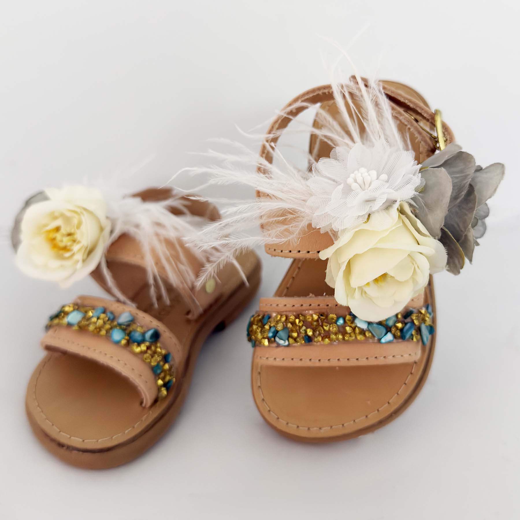 Δερμάτινα σανδάλια διακοσμημένα στο χέρι με τρέσα από γαλάζιες & χρυσές πέτρες στο κάτω μέρος , λουλούδια μπλε-λευκό-εκρού και πούπουλο λευκό στο πάνω μέρος
