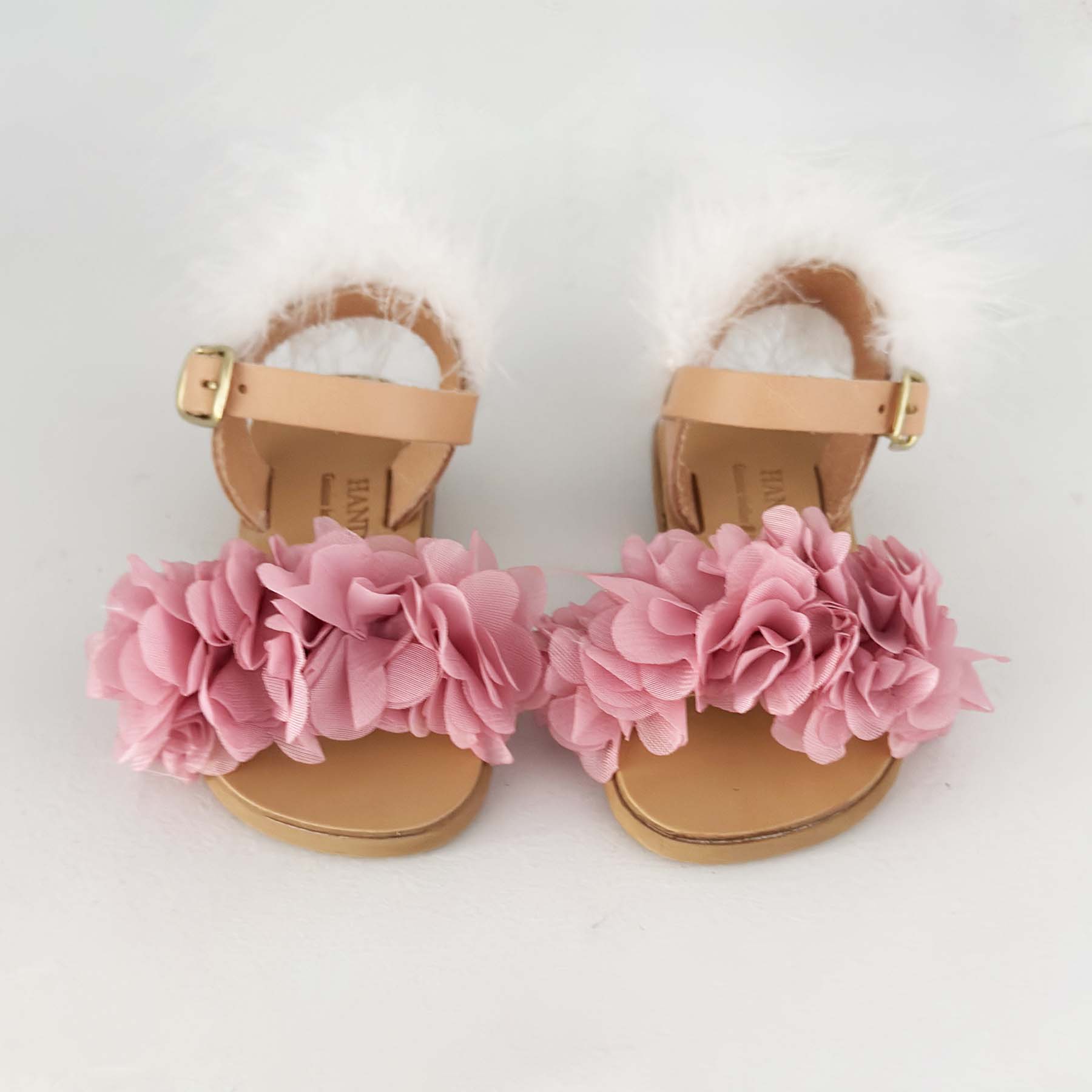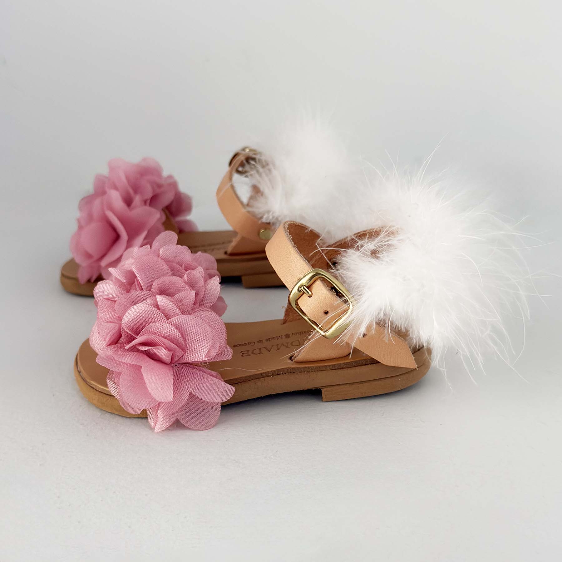 Δερμάτινα σανδάλια διακοσμημένα στο χέρι με υφασμάτινα λουλούδια χρώματος dusty pink και φτερό λευκο στο πίσω μέρος