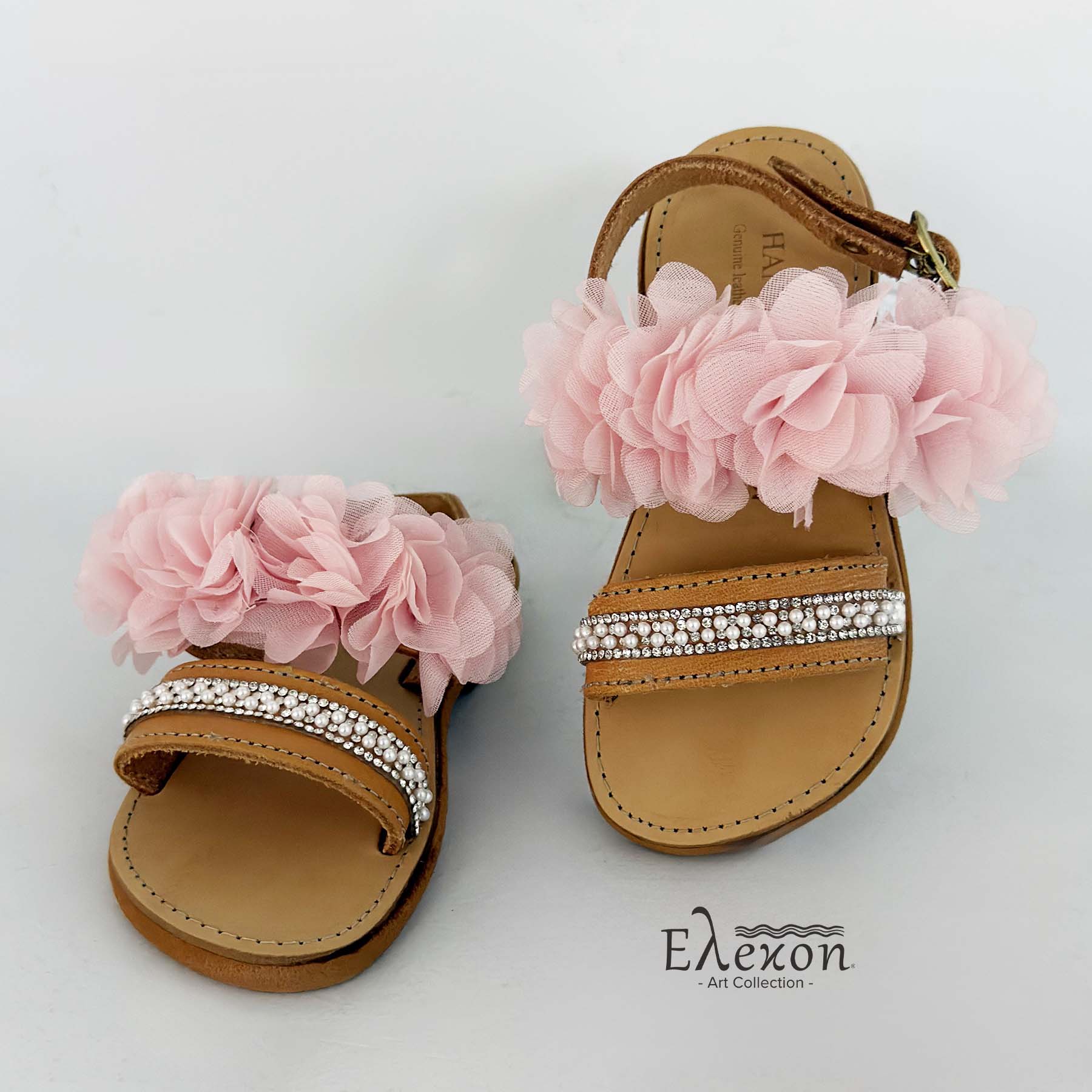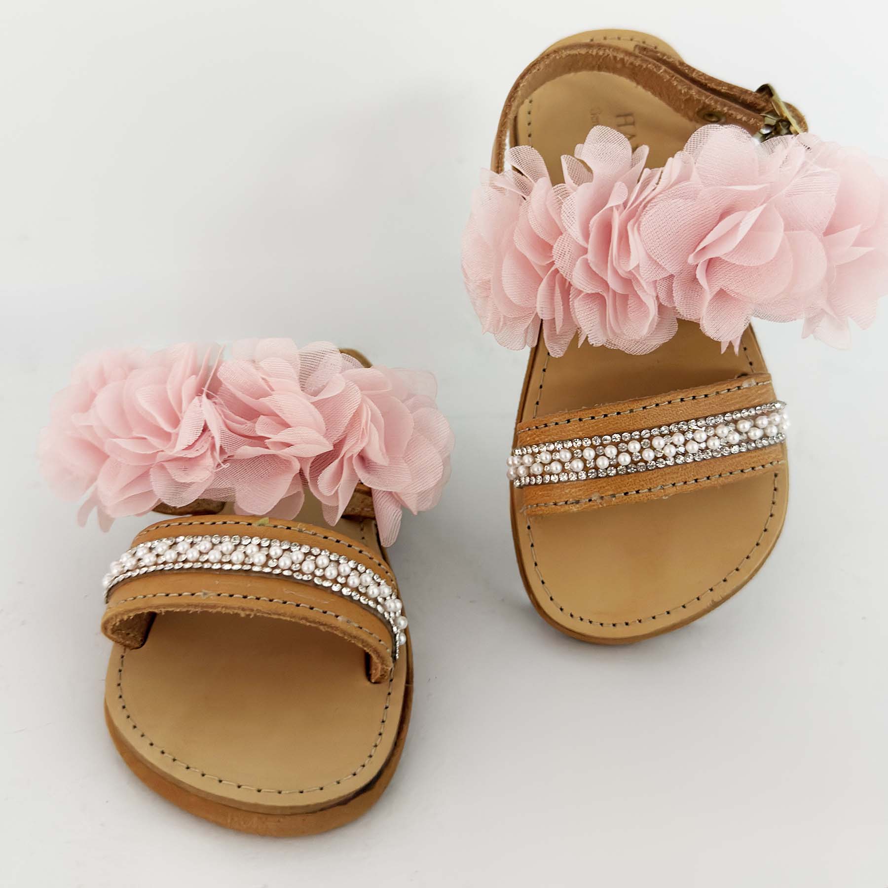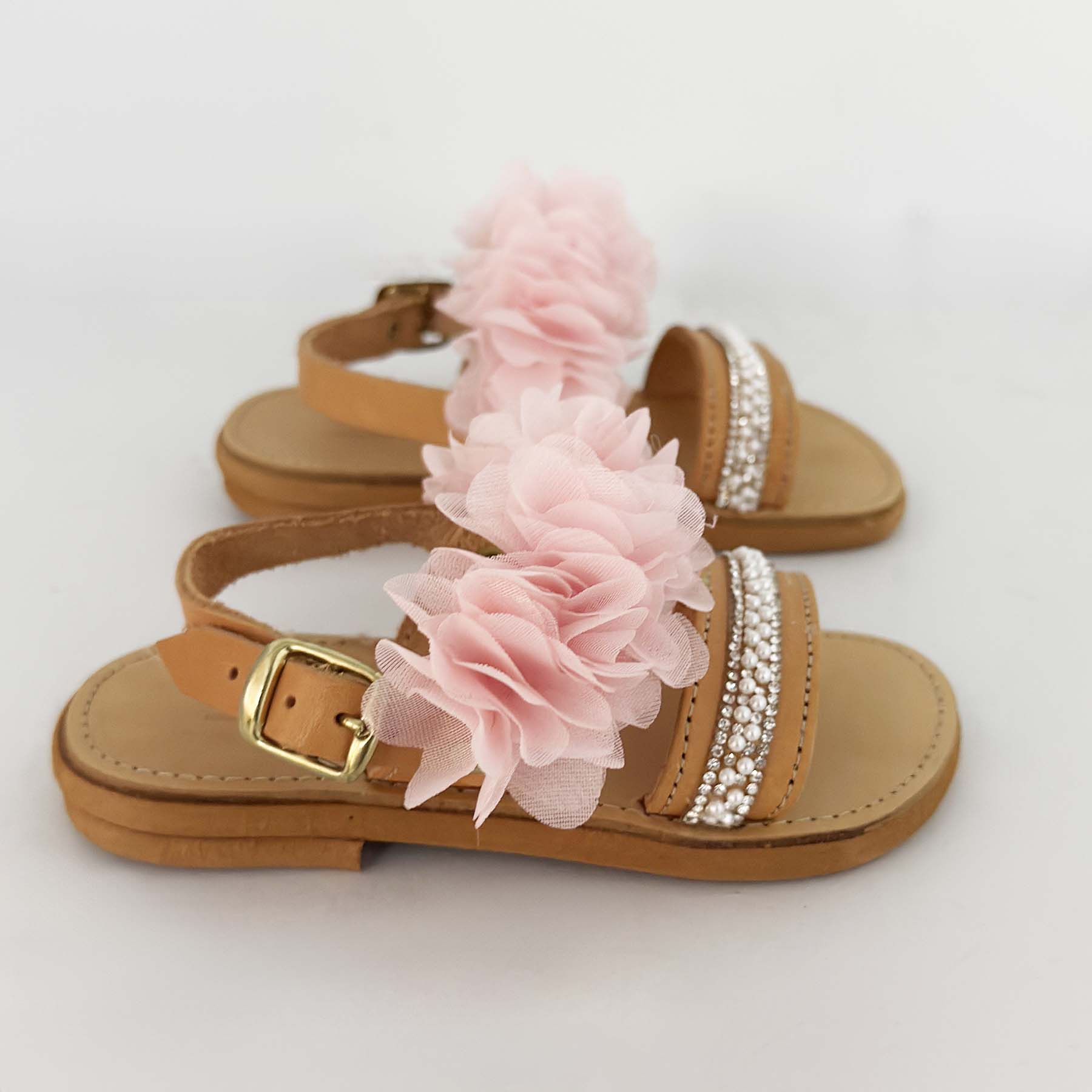 Δερμάτινα σανδάλια διακοσμημένα στο χέρι με τρέσα από στρας & πέρλες στο κάτω μέρος και υφασμάτινα ροζ λουλούδια στο πάνω μέρος