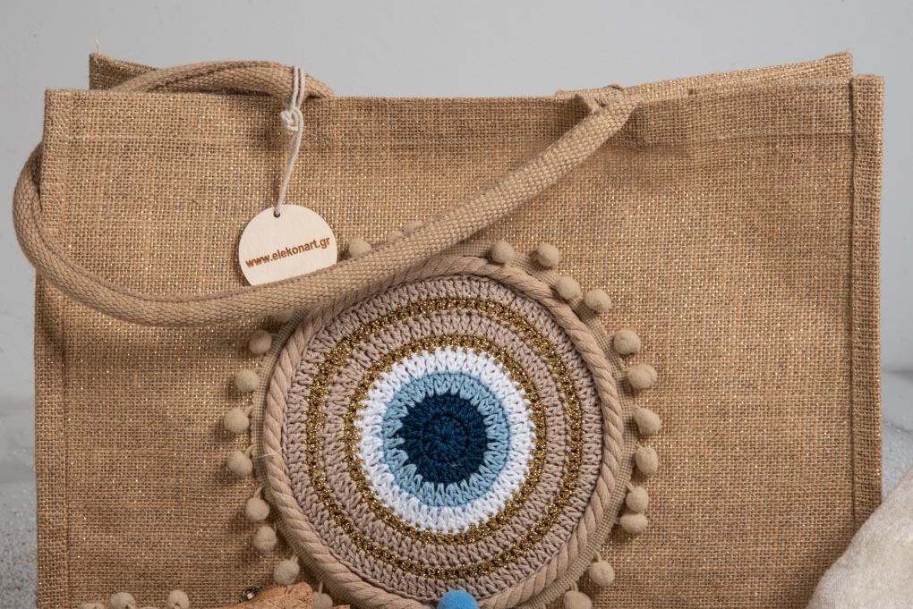 Το καλοκαιρινό σετ 3 ΤΜΧ διακοσμημένο με χειροποίητό πλεκτό ματάκι και pompom τρέσα
