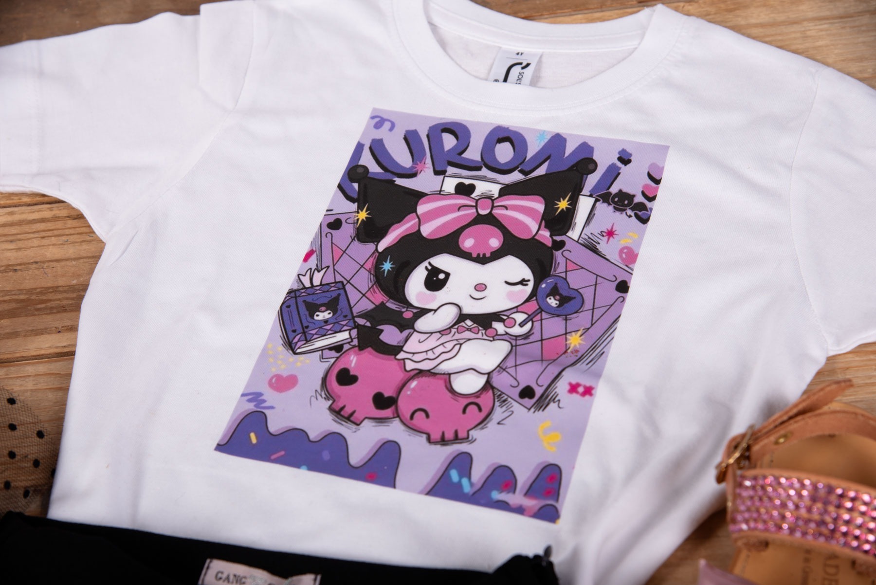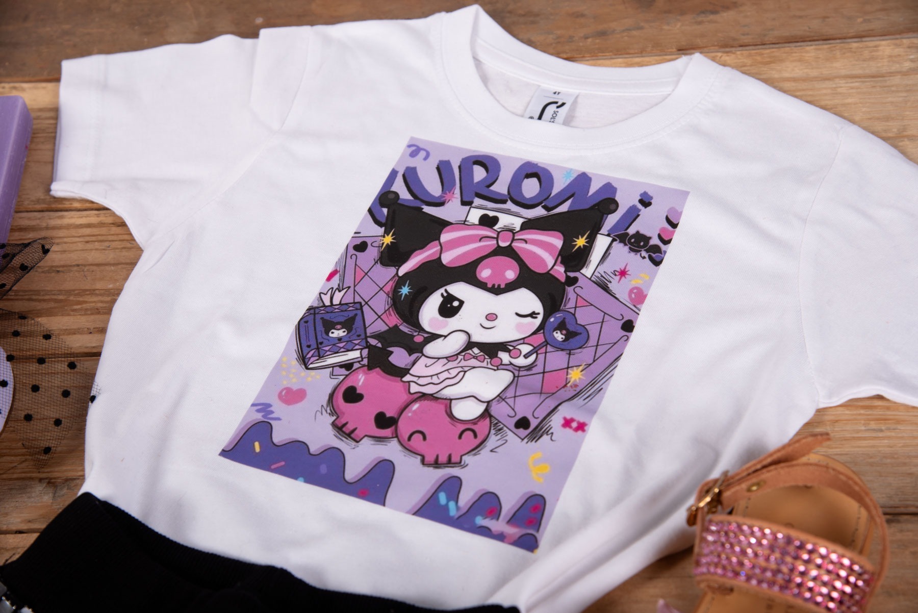 • Λευκή μπλούζα με στάμπα Kuromi σε μοβ-ροζ αποχρώσεις