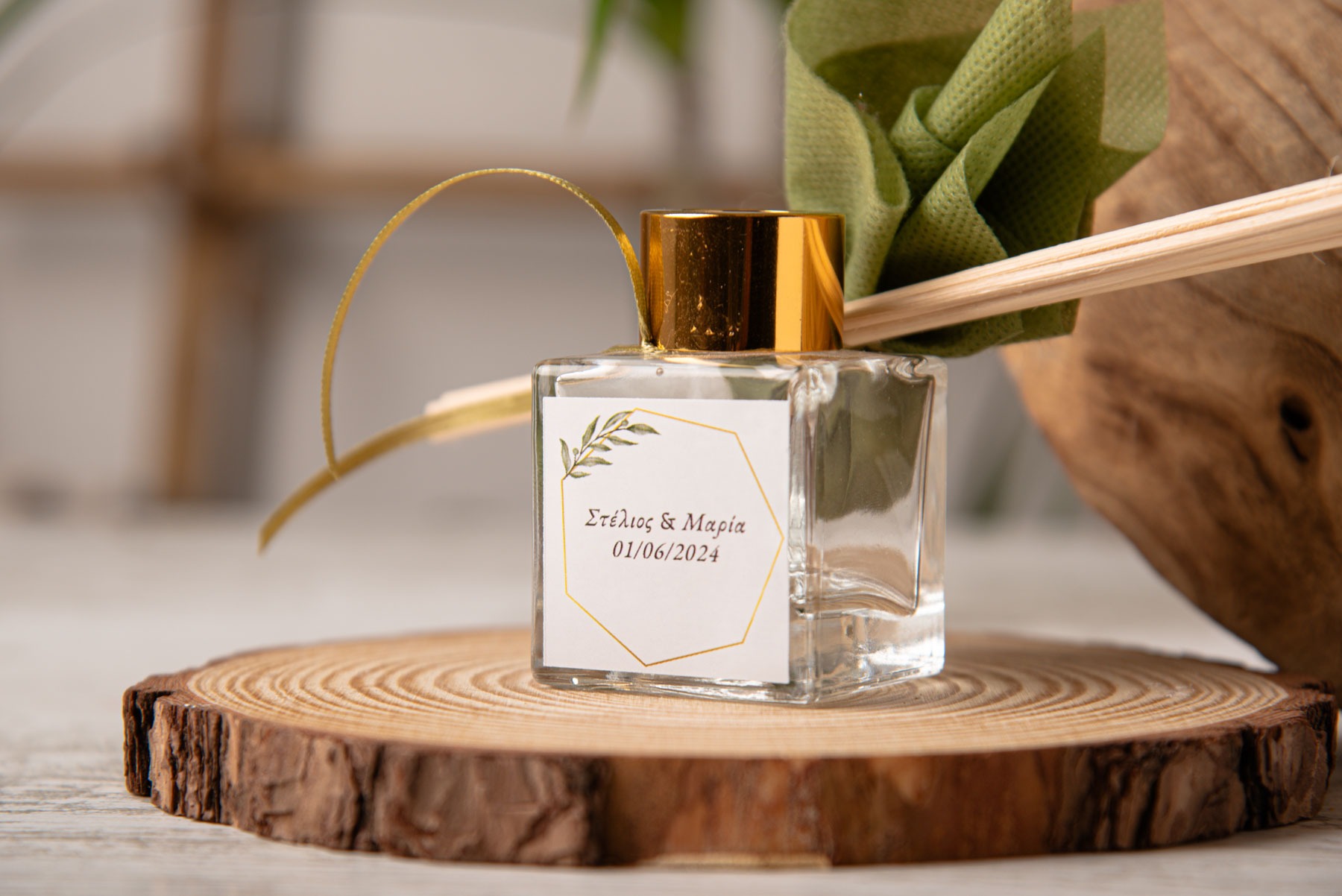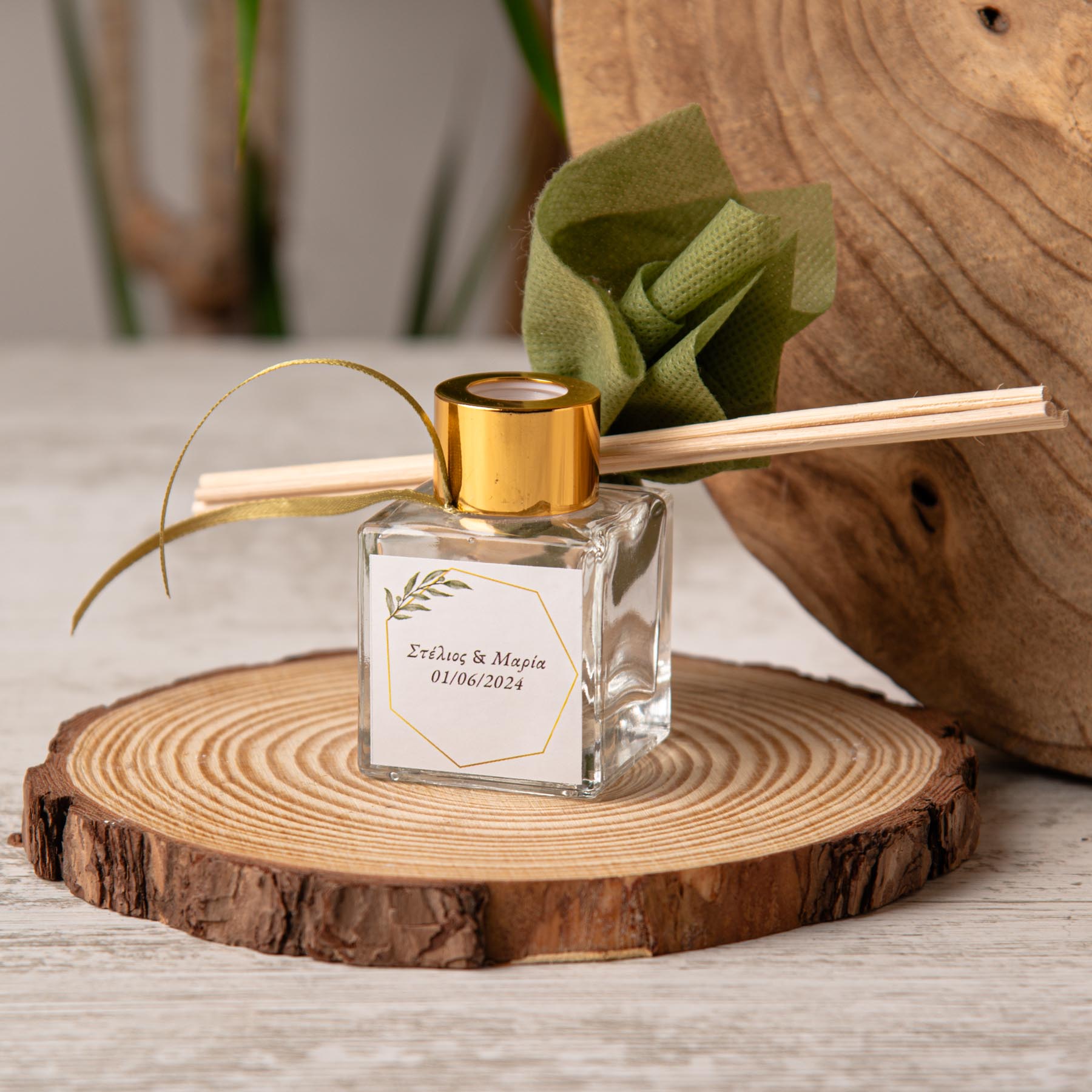 Μπομπονιέρα γάμου αρωματικό χώρου σε διάφανο μπουκαλάκι (50ml) με αυτοκόλλητο ελιά