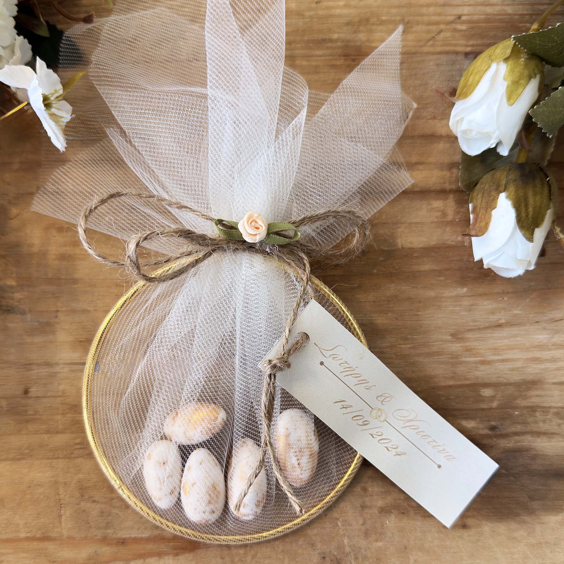 Μπομπονιέρα γάμου χρυσός κύκλος με εκρού τούλι , σχοινί , λουλουδάκι εκρού και προσωποποιημένο καρτελάκι με ονόματα & ημερομηνία