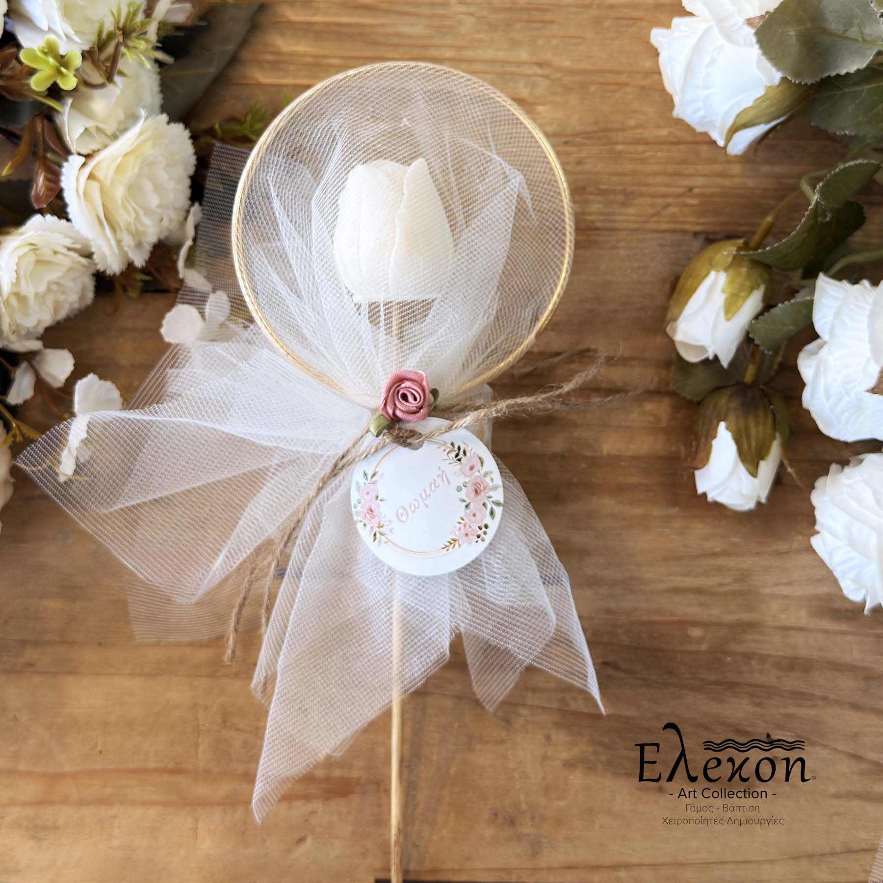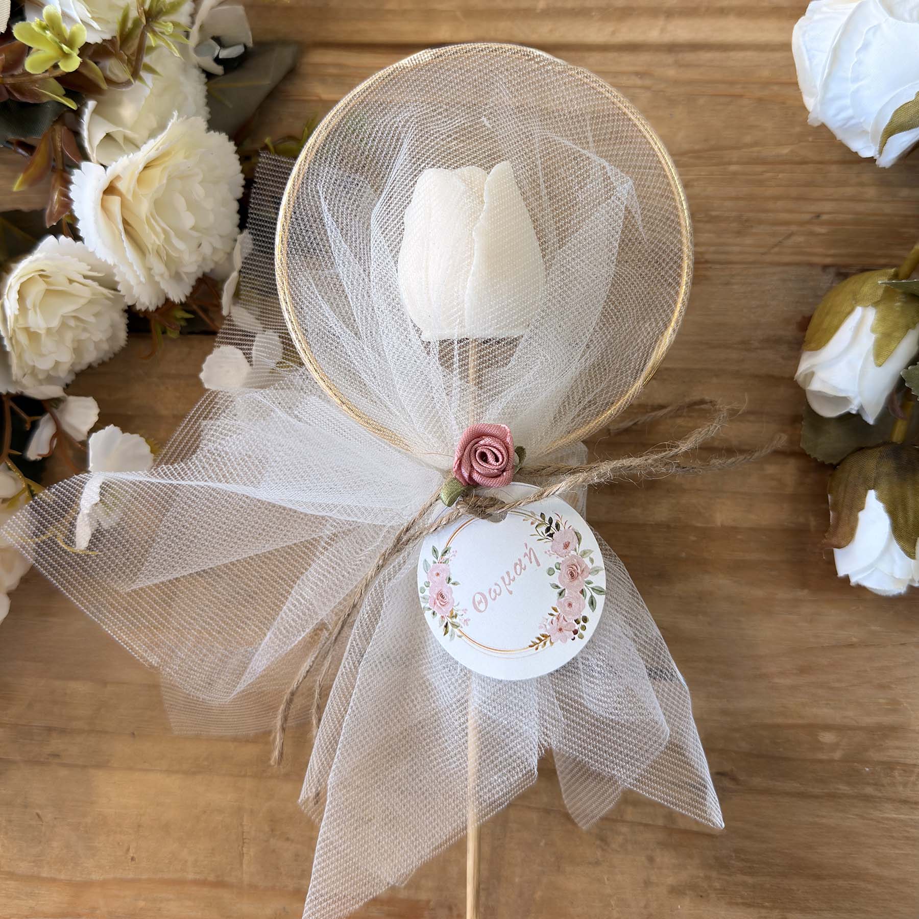 Μπομπονιέρα γάμου χρυσός κύκλος διακοσμημένο με λευκό τούλι και σαπούνι στικ σε σχήμα τουλίπας λευκό