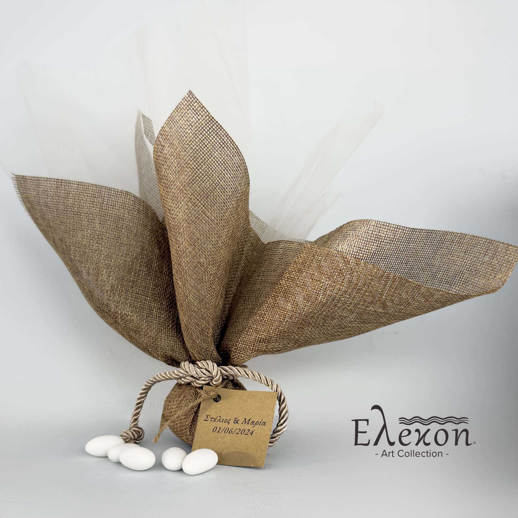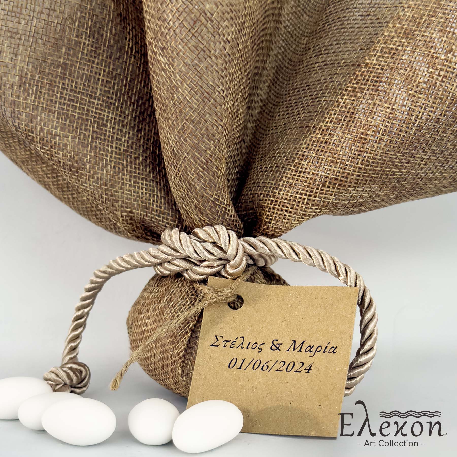 Μπομπονιέρα γάμου με λινό μαντήλι , κορδόνι σοκολά και καρτελάκι με ονόματα & ημερομηνία