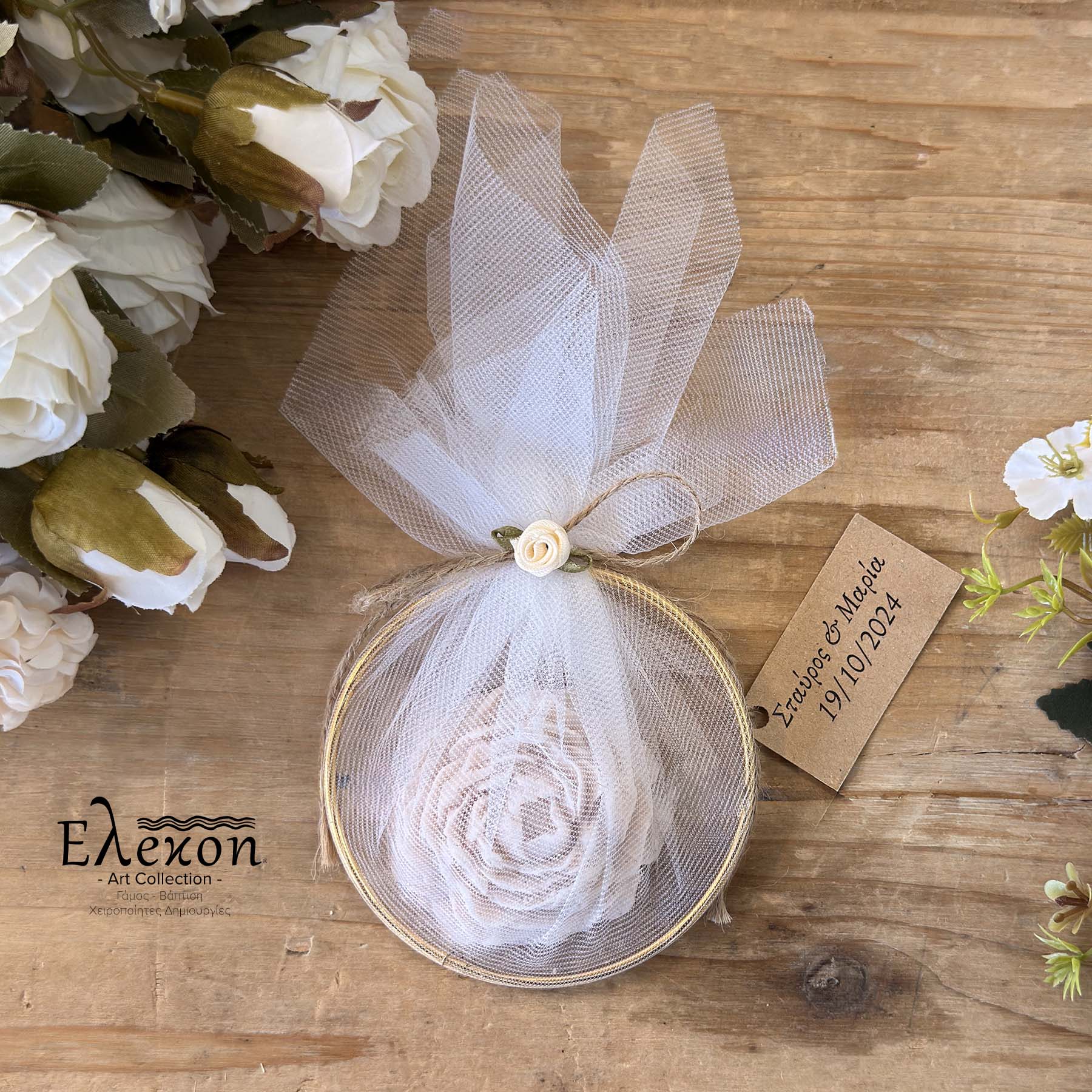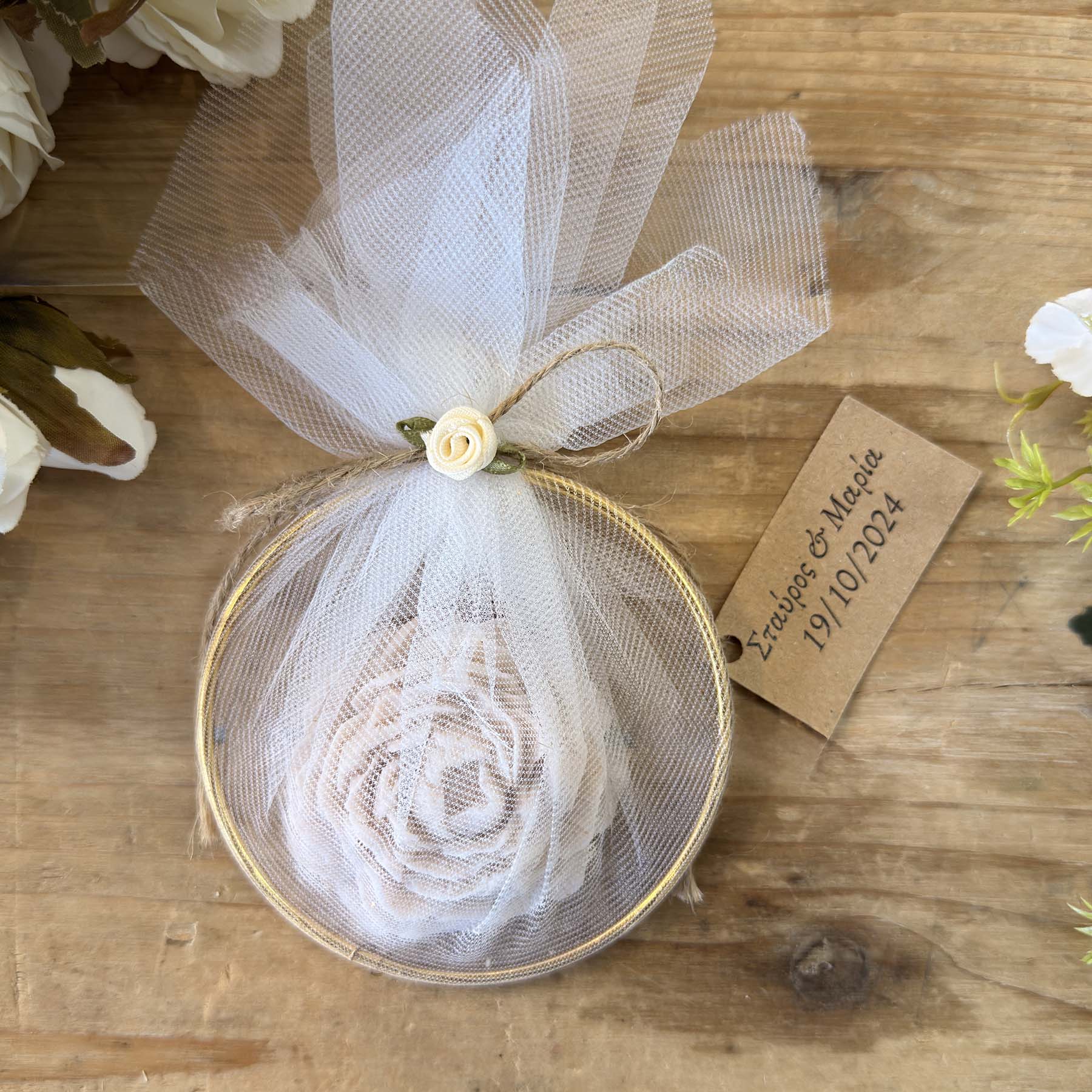 Μπομπονιέρα βάπτισης σαπούνι τριαντάφυλλο σε χρυσός κύκλος με λευκό τούλι , σχοινί , εκρού λουλουδάκι και craft προσωποποιημένο καρτελάκι με ονόματα & ημερομηνία