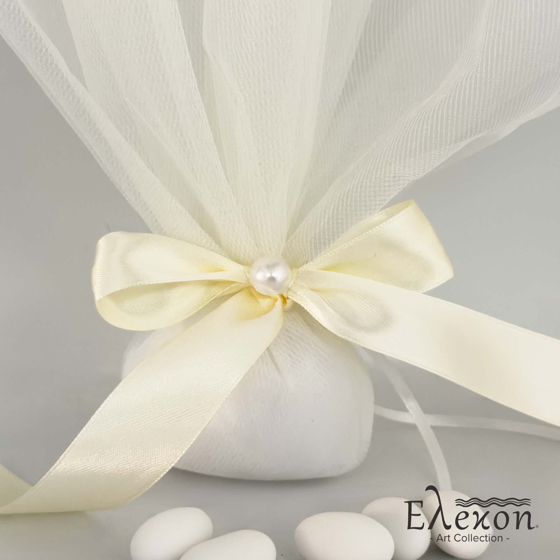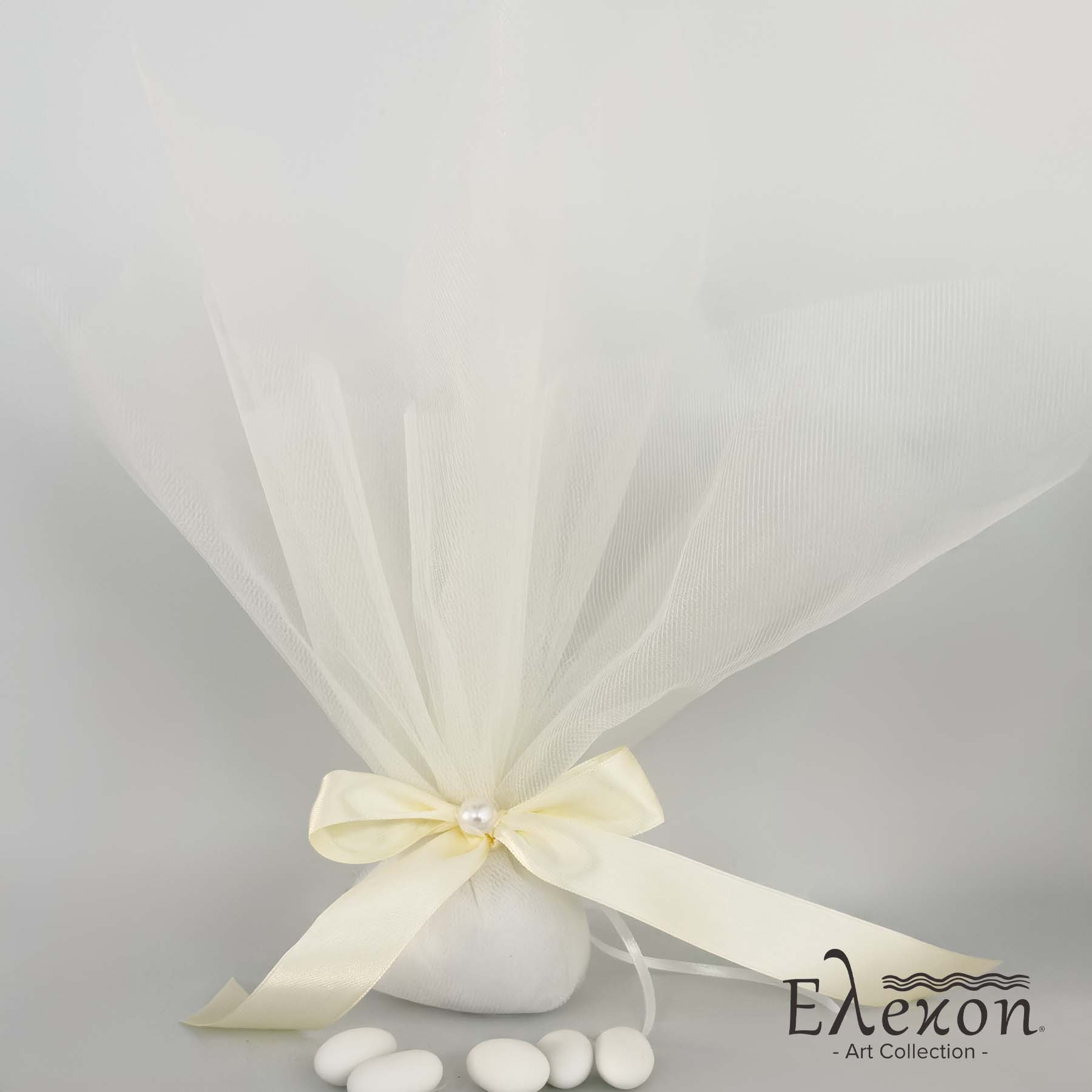 Μπομπονιέρα γάμου με τούλι εκρού με σατέν κορδέλα εκρού και πέρλα