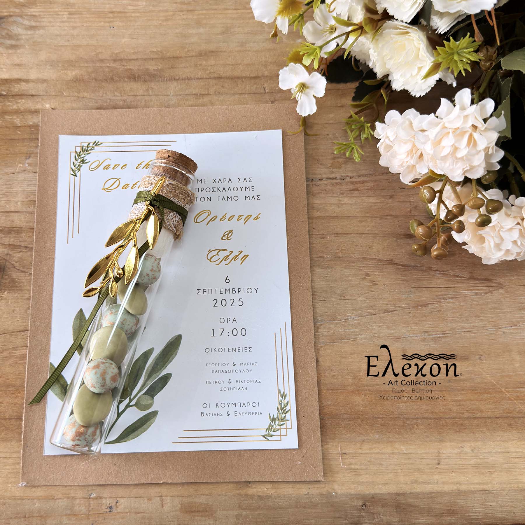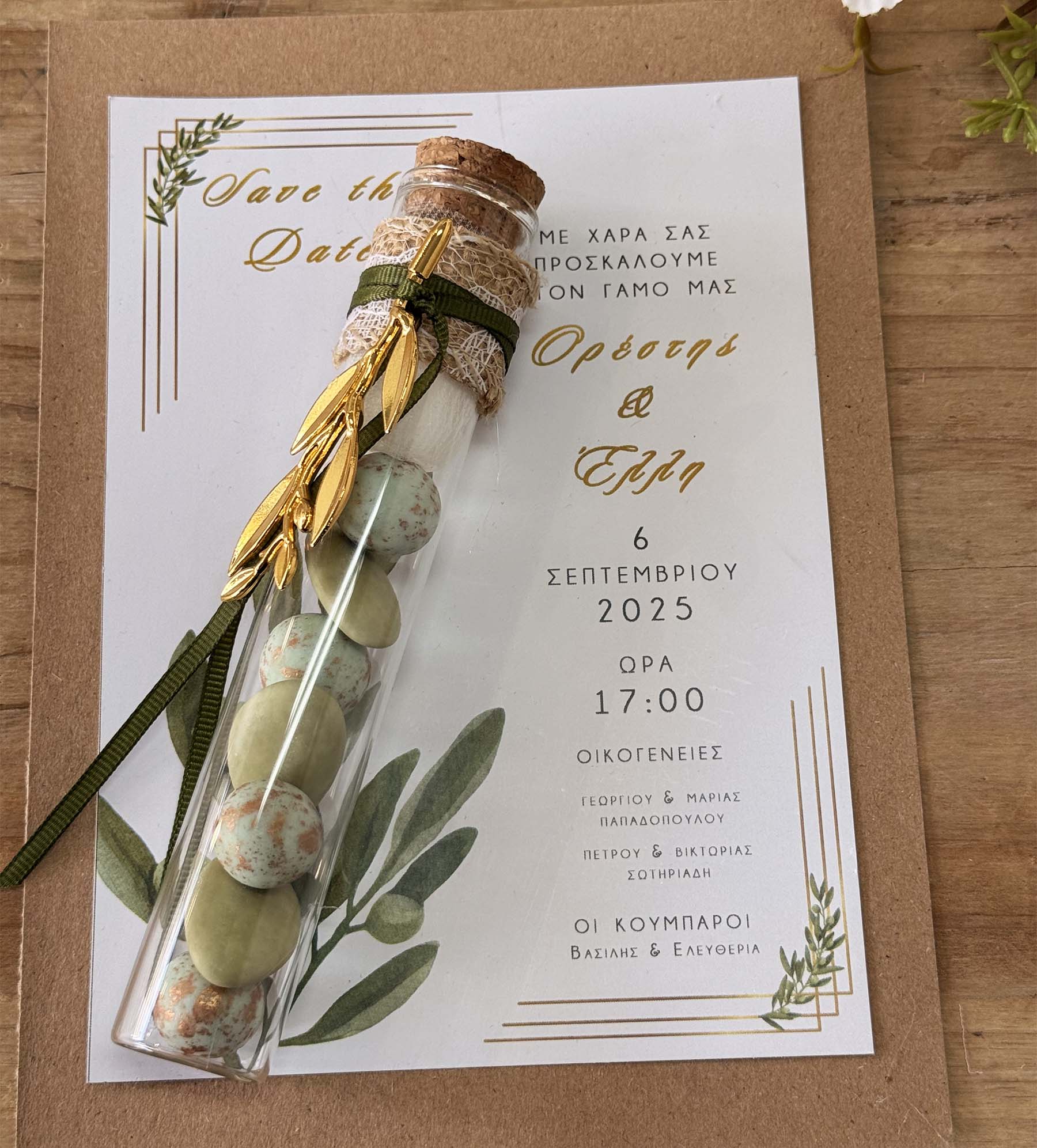 Μπομπονιέρα-προσκλητήριο γάμου με θέμα την ελιά ,  γυάλινος σωλήνας διακοσμημένος με μεταλλικό χρυσό κλαδί ελιάς .Περιλαμβάνει 7 κουφέτα “Χατζηγιαννάκη” supreme και crispy σε μέντα και λαδί αποχρώσεις