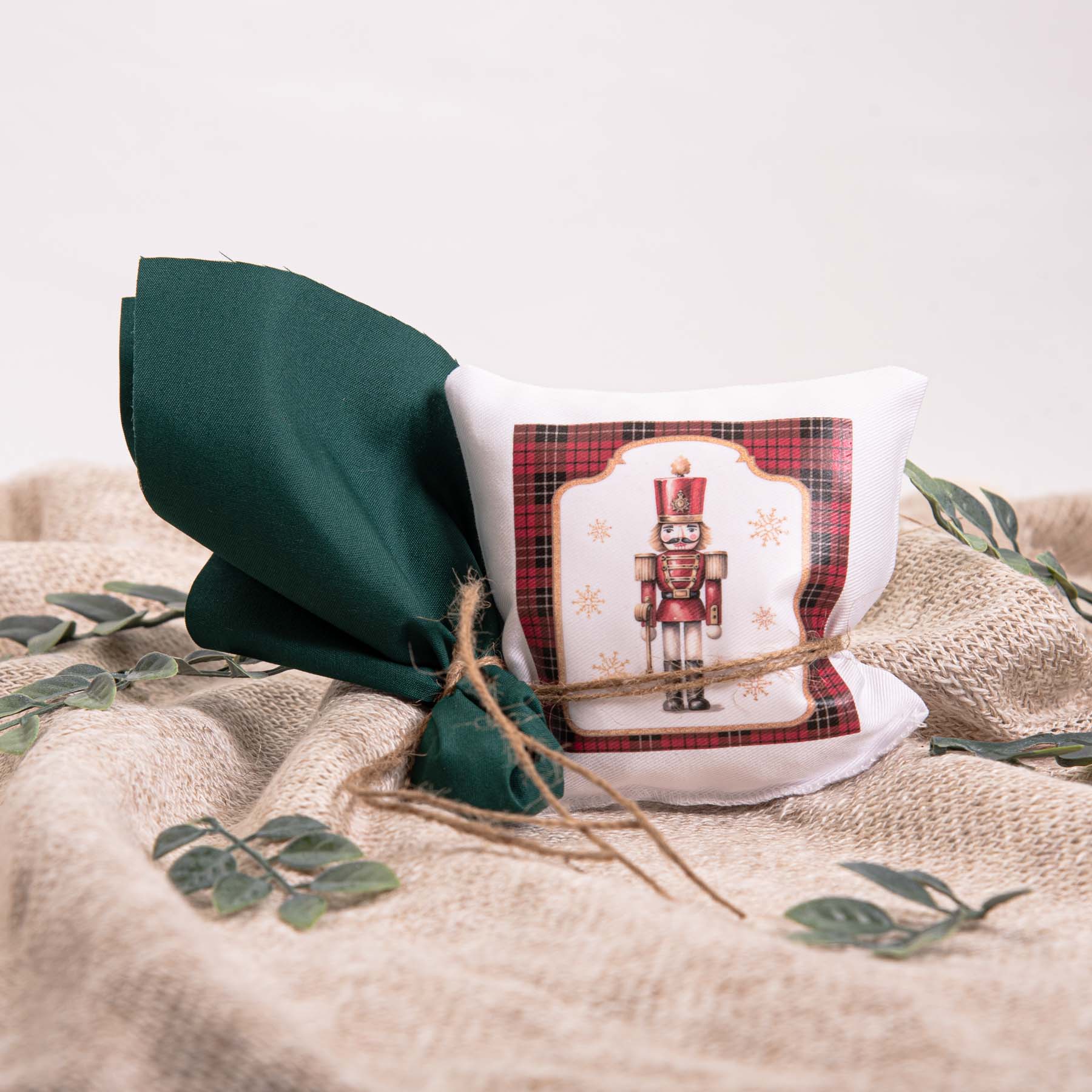 Μπομπονιέρα Βάπτισης μαξιλαράκι χρώματος λευκό με σιδερότυπο “Καρυοθραύστης!”