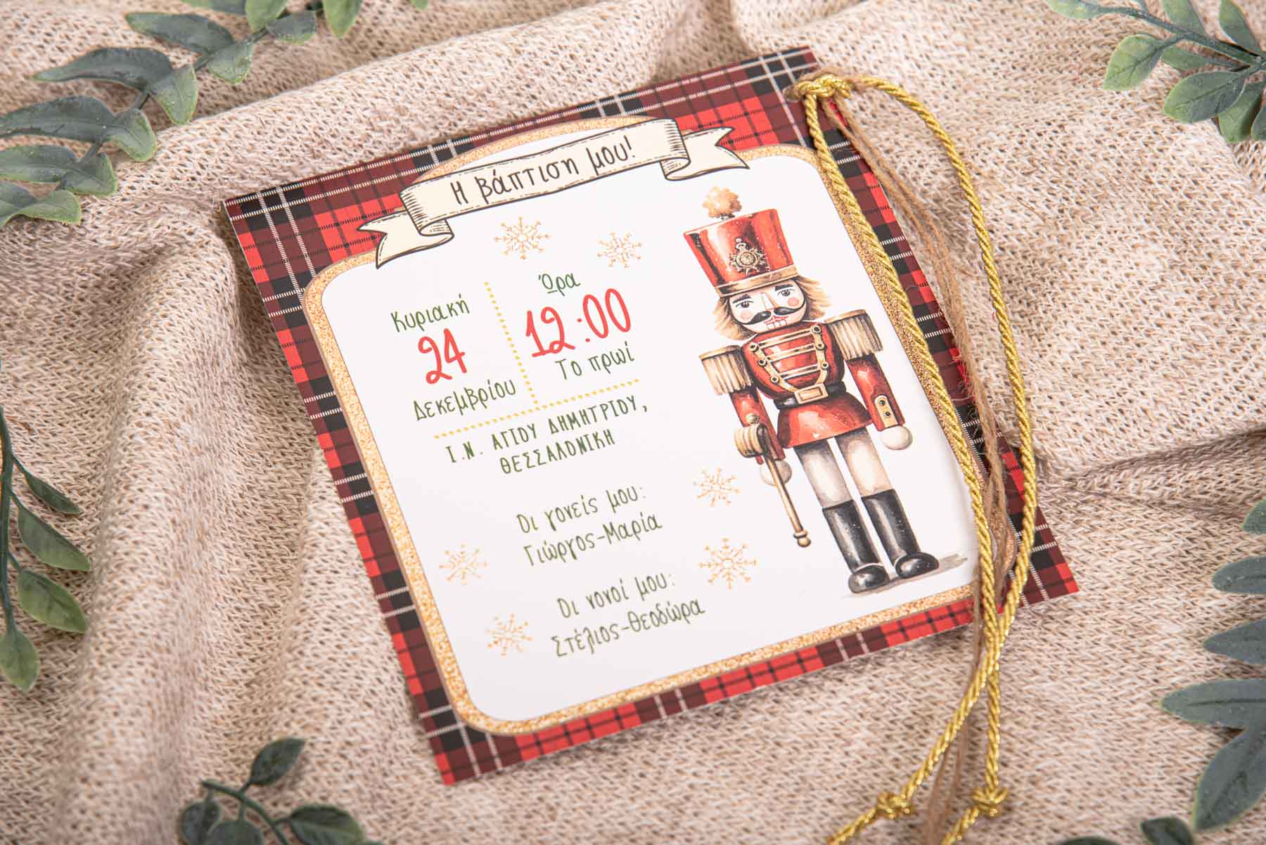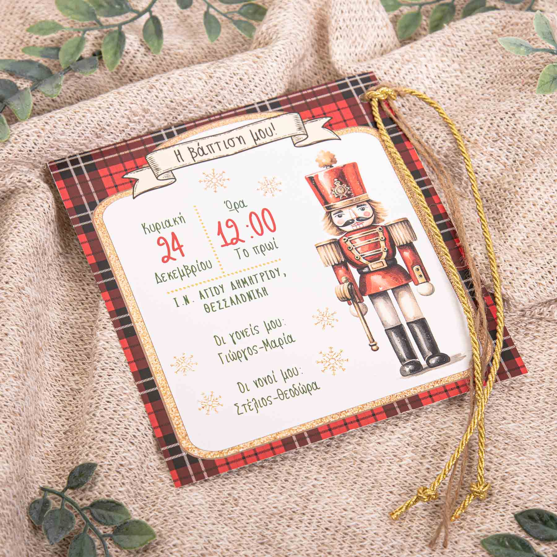 -    -  Προσκλητήρια Χριστουγεννιάτικη Βάπτιση  -  Προσκλητήριο Βάπτισης με θέμα τον Καρυοθραύστη διακοσμημένο με κορδόνι χρυσό και σχοινί