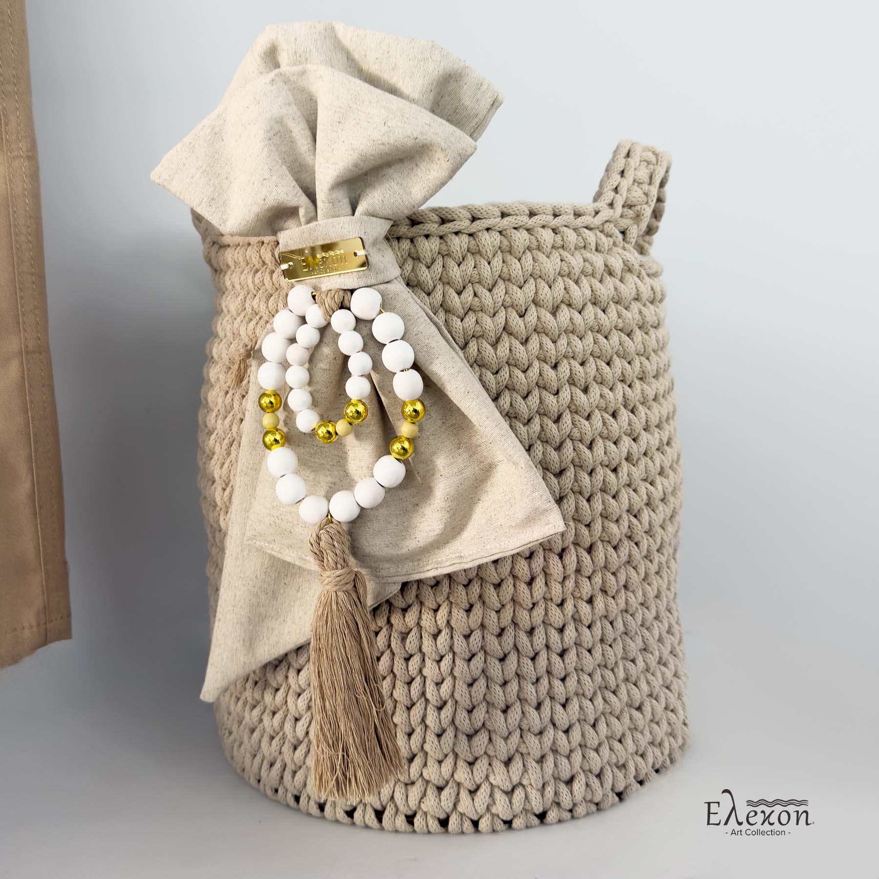 •Χειροποίητο πλεκτό καλάθι χρώματος εκρού διακοσμημένη με μπεζ και εκρού υφάσματα και χάντρες