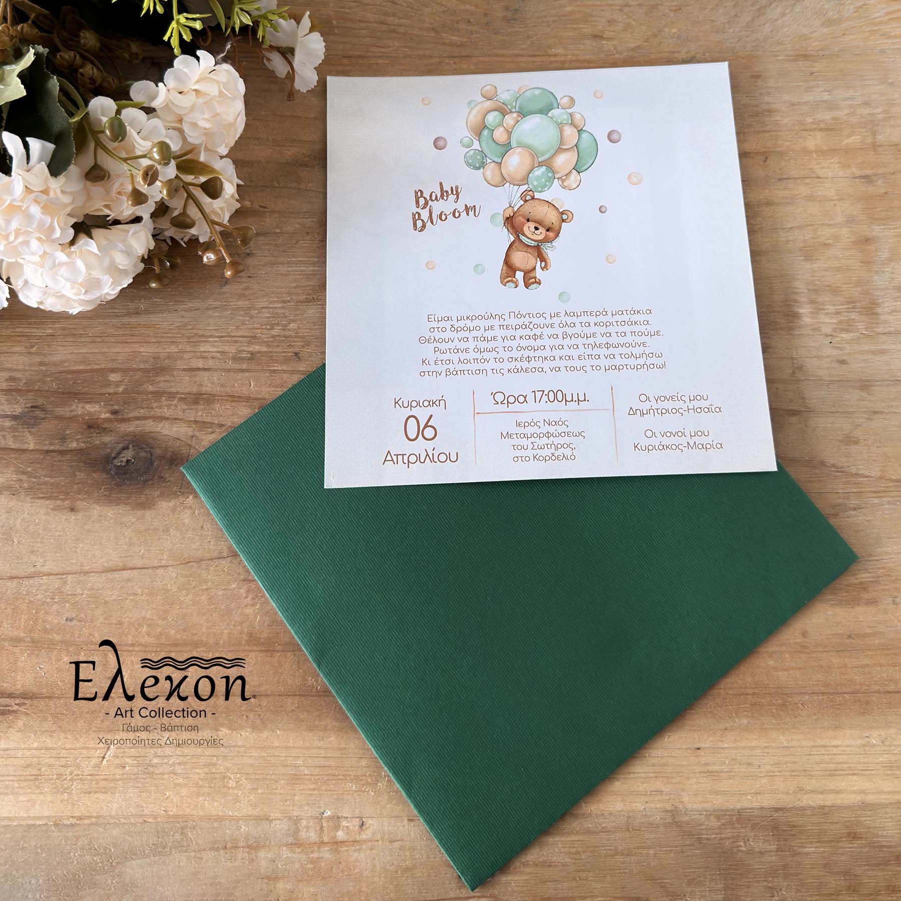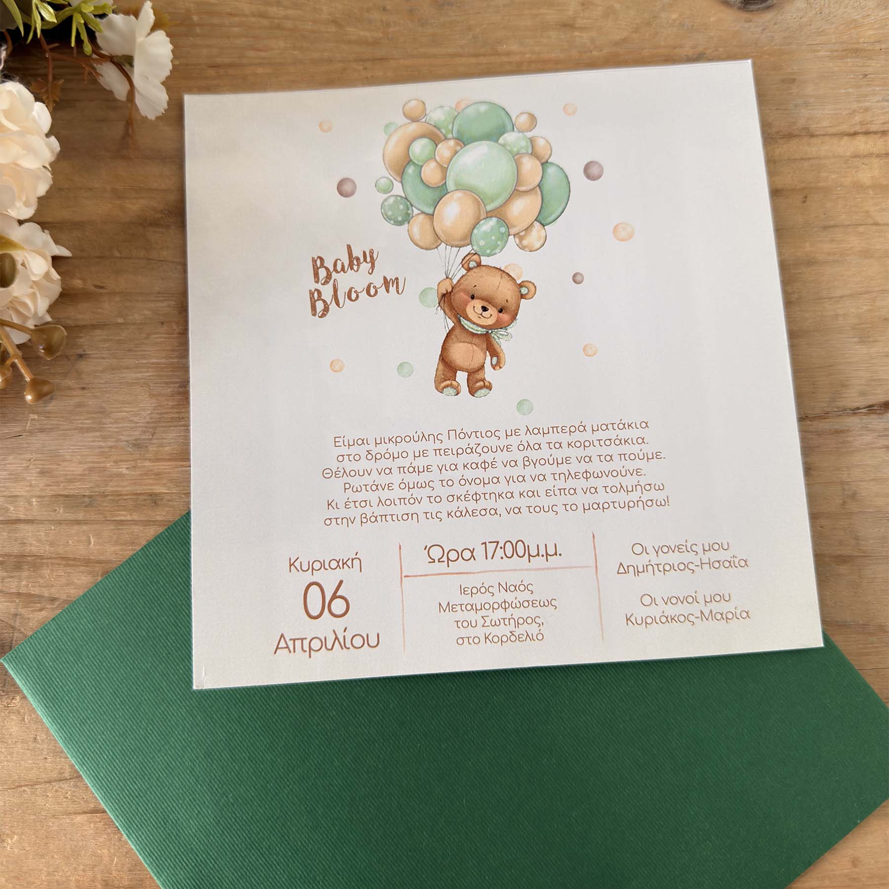 Προσκλητήριο Βάπτισης με θέμα αρκουδάκι χρώματος βεραμάν σε φάκελο κυπαρισσί
