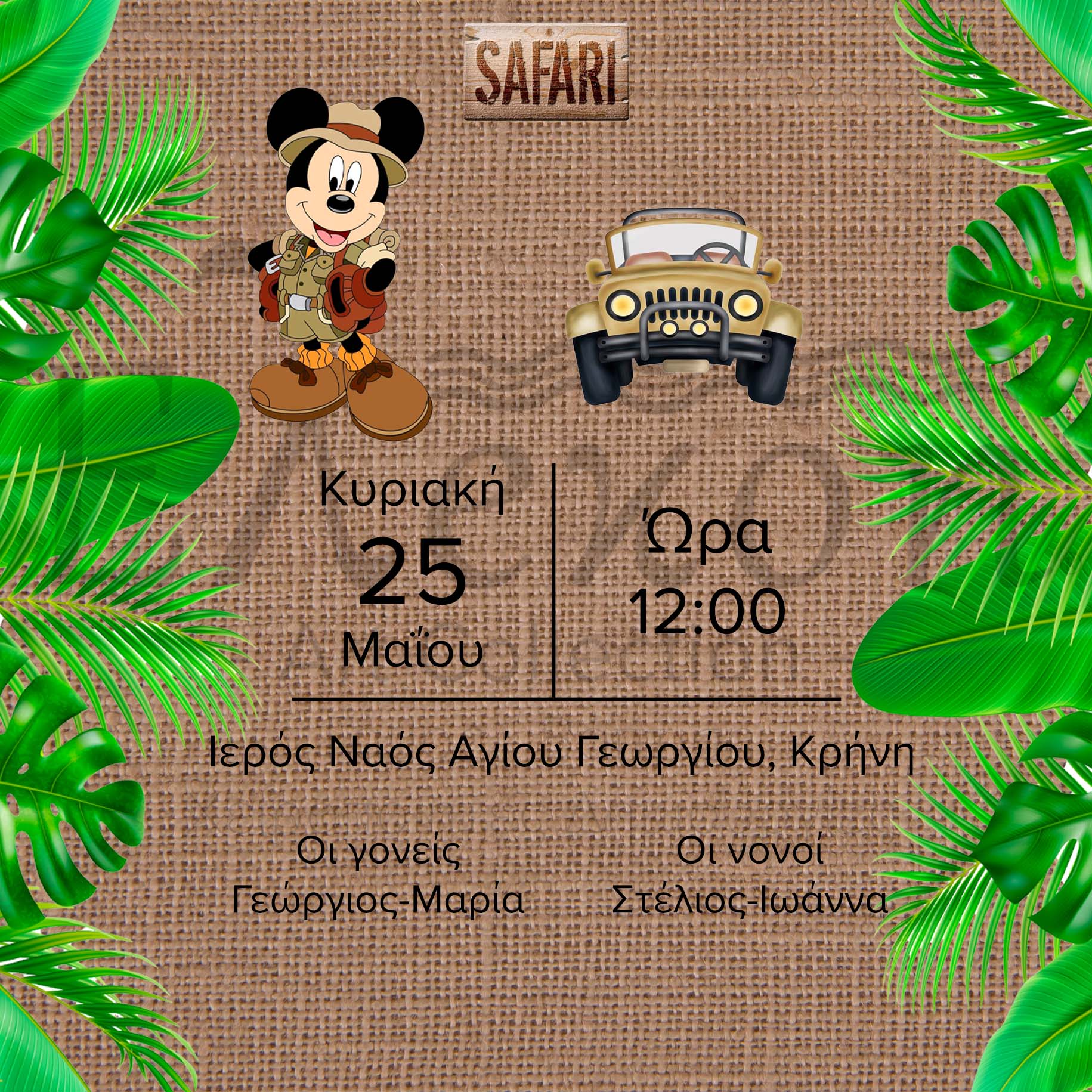 Προσκλητήριο Βάπτισης με θέμα Mickey Safari (15cm X 15cm)