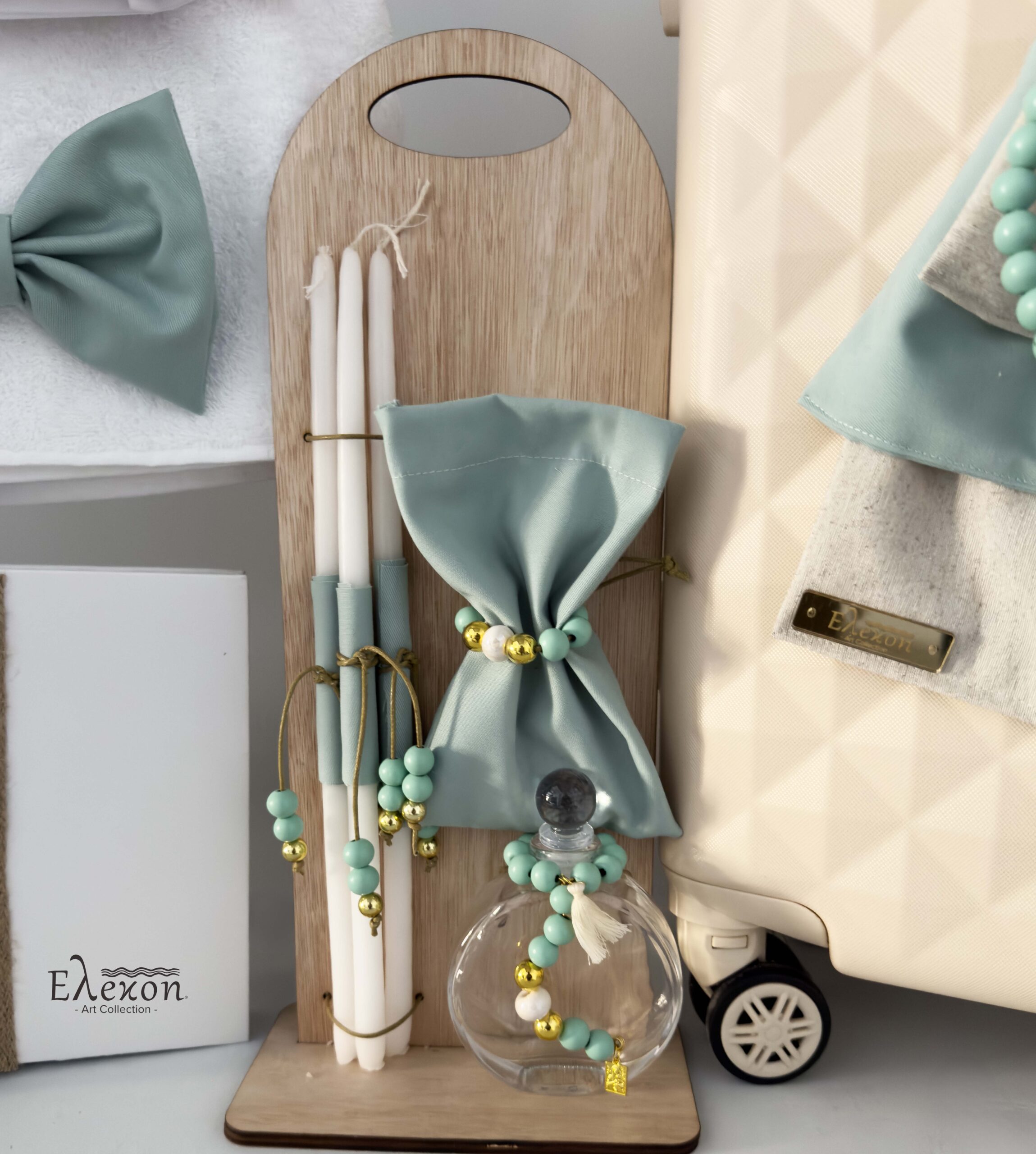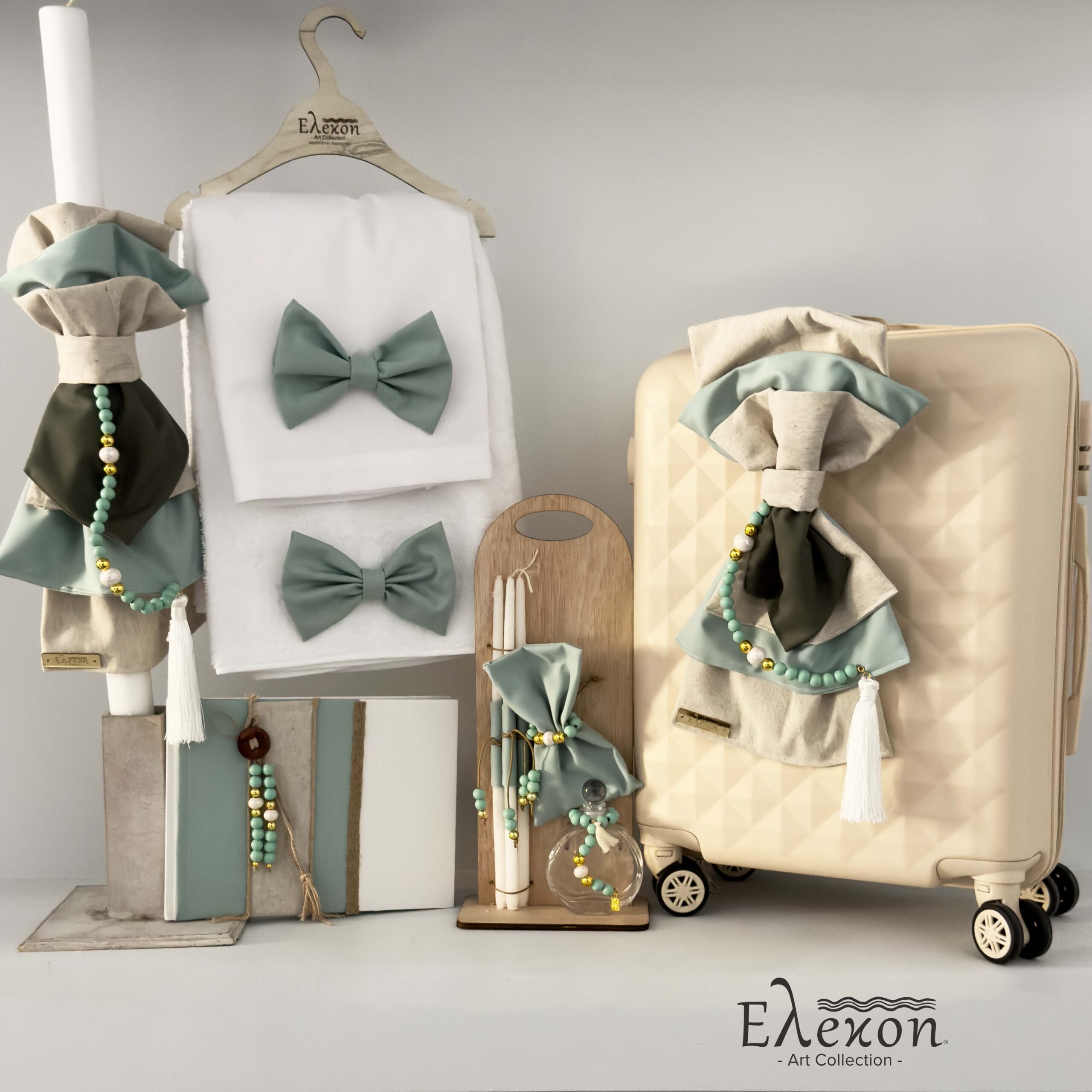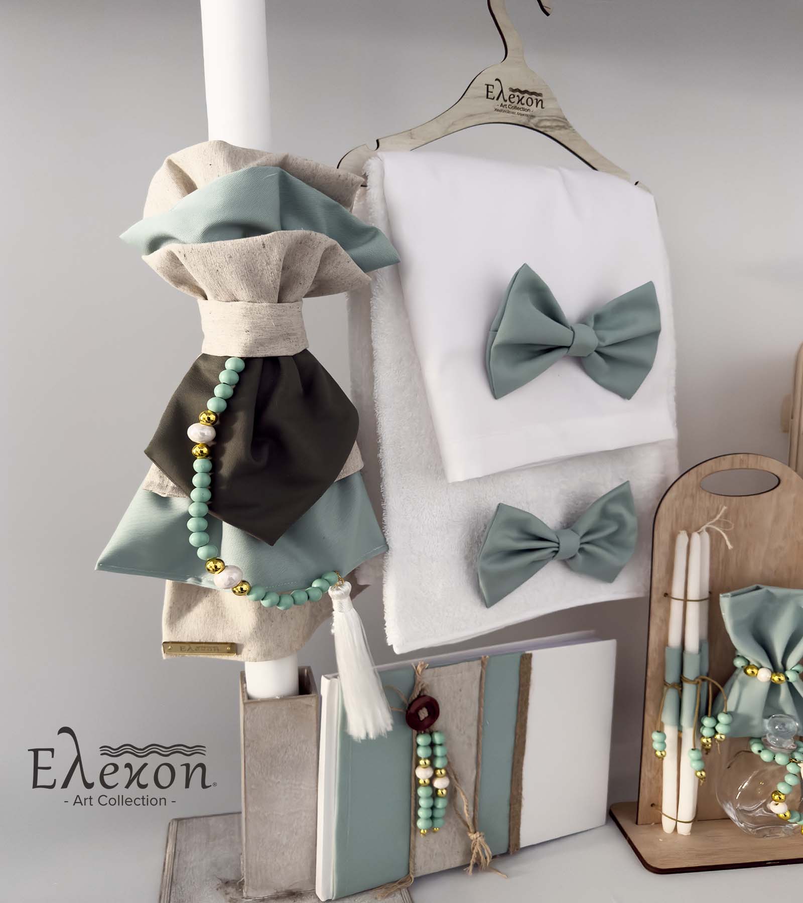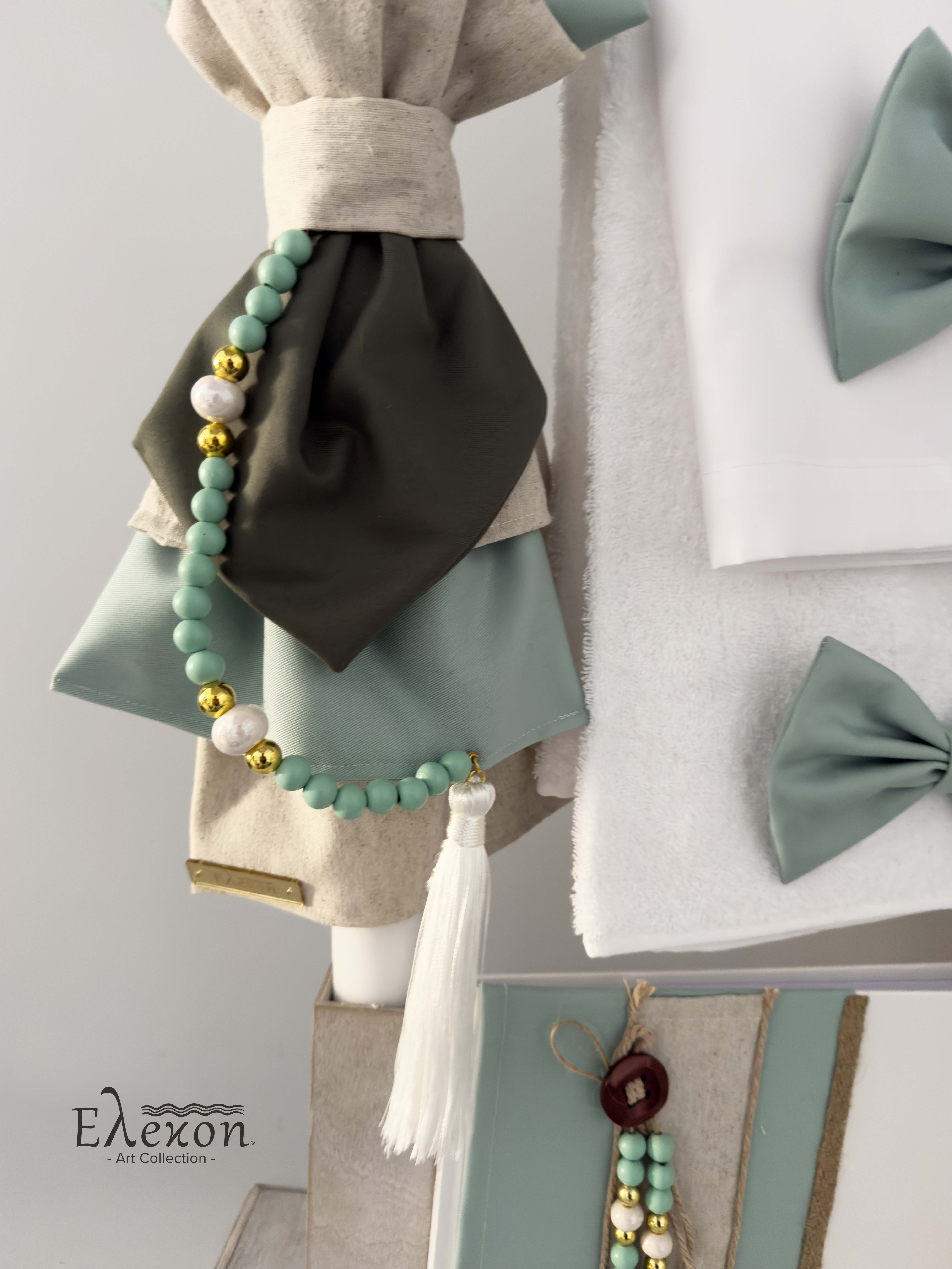 Το σετ βάπτισης για αγόρι ” Μέντα & εκρού” περιλαμβάνει :