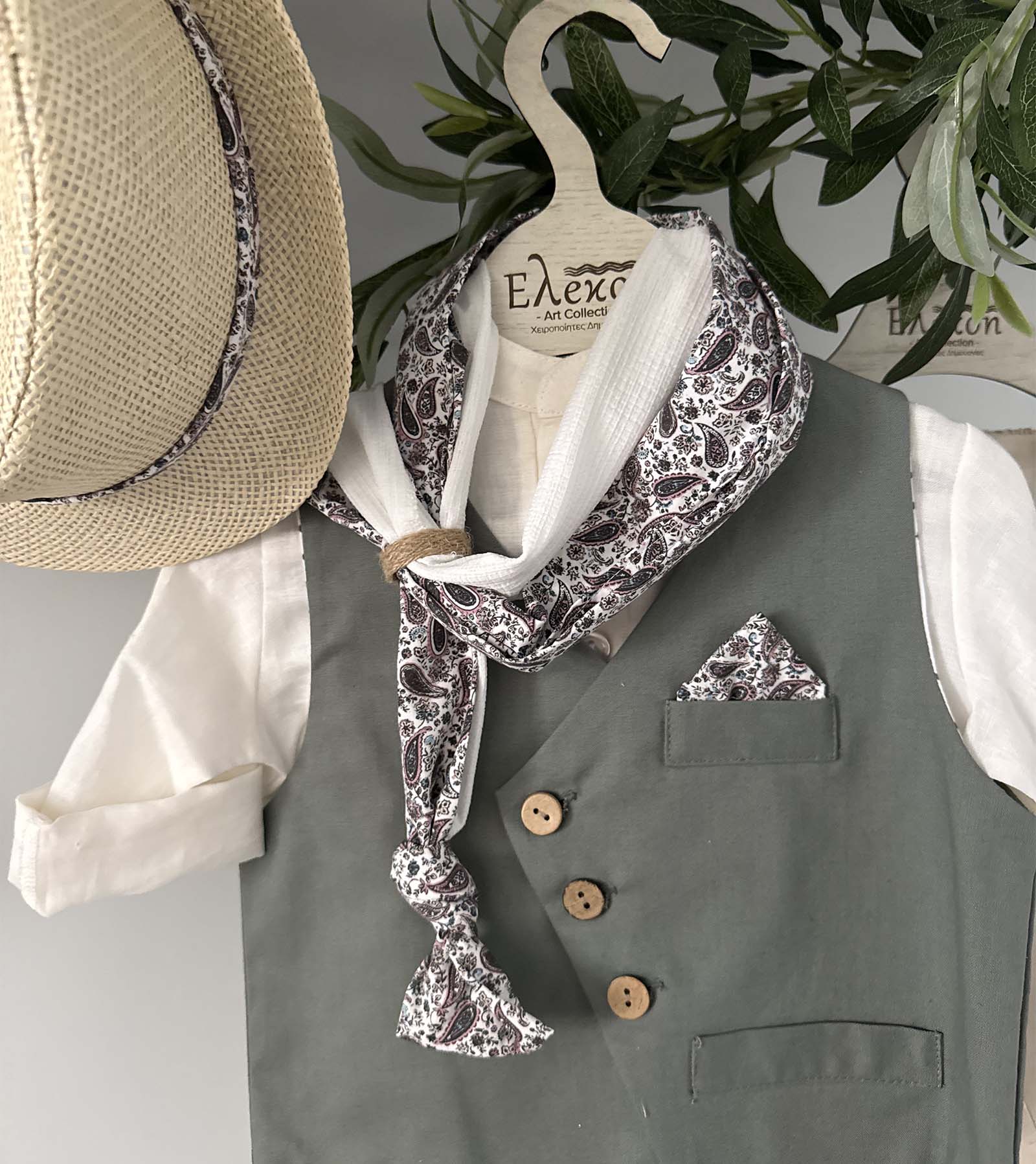 Κομψό παιδικό σύνολο που συνδυάζει διαχρονικό στυλ και άνεση, ιδανικό για βάπτιση ή ιδιαίτερες περιστάσεις. Το σετ αποτελείται από εκρού πουκαμίσα, γιλέκο σε λαδί απόχρωση, παντελόνι σε μπεζ τόνο με τιράντες, υφασμάτινο φουλάρι με κομψό μοτίβο και ψάθινο καπέλο που ολοκληρώνει την εμφάνιση.