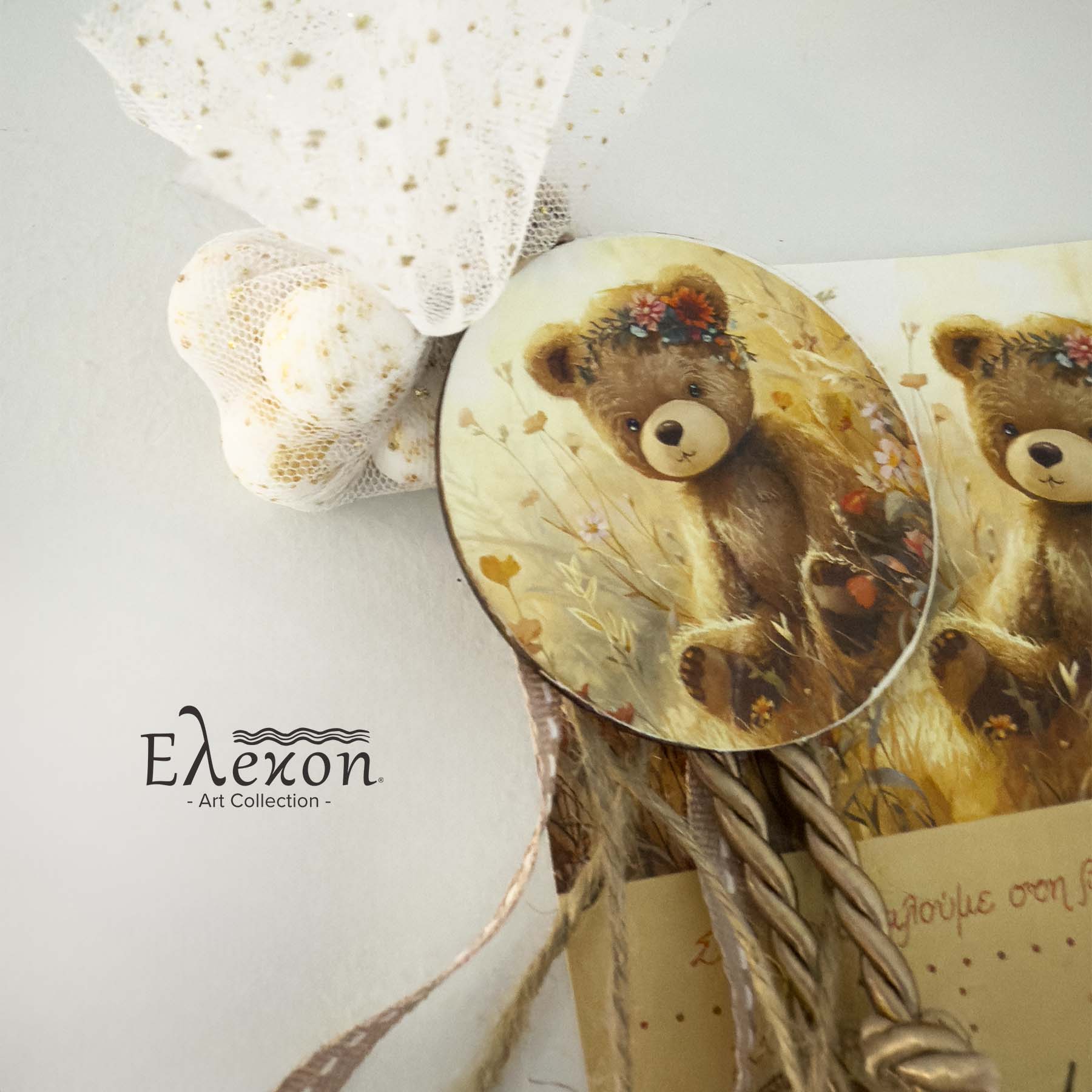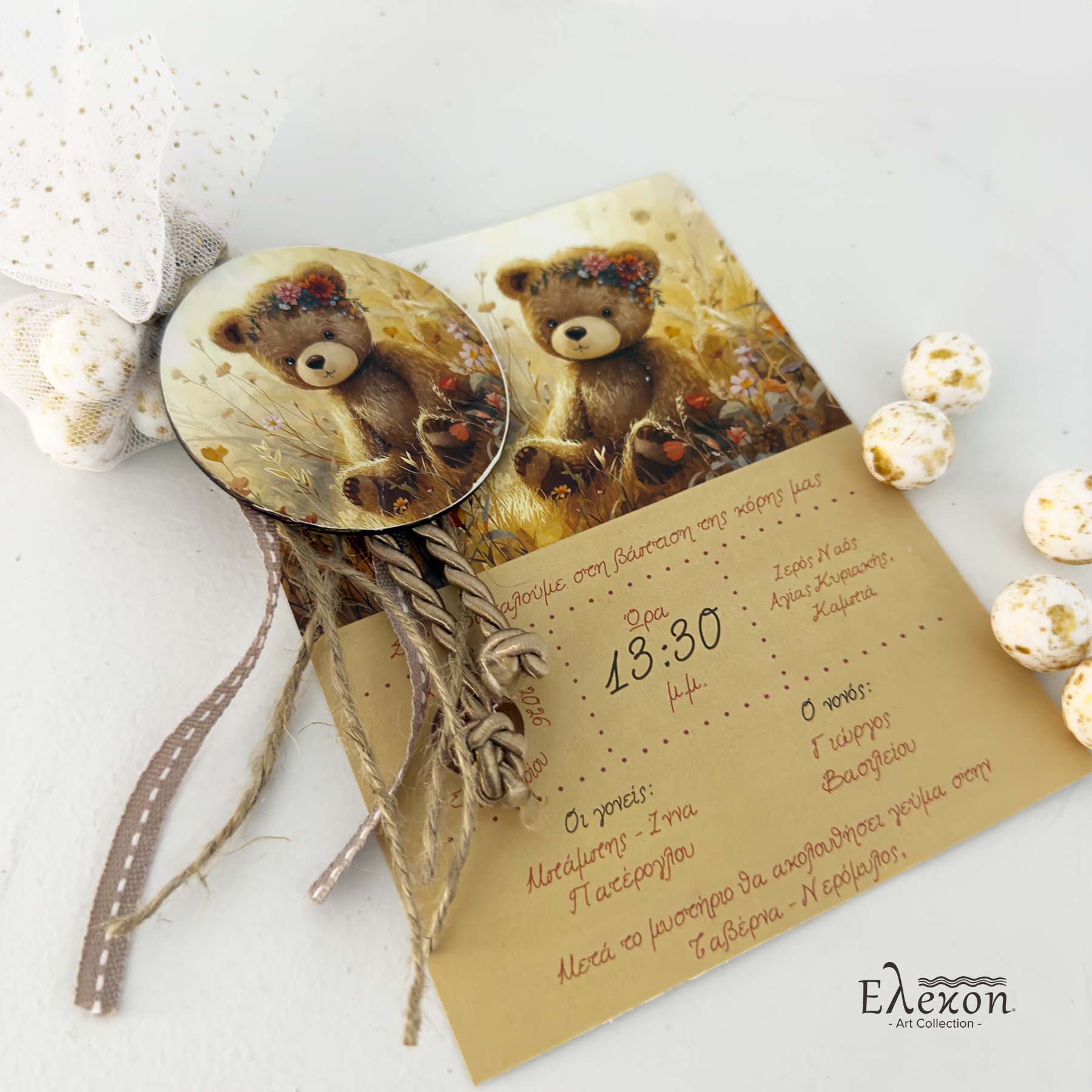 Μπομπονιέρα-προσκλητήριο με ξύλινο μαγνητάκι boho αρκουδάκι