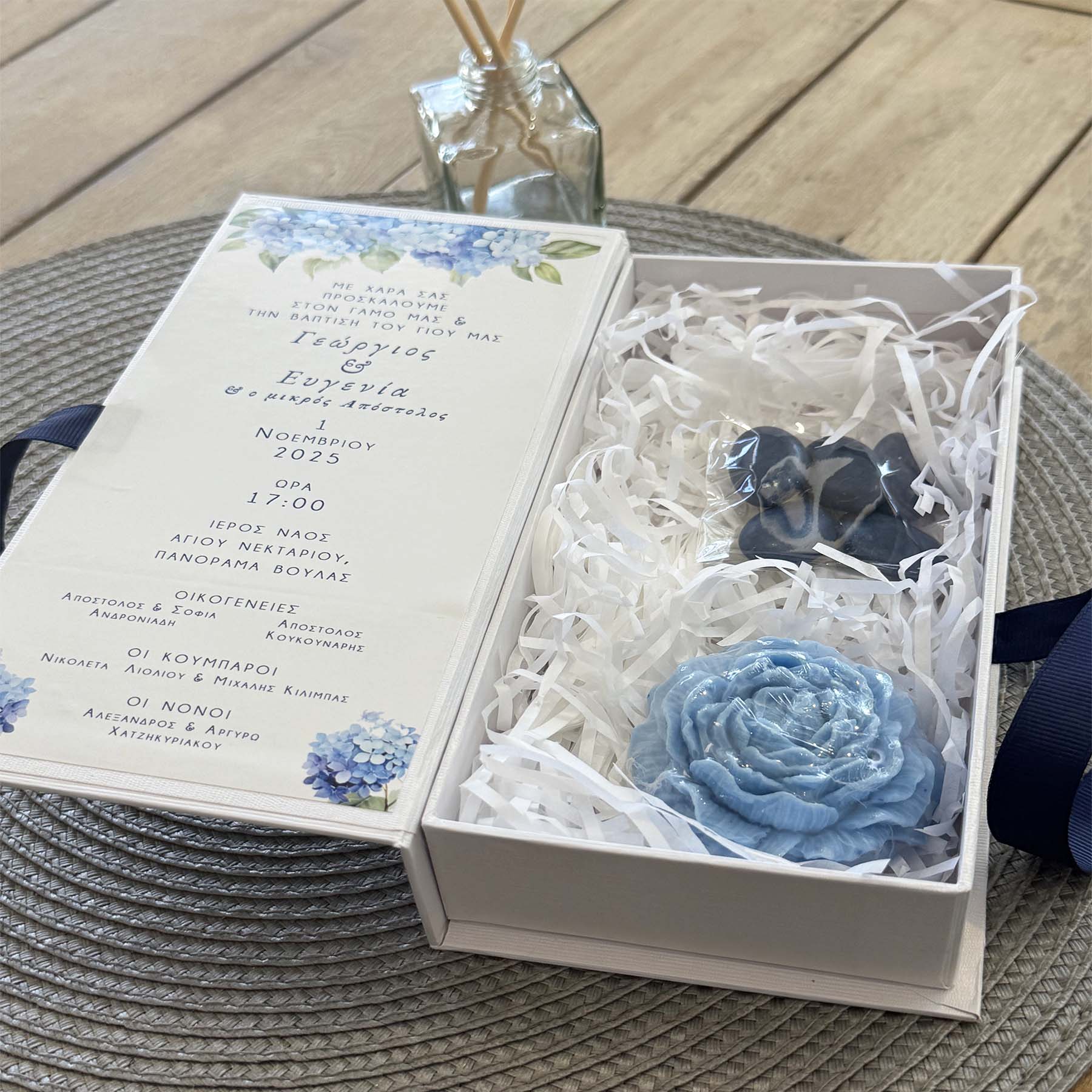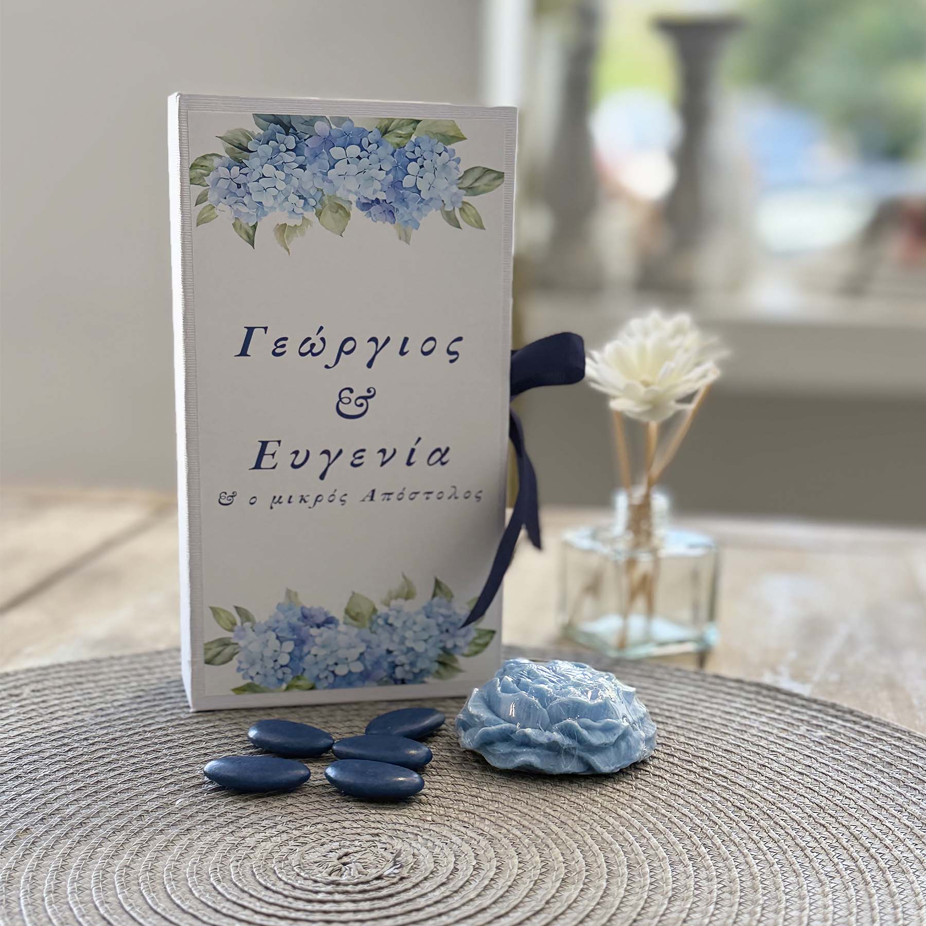 Συμπεριλαμβάνονται 5 κουφέτα “Χατζηγιαννάκης” bijoux μπλε μαρέν