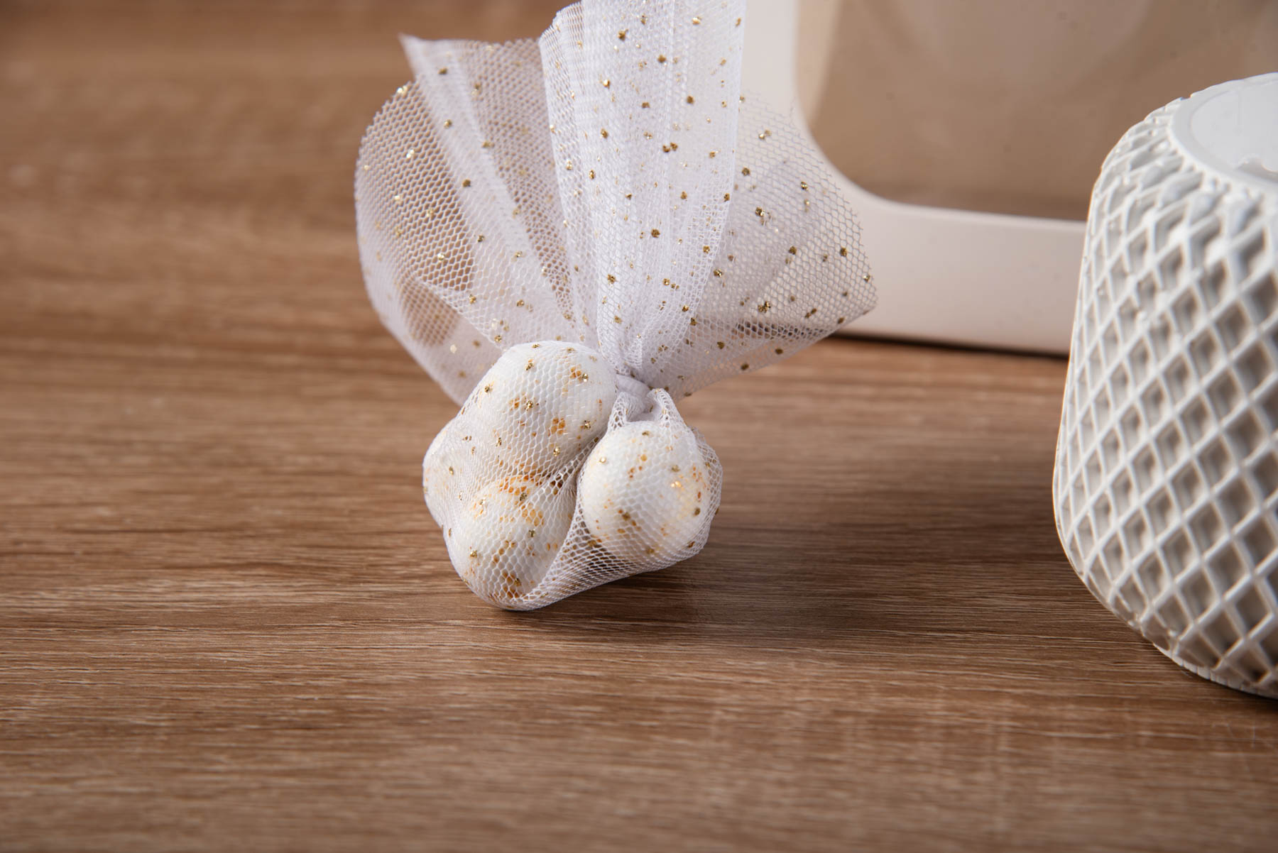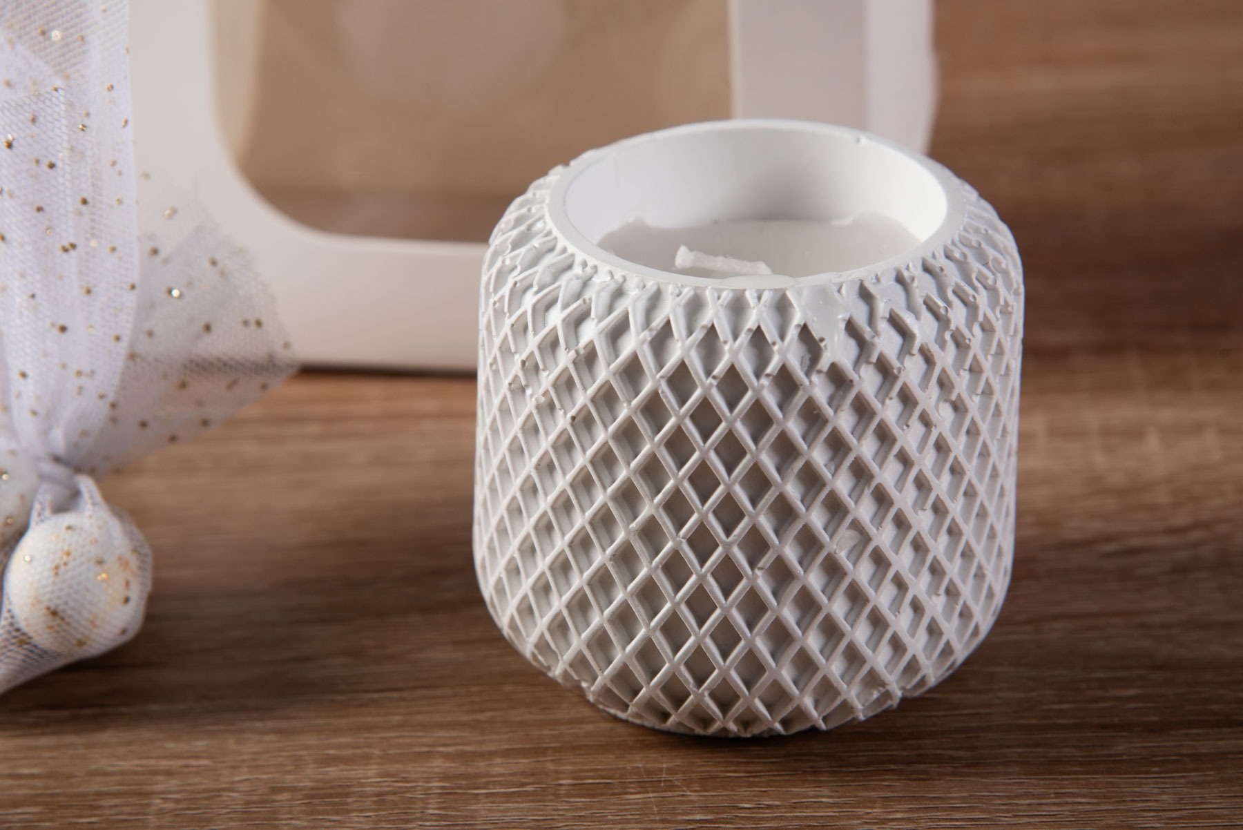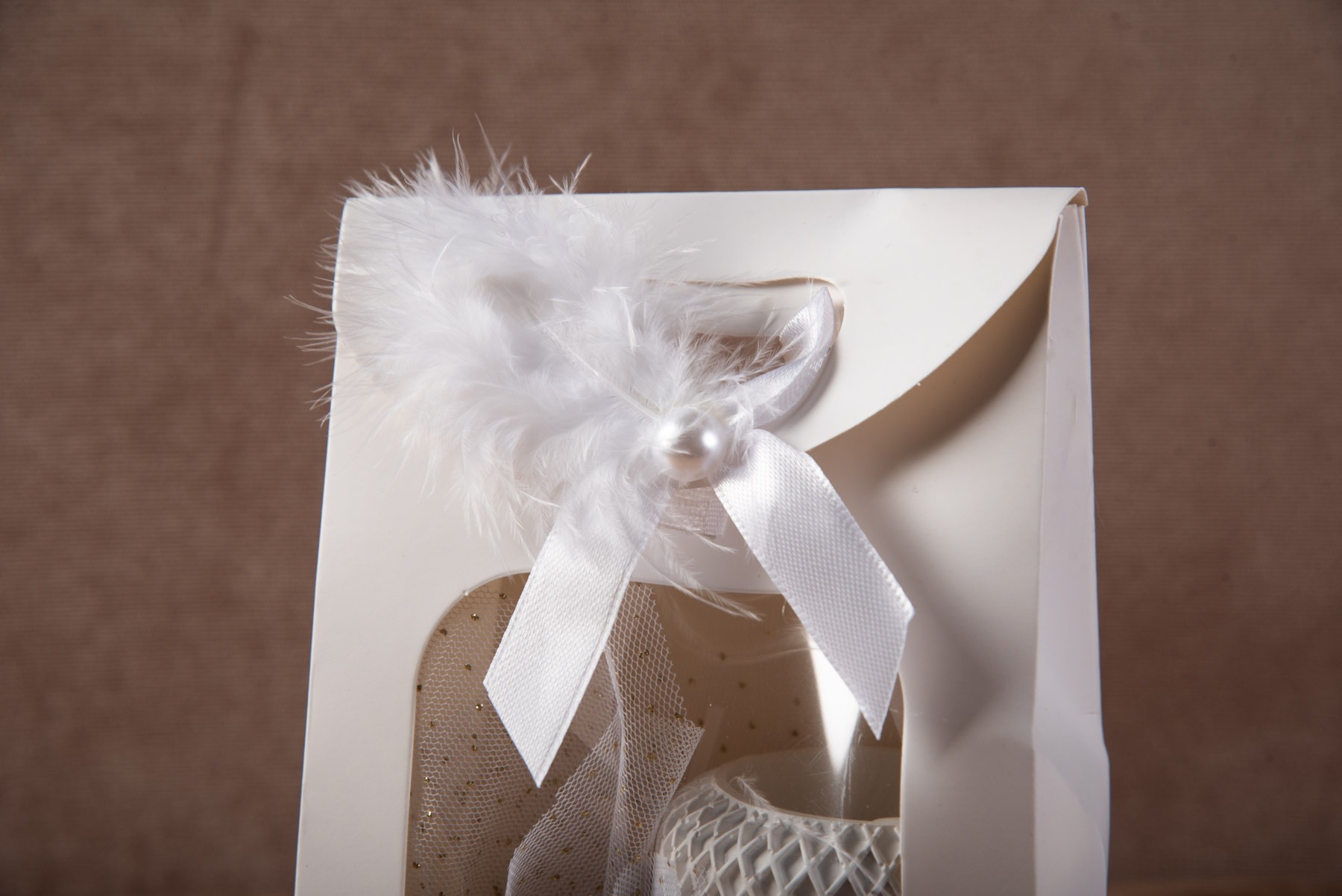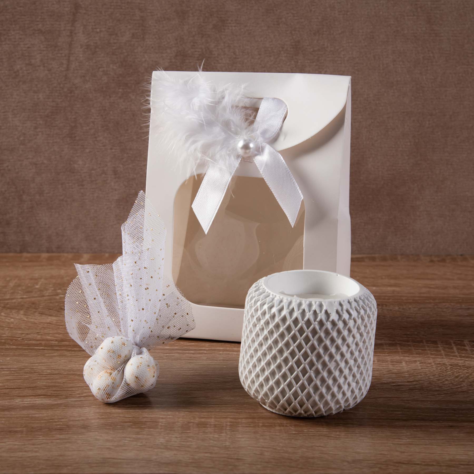 Μπομπονιέρα αρωματικό κερί σε γύψινο δοχείο χρώματος λευκό. Συσκευασμένο σε λευκό χάρτινο σακουλάκι διακοσμημένο με κορδέλα λευκή φτερό και πέρλα