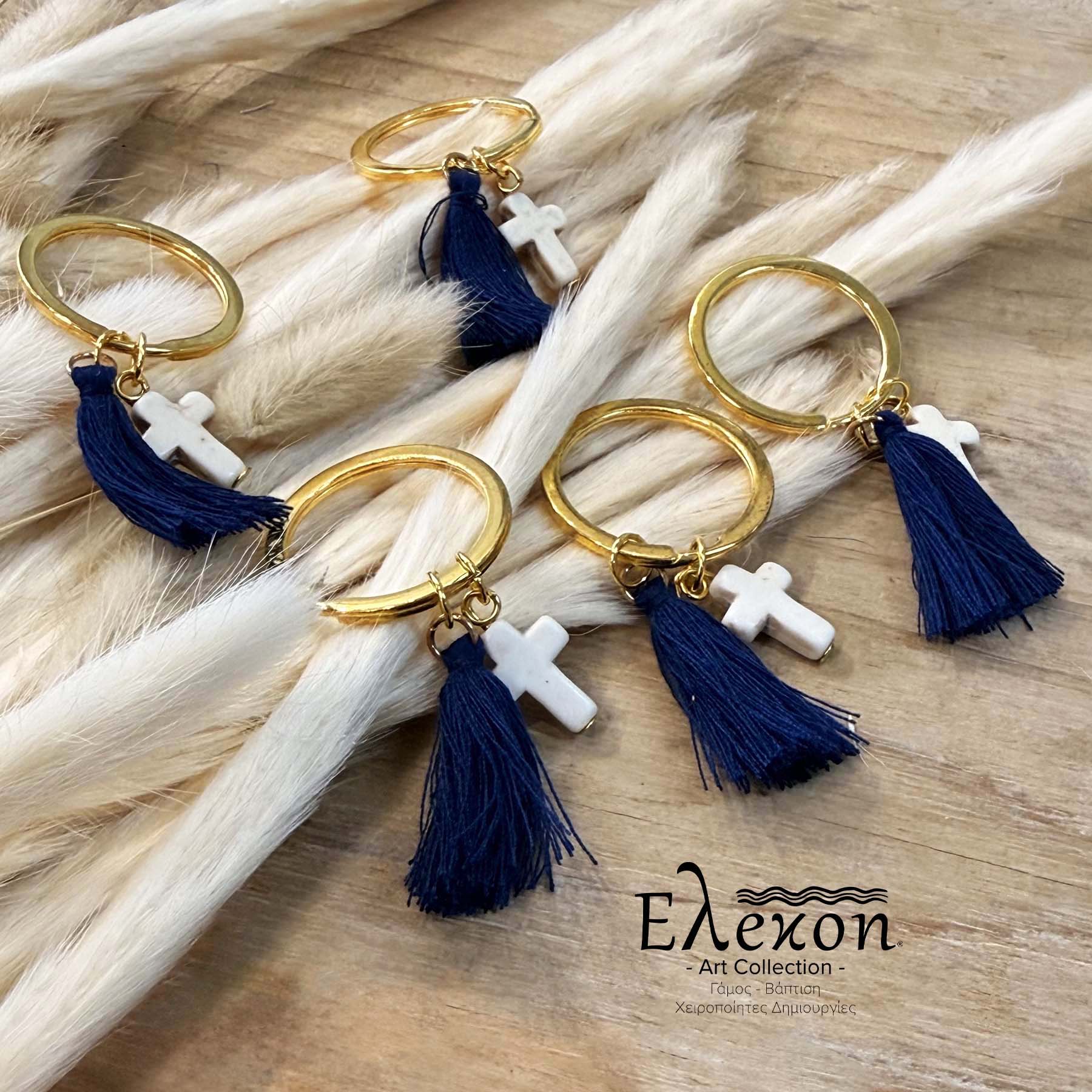Μαρτυρικά Βάπτισης μπρελόκ χρυσό με λευκό Σταυρουδάκι και μπλε φουντίτσα