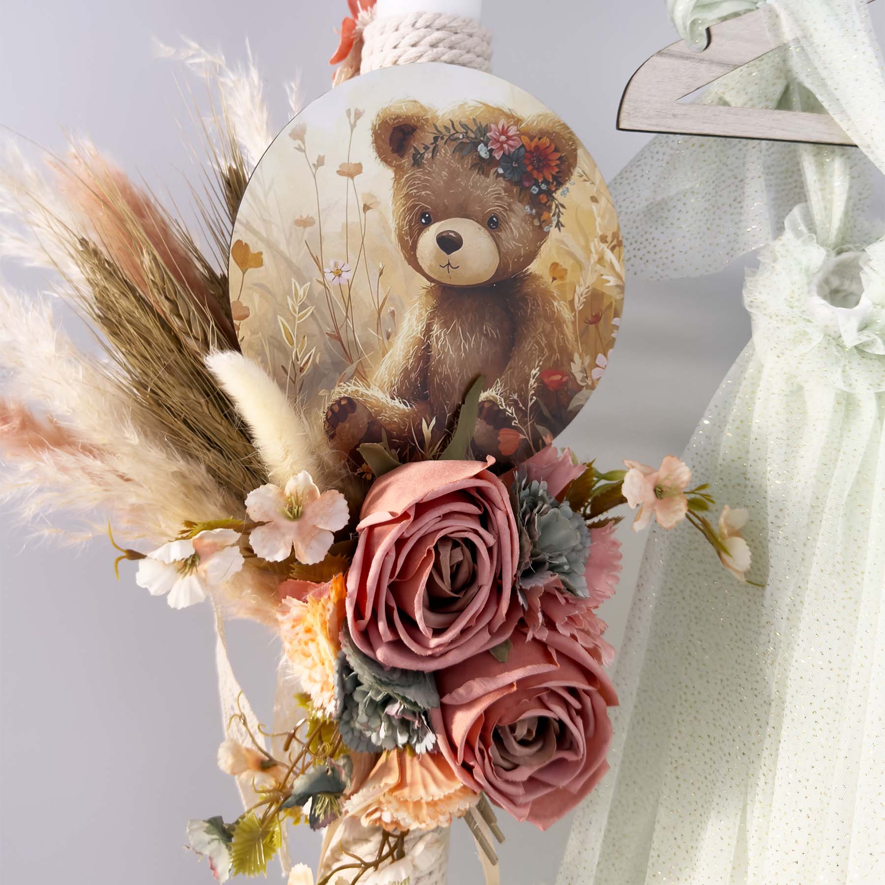 •Λαμπάδα Βάπτισης διακοσμημένη με ξύλινο τελαράκι στρόγγυλο boho αρκουδάκι και λούλουδια