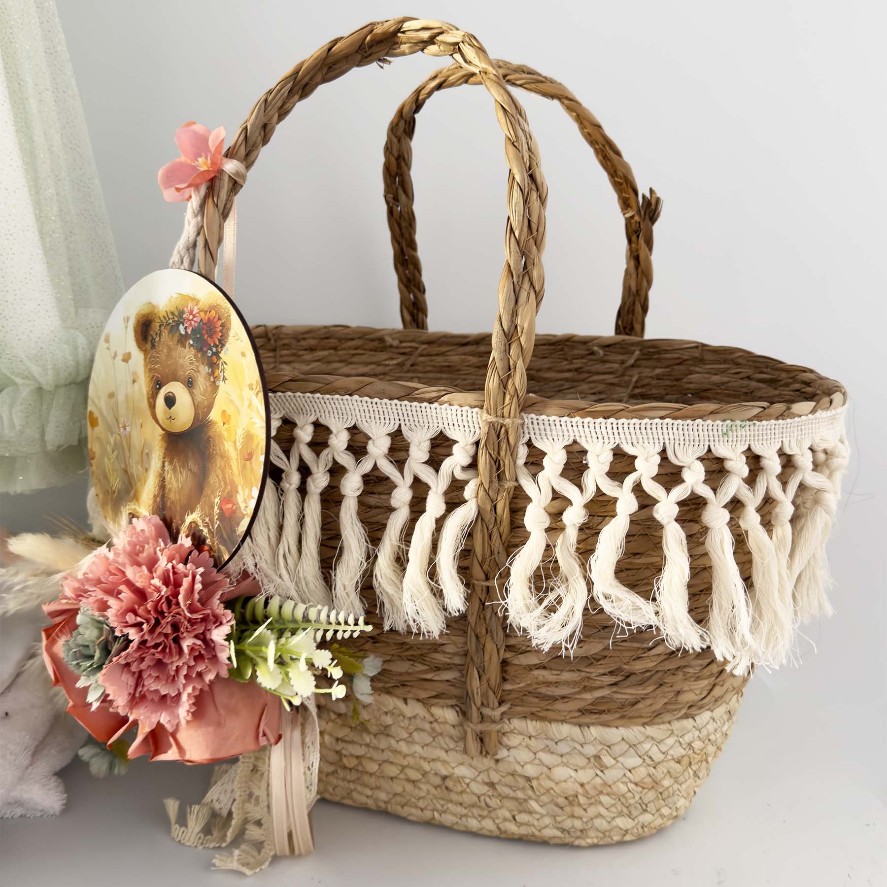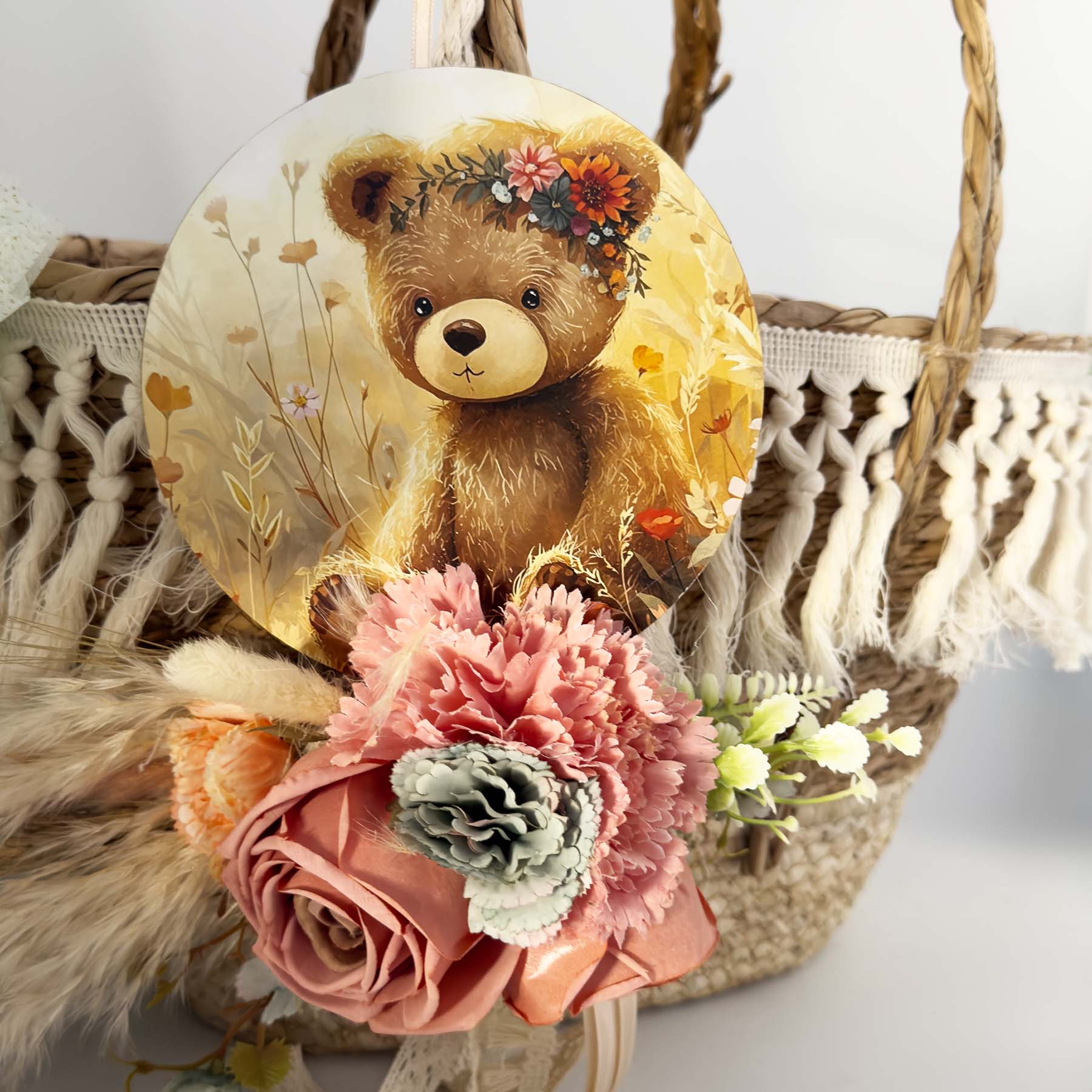 •Ψάθινο καλάθι διακοσμημένο με ξύλινο τελαράκι στρόγγυλο boho αρκουδάκι και λούλουδια