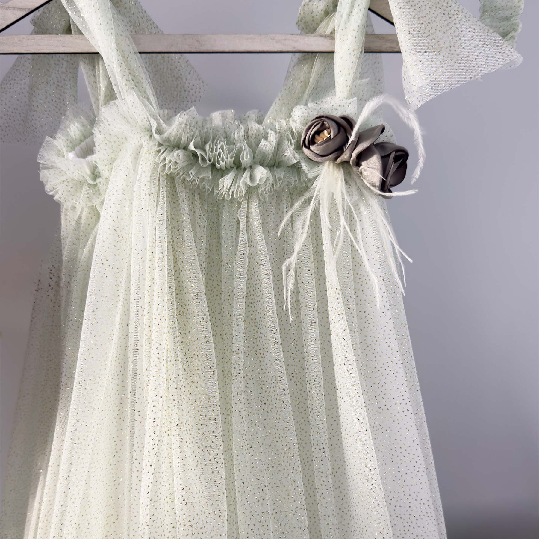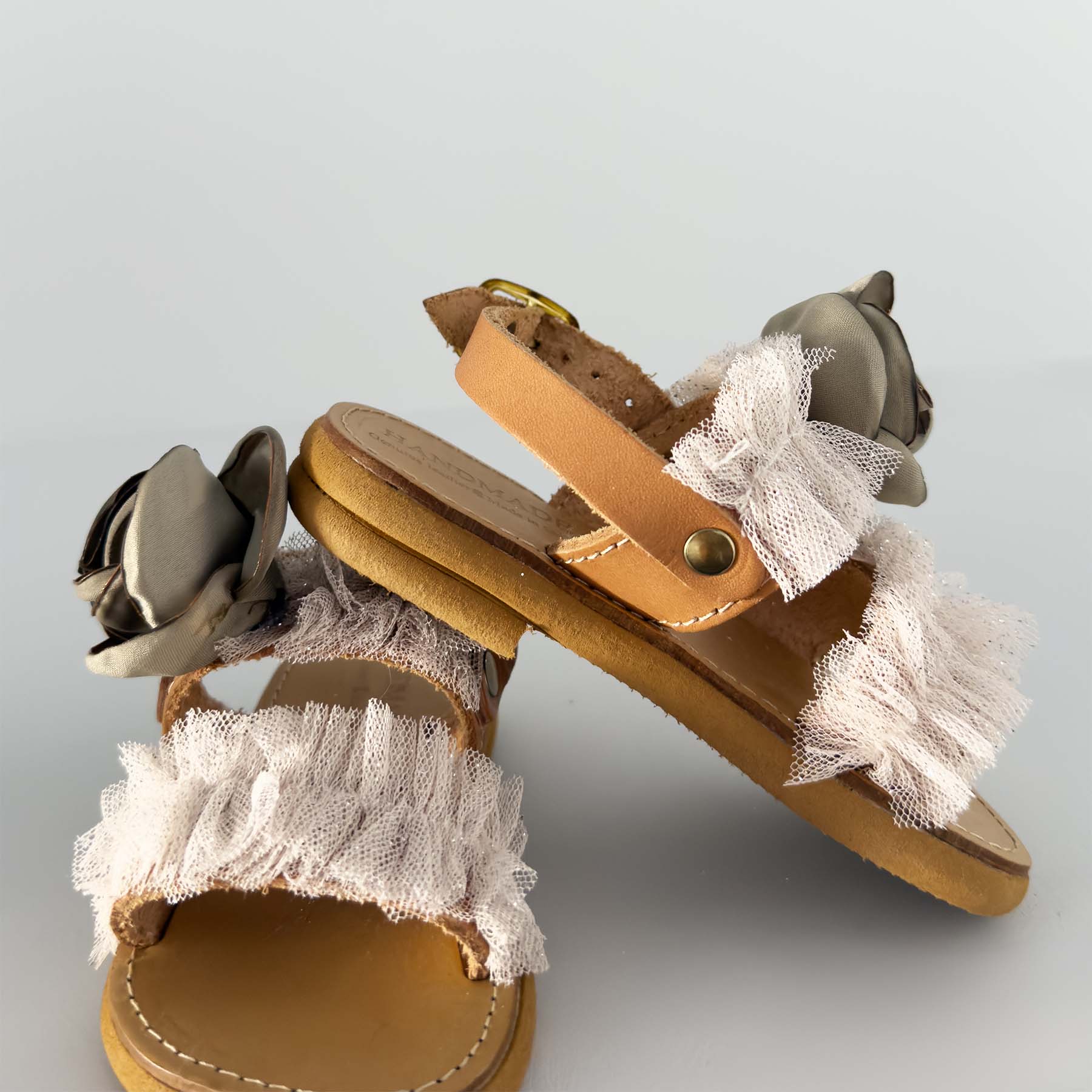 •Πέδιλα δερμάτινα χειροποίητα με λευκό τούλι και λαδί λουλουδάκι