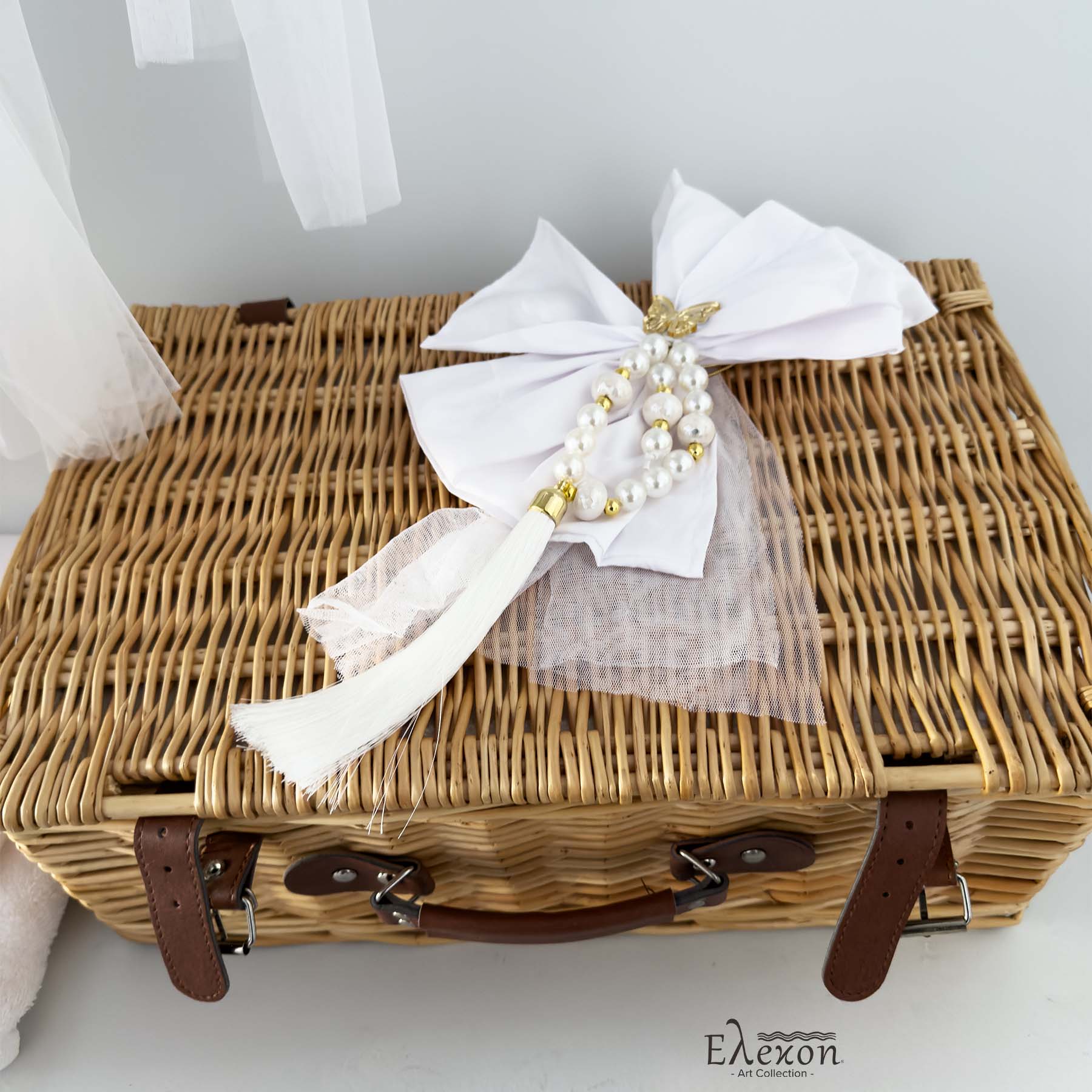 •Βαλίτσα ψάθινη διακοσμημένη με λευκό ύφασμα , χάντρες και χρυσή plexiglass πεταλούδα