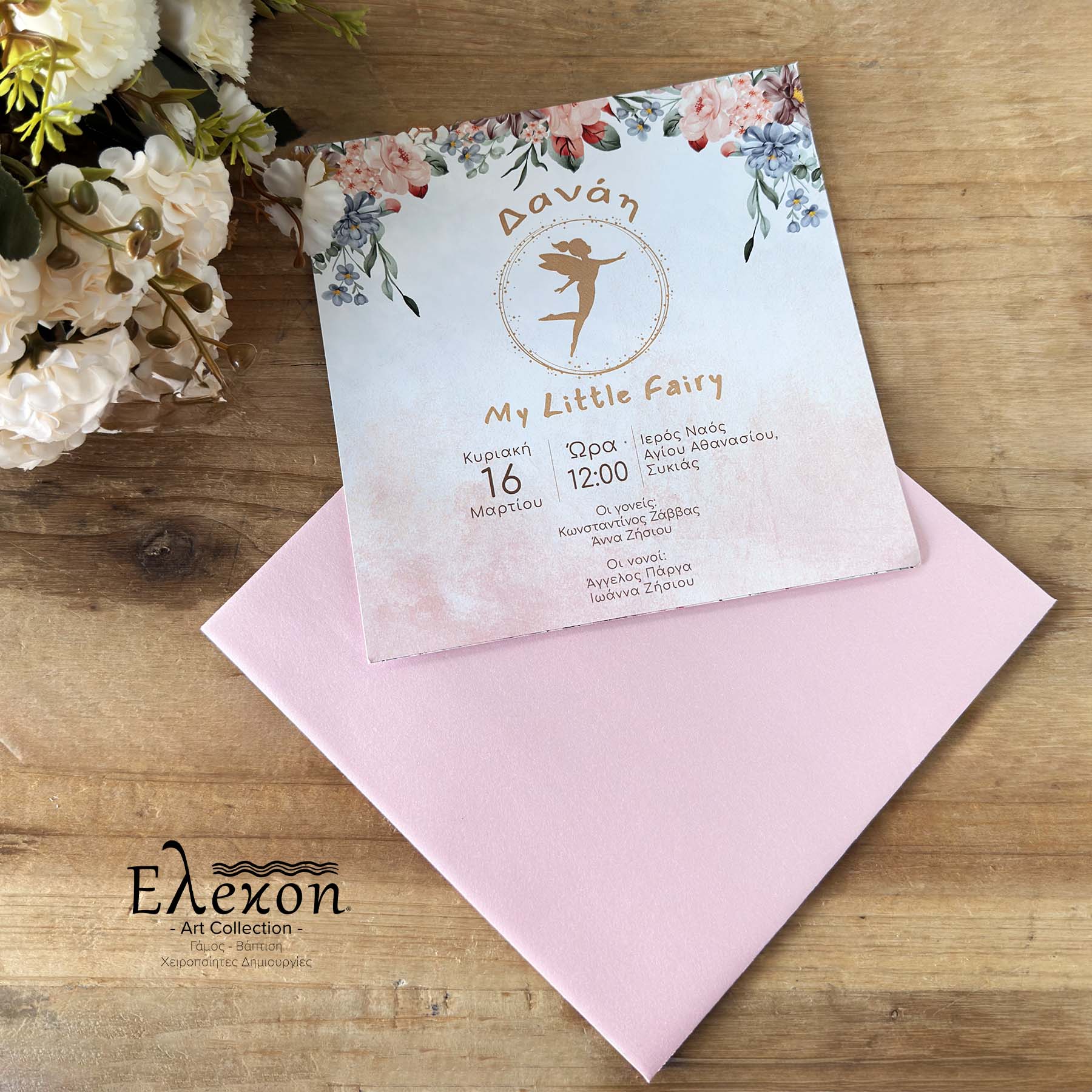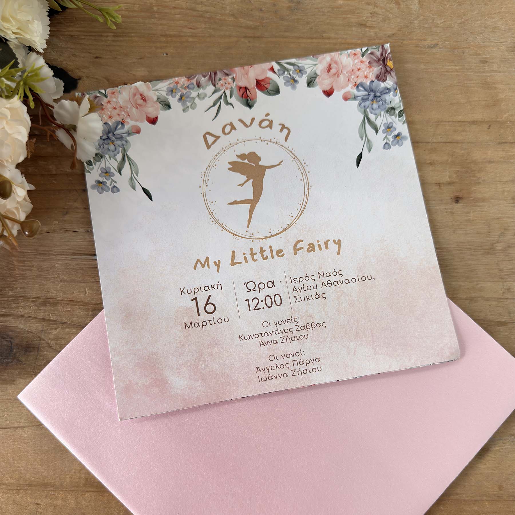 Προσκλητήριο Βάπτισης με θέμα Boho νεράιδα (15cm X 15cm) Σε φάκελο ροζ