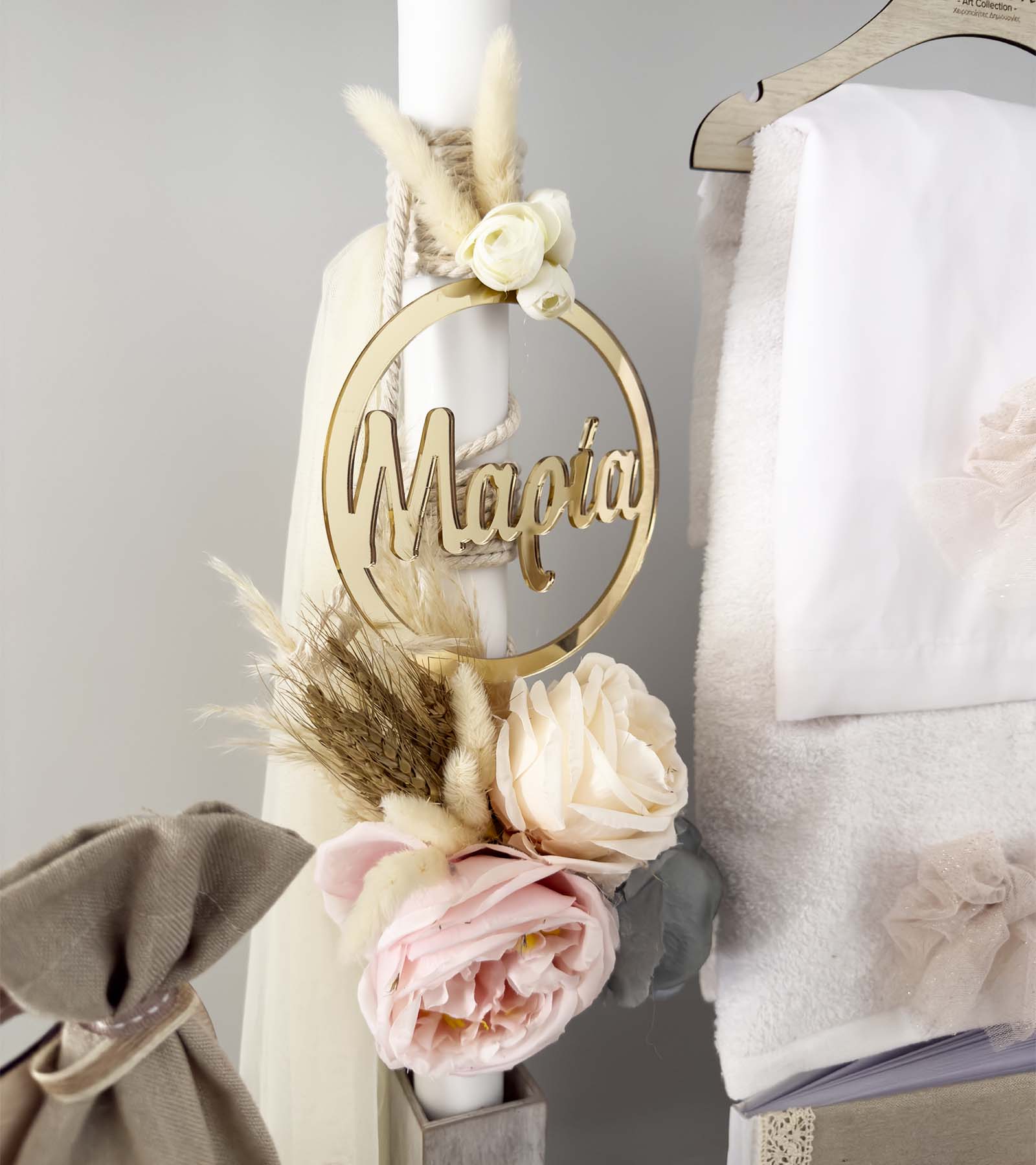 •Λαμπάδα Βάπτισης διακοσμημένη με χρυσό plexiglass ονομα , λουλούδια και pampas