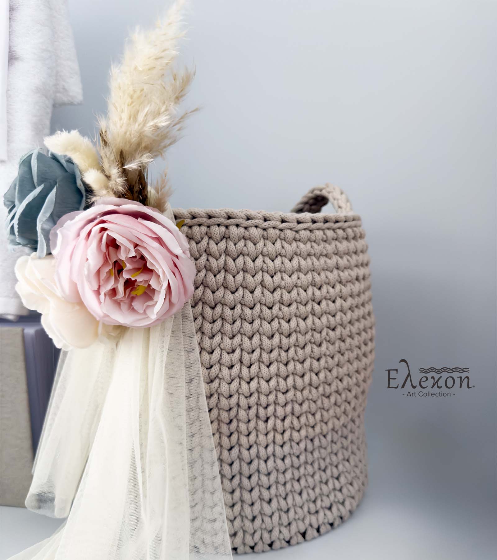 •Χειροποίητο πλεκτό καλάθι χρώματος μπεζ διακοσμημένο με λουλούδια και pampas