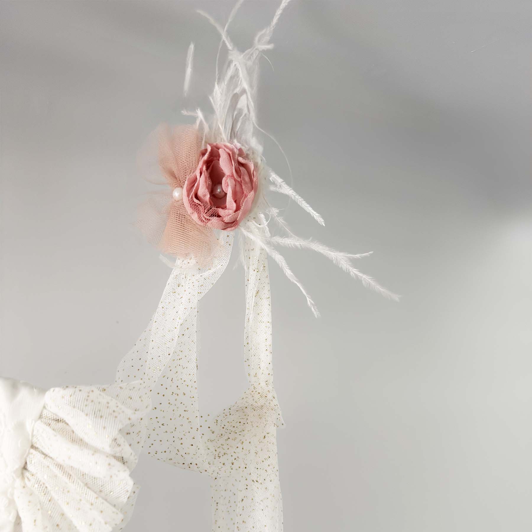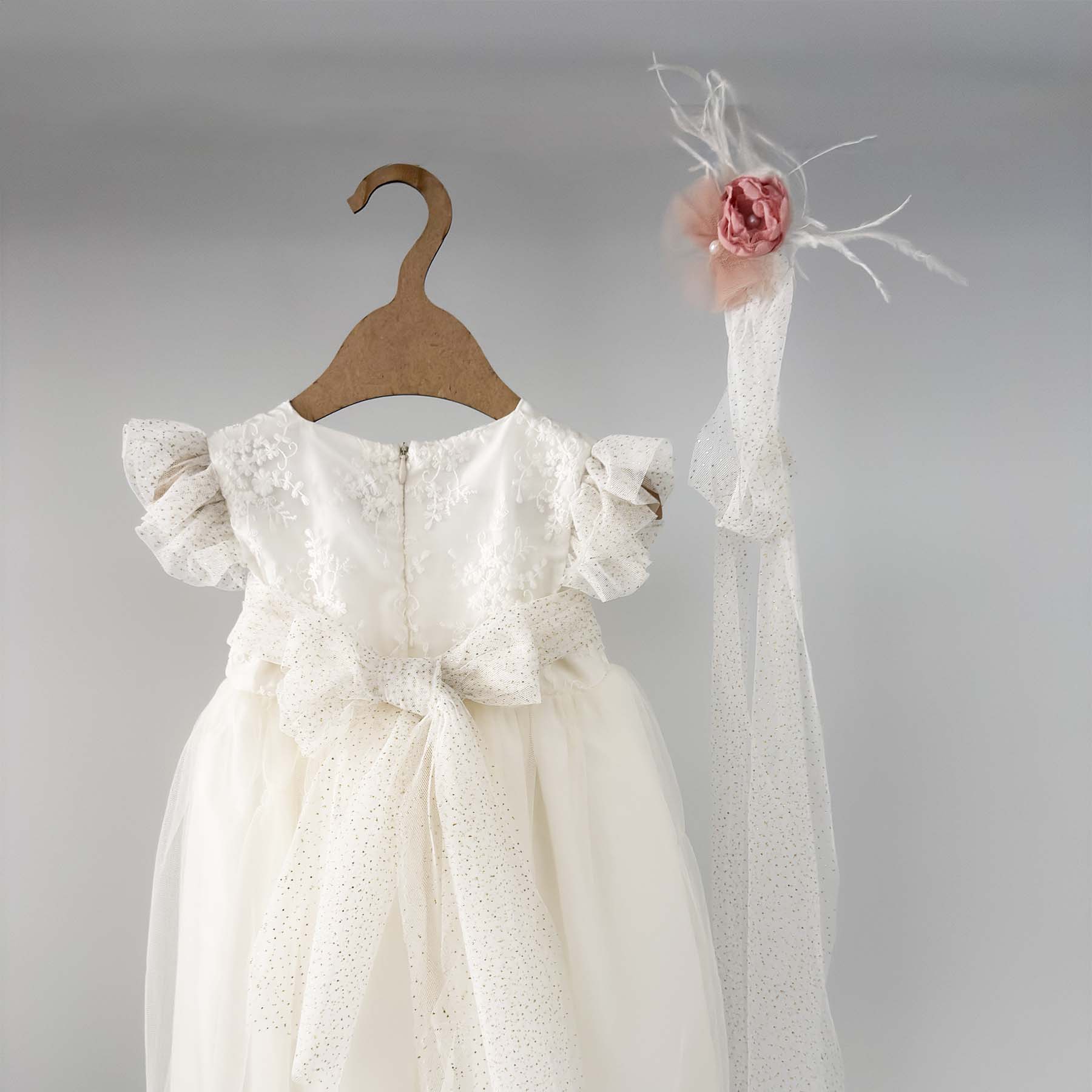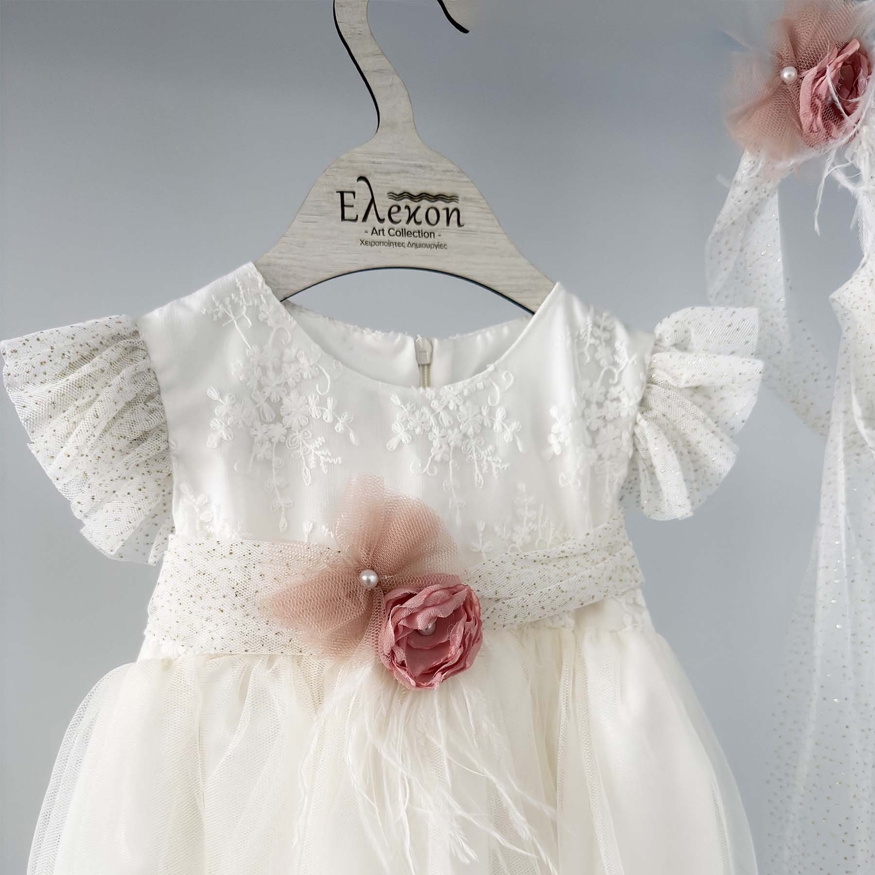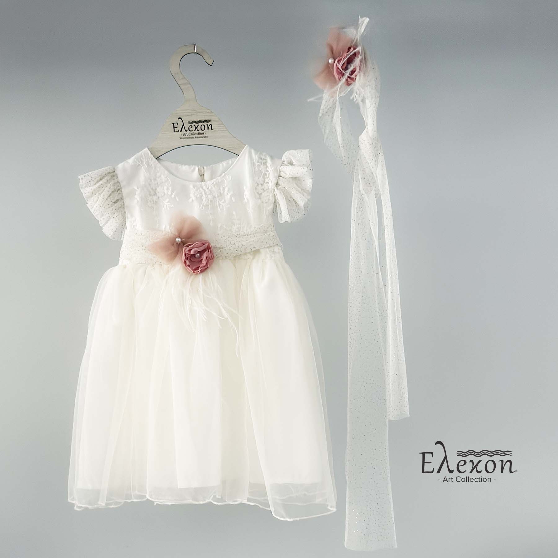 Βαπτιστικό φορέμα Elekon Art χρώματος εκρού με τούλι glitter διακοσμημένο ζώνη glitter χειροποίητα λουλούδια σε dusty pink λουλουδάκια και μανίκια