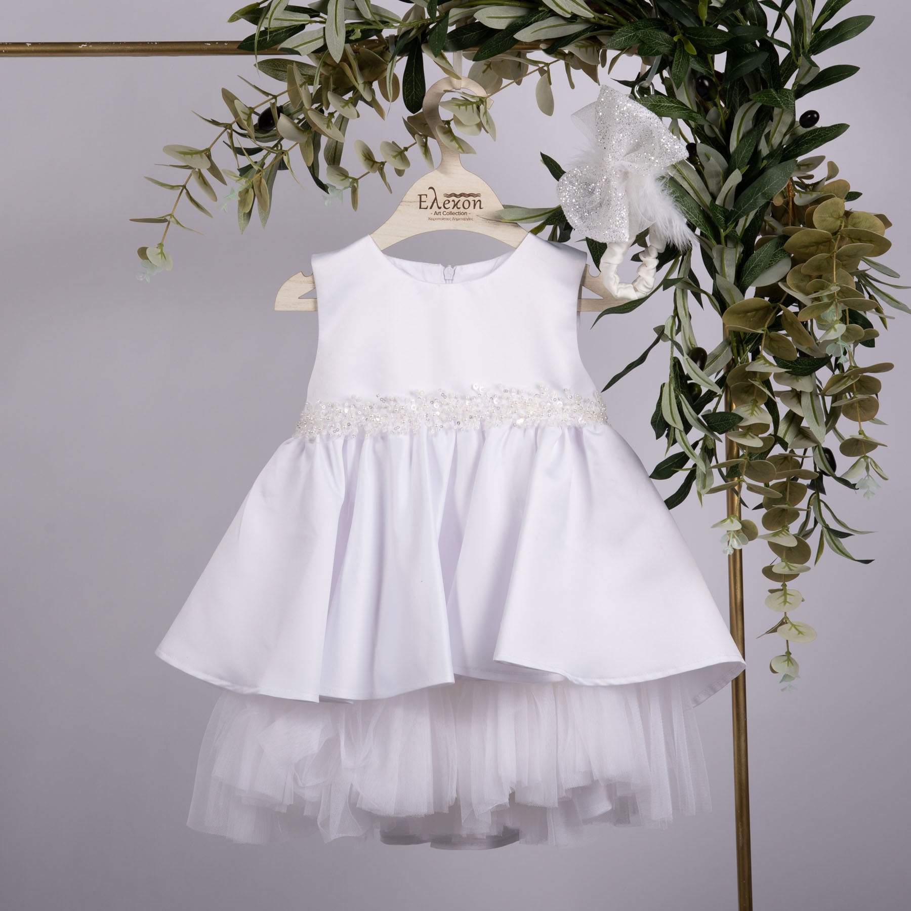 Βαπτιστικό φόρεμα Elekon Art λευκό ρασμίρ διακοσμημένο με ζωνούλα από πέρλες και πούλιες λευκές . Συνοδεύεται από χειροποίητη κορδέλα λευκή