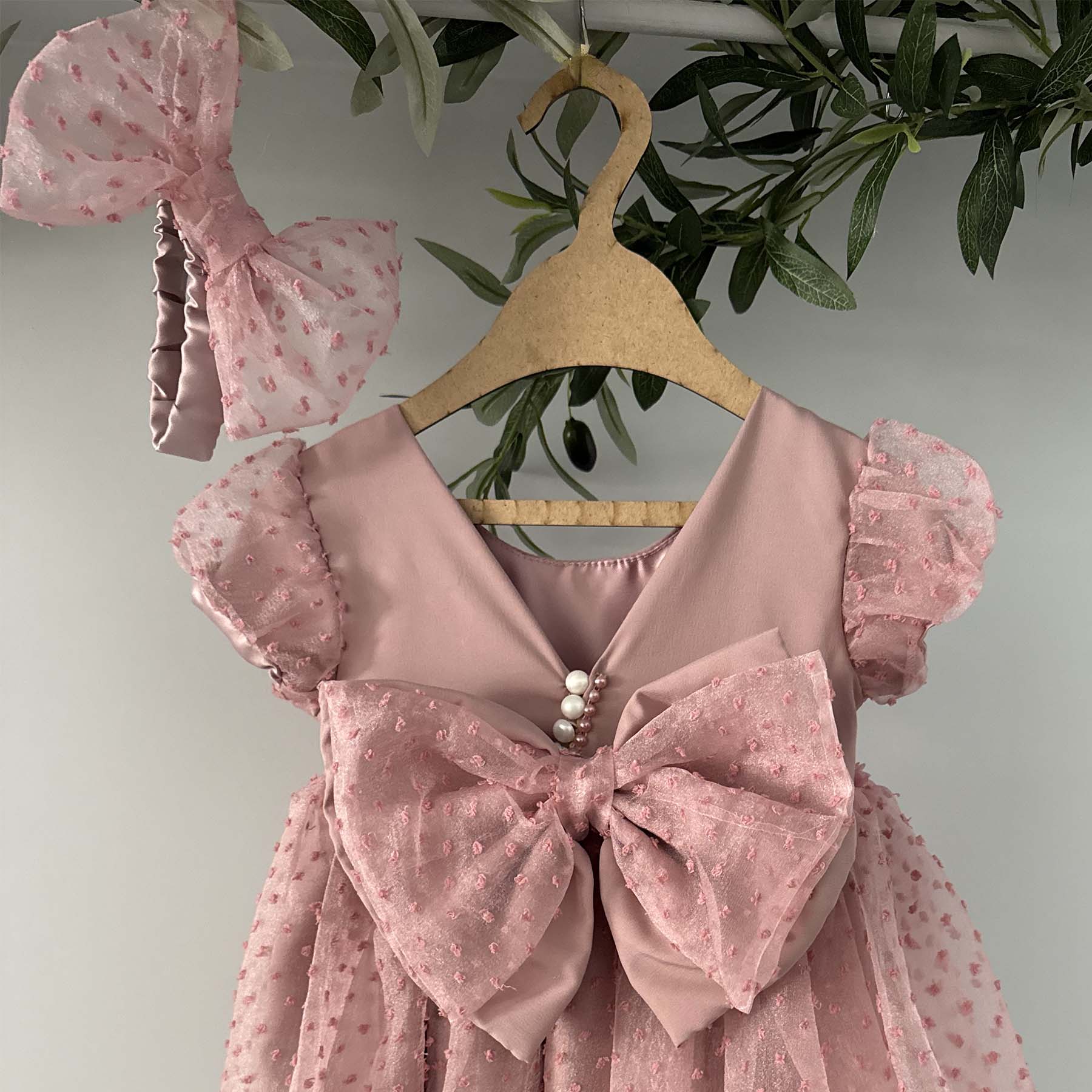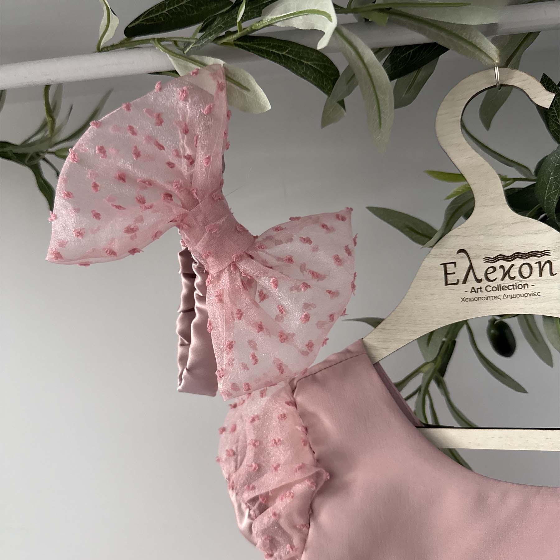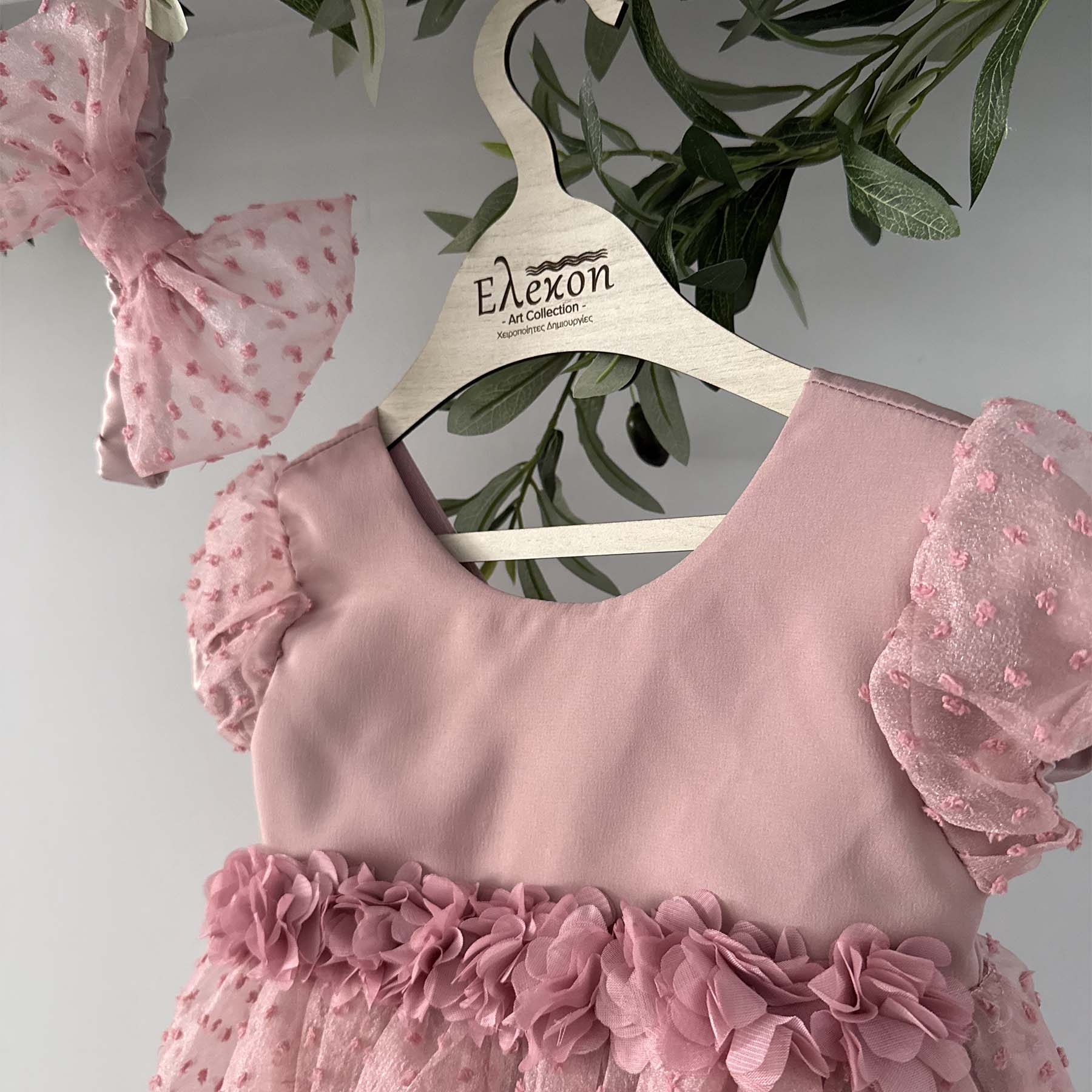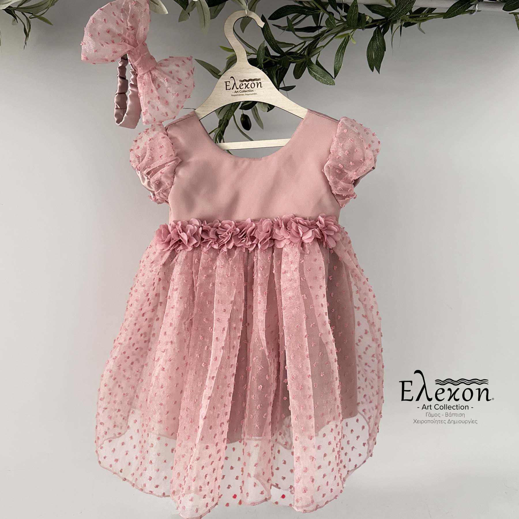 Βαπτιστικό φορέμα Elekon Art χρώματος dusty pink με τούλι , διακοσμημένο με λουλουδάκια dusty pink στη ζώνη . Συνοδεύεται από χειροποίητη κορδέλα ασορτί