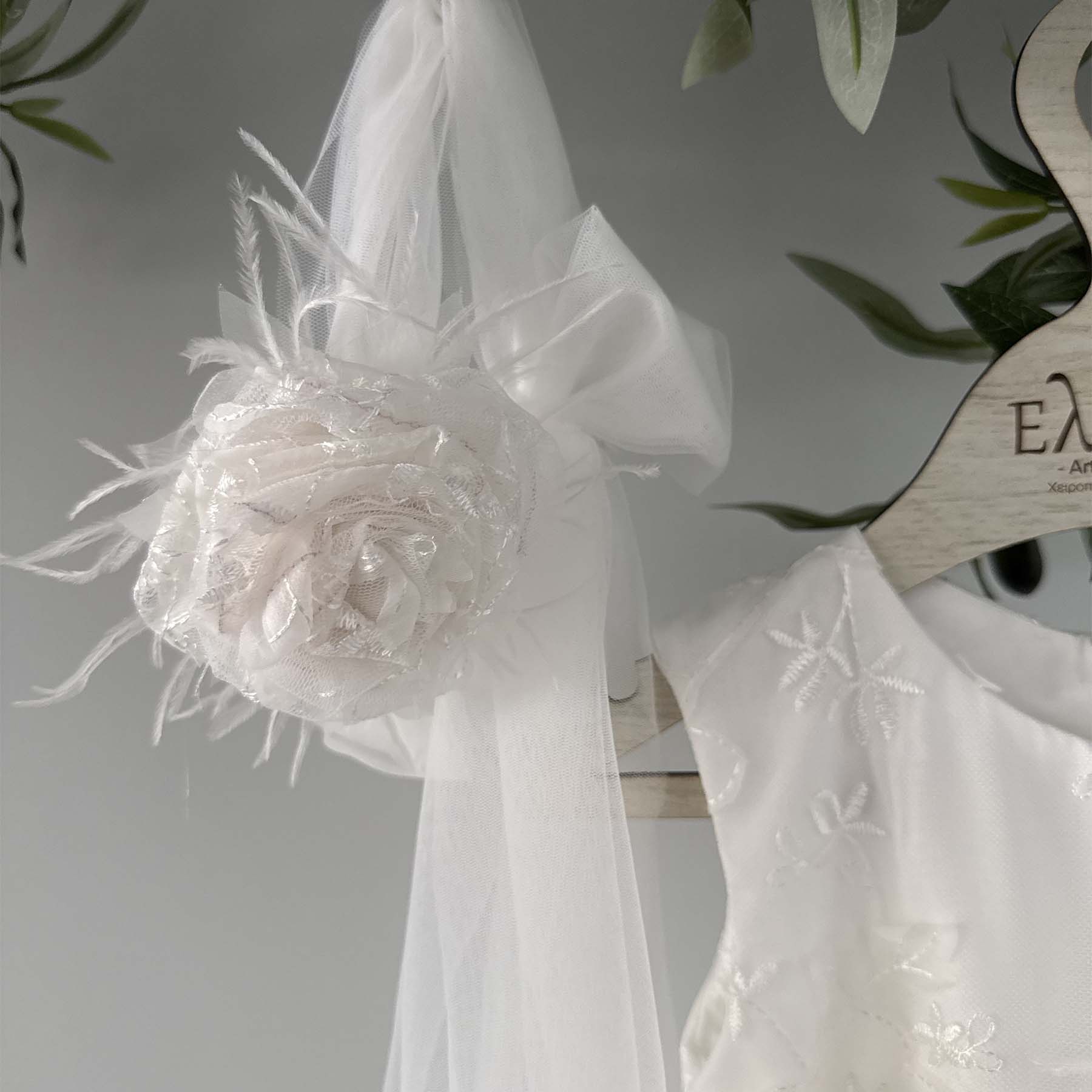 Η φούστα είναι πλούσια και αέρινη, χαρίζοντας όμορφη κίνηση και κομψότητα. Το σύνολο συνοδεύεται από ασορτί κορδέλα μαλλιών με τούλι και λουλούδι, ολοκληρώνοντας ένα ρομαντικό βαπτιστικό look.